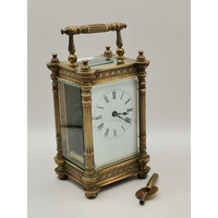 Antique French Brass Carriage Clock makers mark to back E.M & Co with key white enameled face with Roman Numerals and name Hamilton & Inches H18cm (to top of handle)