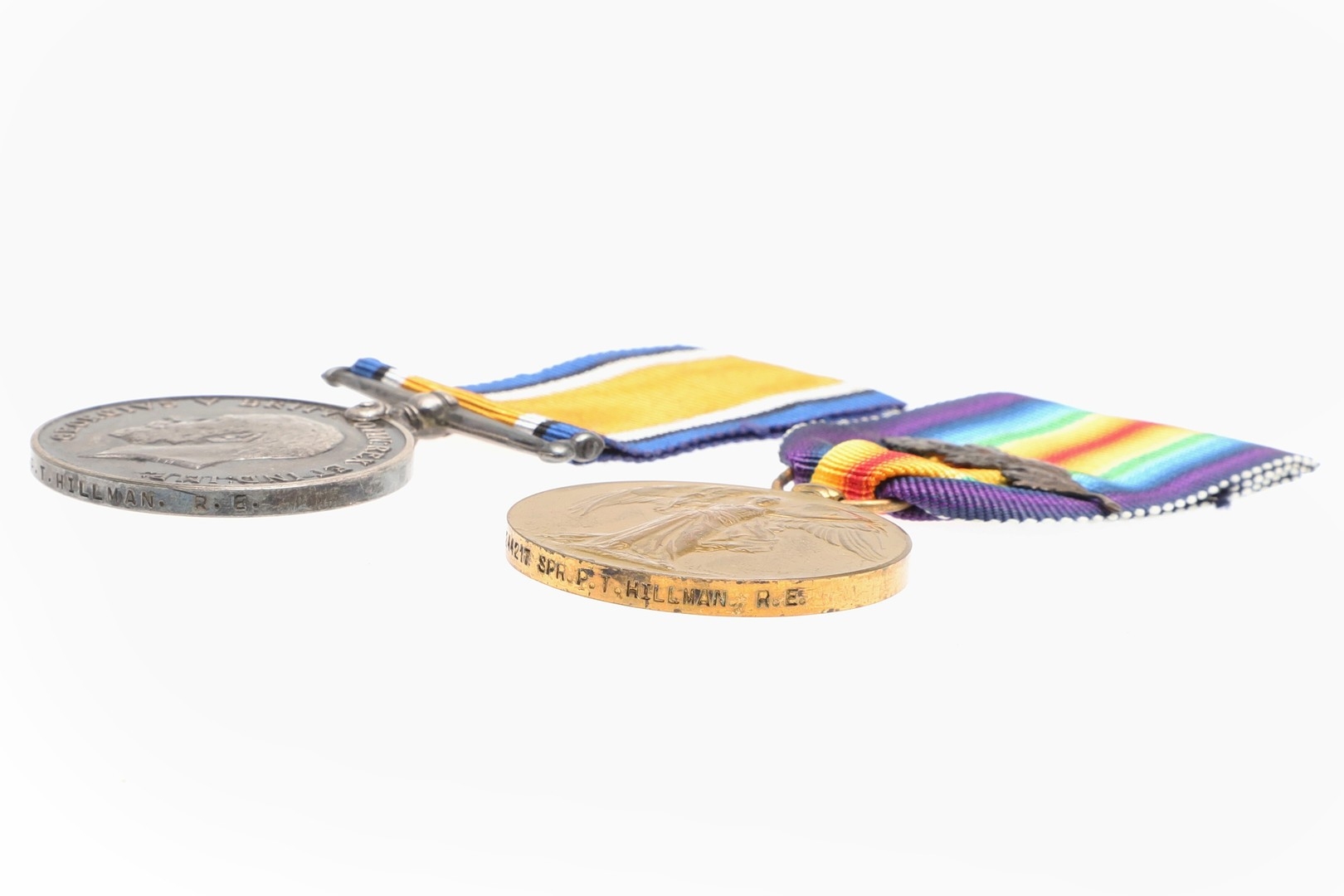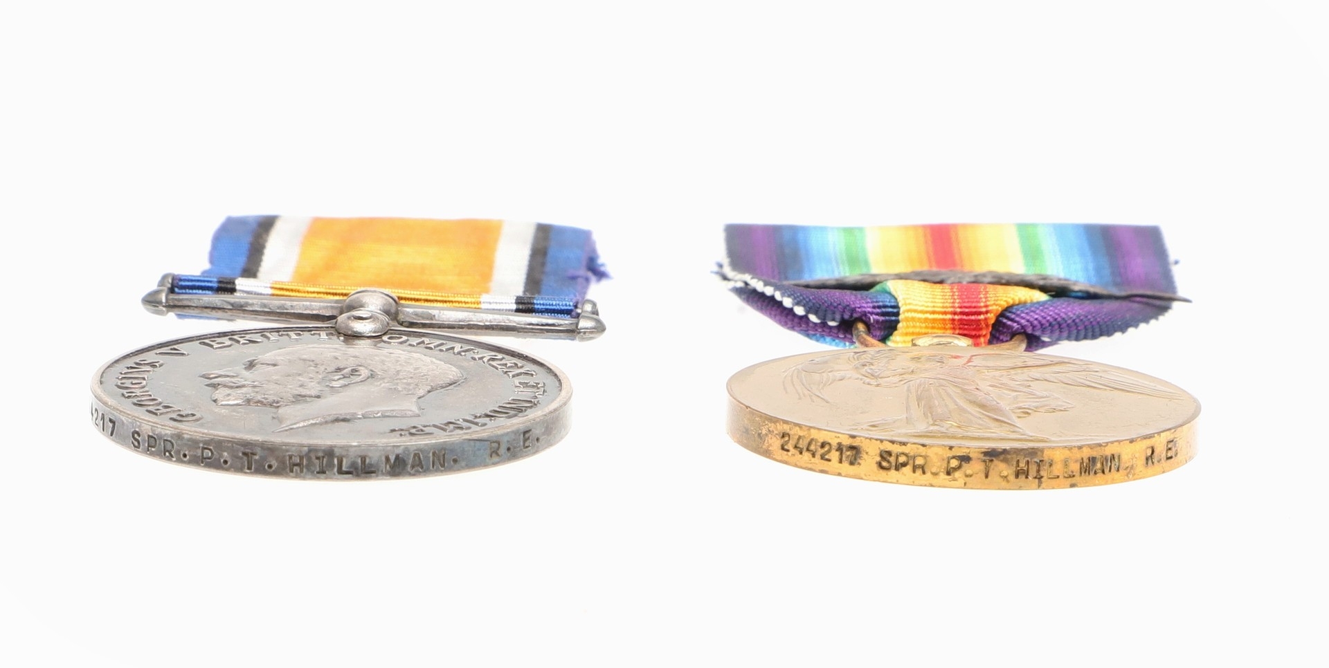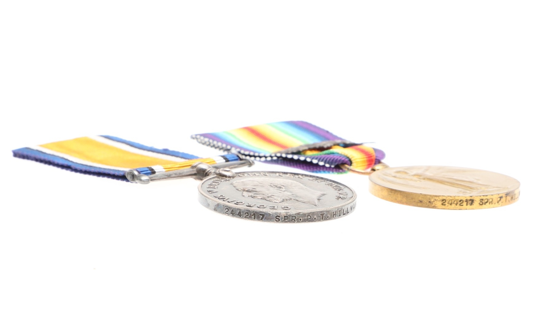 A FIRST WORLD WAR PAIR TO THE ROYAL ENGINEERS. A Great War pair comprising War Medal and Victory medal with mentioned in despatches oak leaf named to 244217 SPR P.T. HILLMAN R.E. Also a Home Guard enamelled lapel badge. Percy Tom Hillman served with the Royal Marines (Royal Naval Division Engineers) with number 5680 before transferring to the Royal Engineers. He was awarded the Mention in Despatches whilst Lance Corporal Acting Sergeant with the 248th Field Company. It was published in the Gazette on the 4th July 1919, 31437 p 8552. A Surveyor and draughtsman prior to the War, he enlisted at Plymouth on the 1st January 1916 at the age of 34, he was transferred to the Reserve on the 24th July 1919.