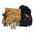 With CD and Warden badge, together with a collection of WWII ephemera to include a silk embroidered Royal Engineers pillow case, a Seaman’s Pocket book, June 1943 and a collection of military ephemera, jacket small.