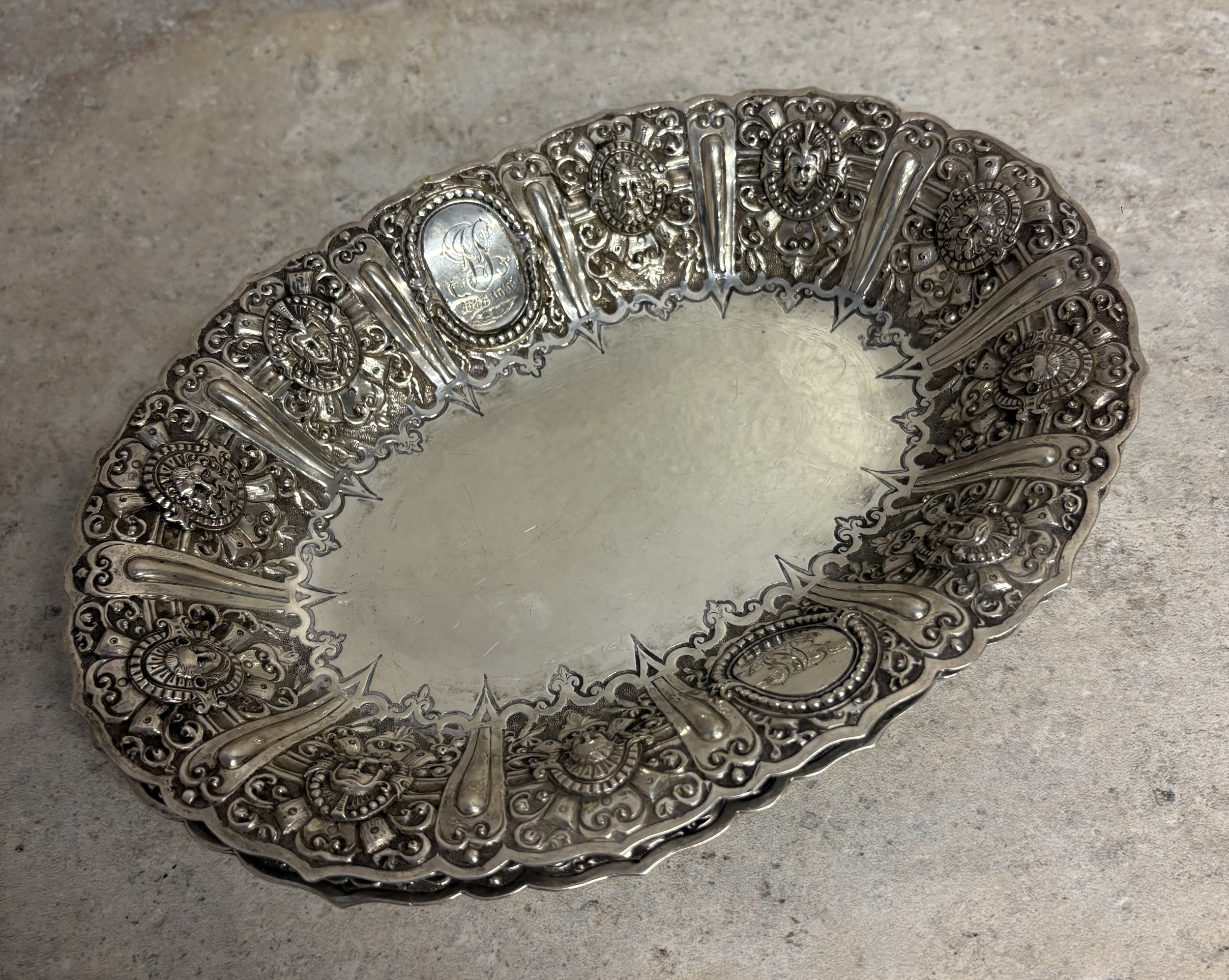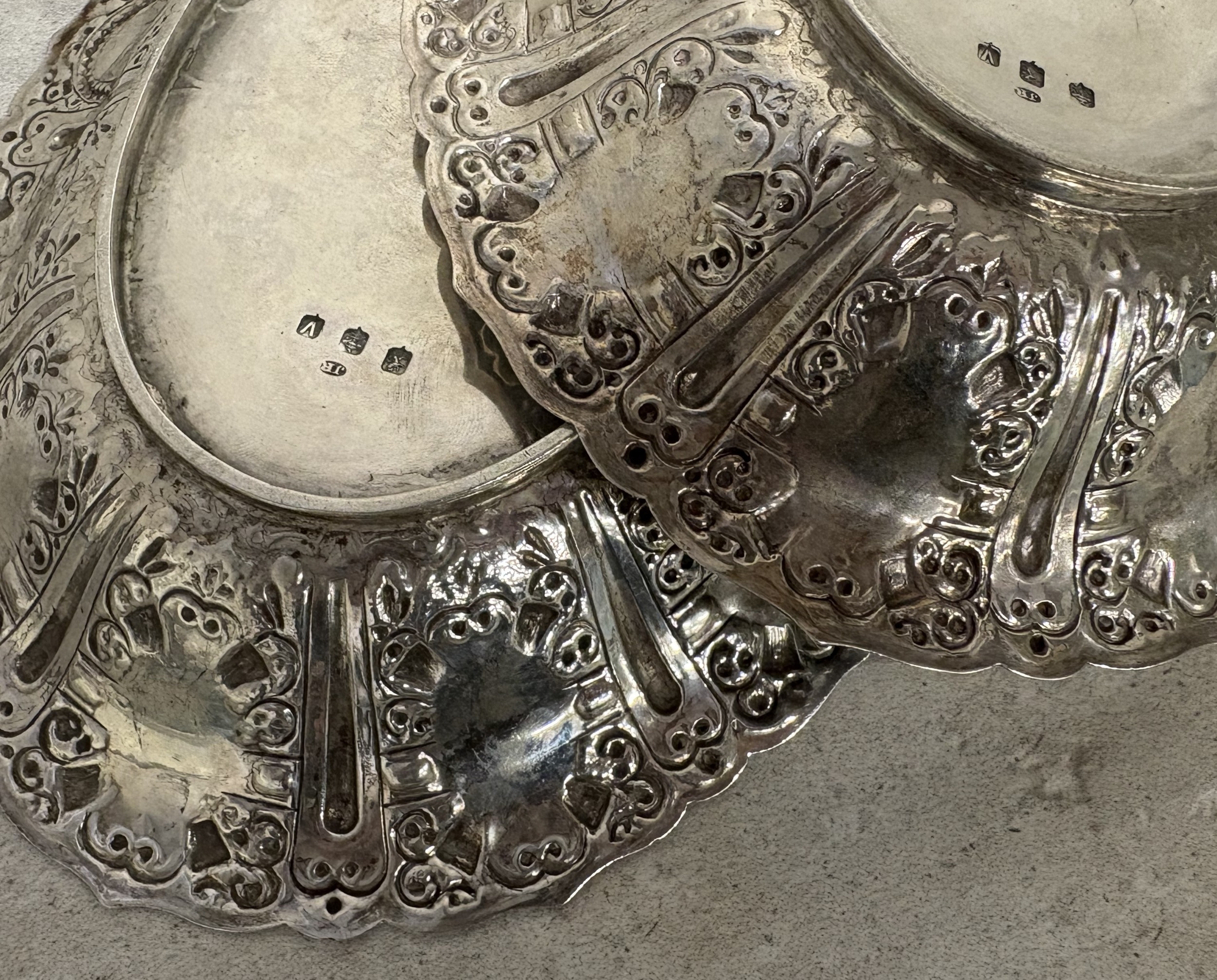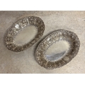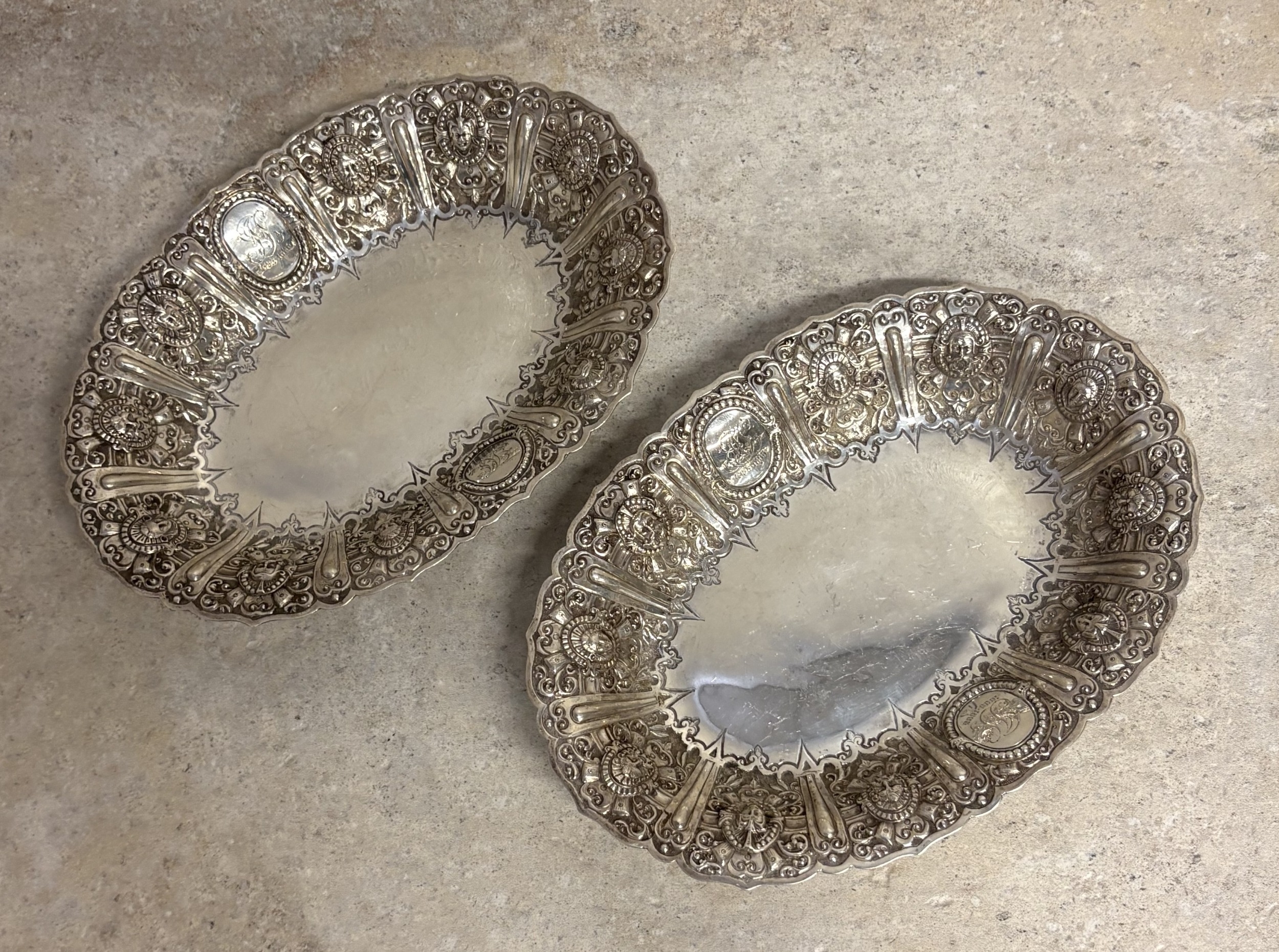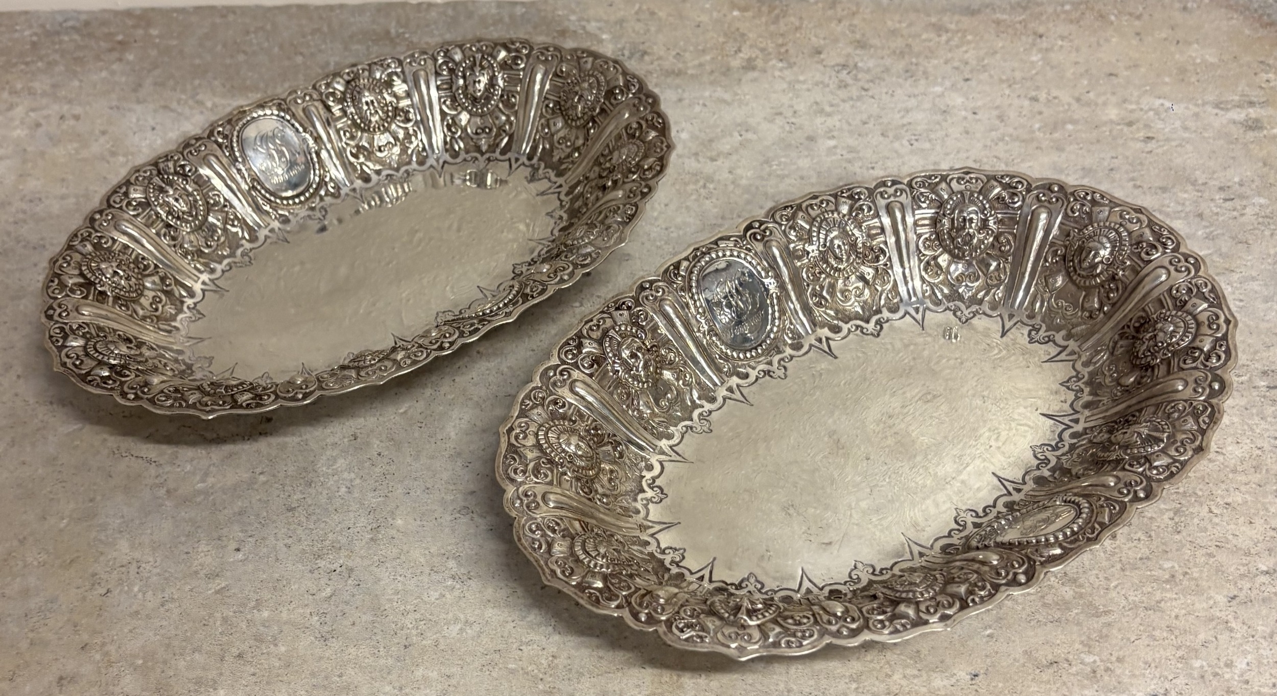 GLASGOW: A fine and rare pair of Scottish silver Cellini pattern fruit dishes embossed with figures. By James Reid. Approx. 628 grams. Est. £800 - £1200.