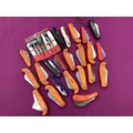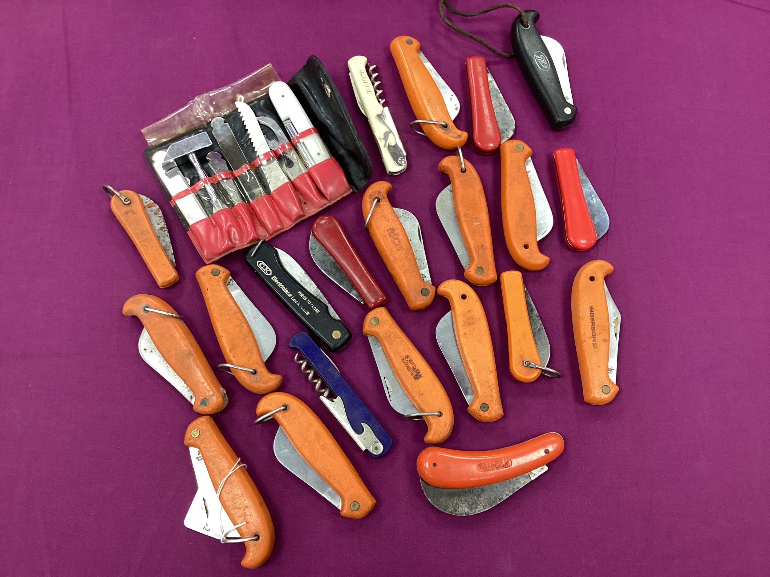 A Collection of Plastic Handle Folding Pruning Knives, a tool kit, etc.