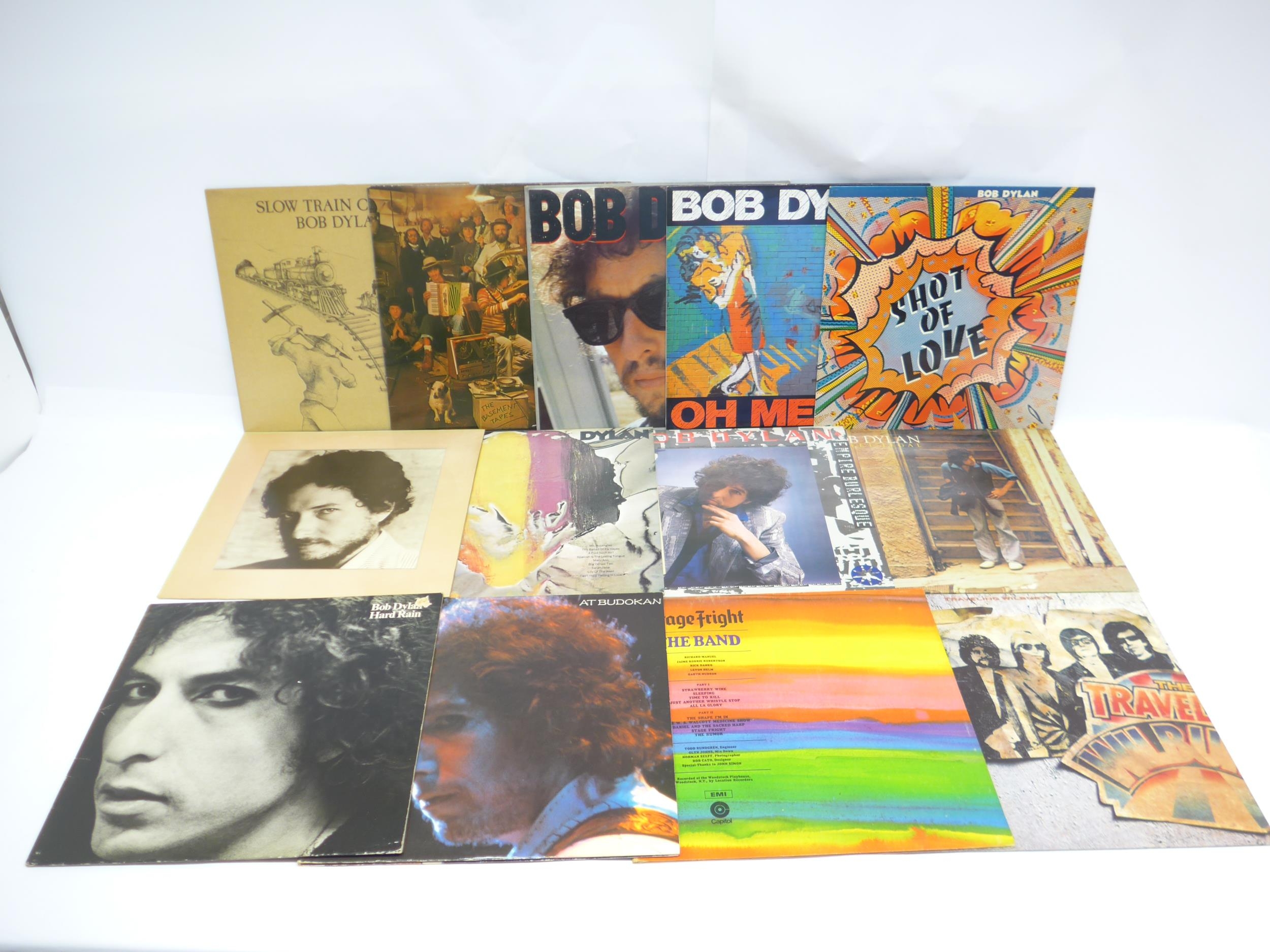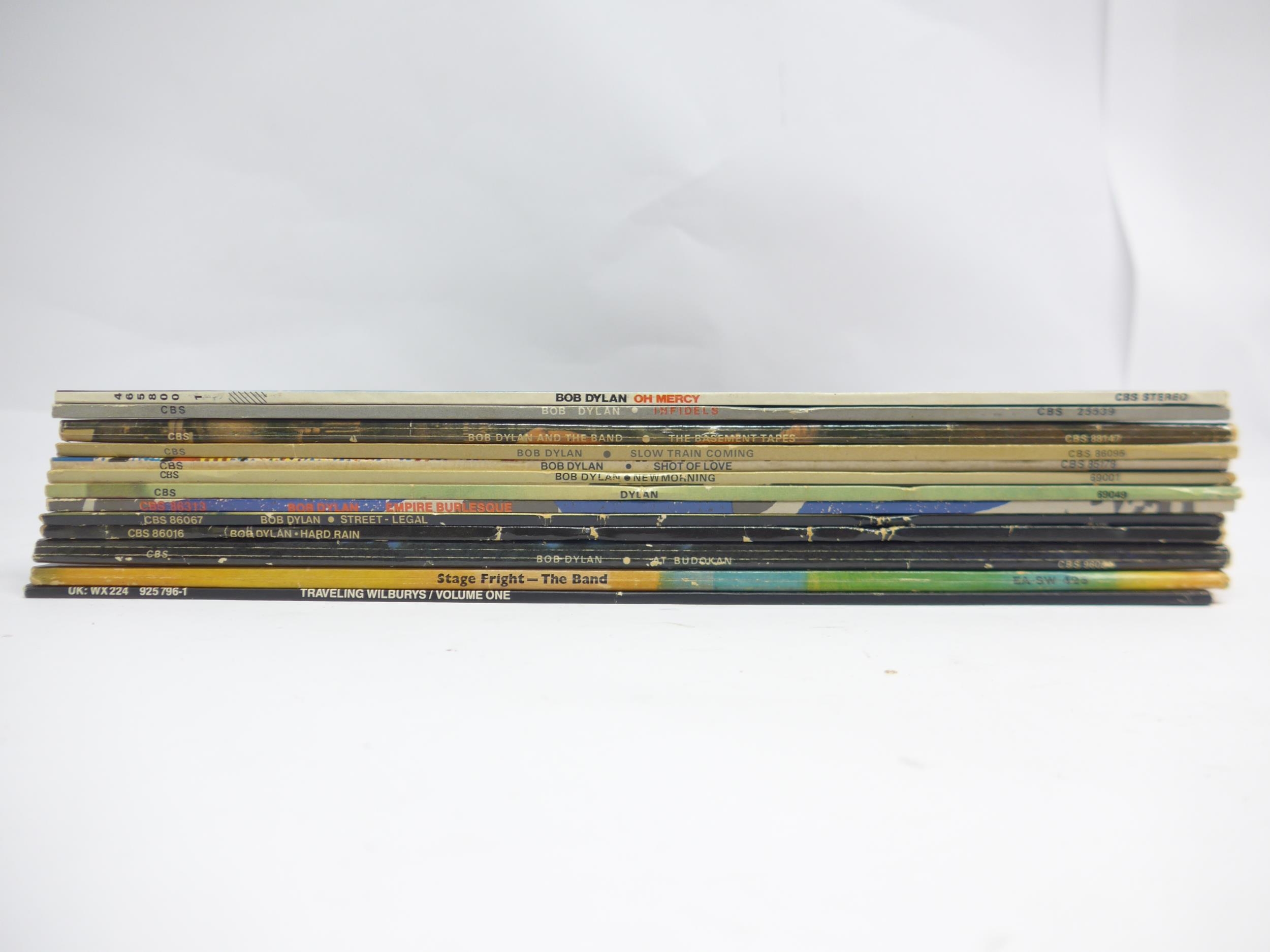 BOB DYLAN: A collection of thirteen Bob Dylan and related LPs to include 'Slow Train Coming' with printed inner (S CBS 86095), 'The Basement Tapes' (CBS 88147), 'Infidels' with printed inner (CBS 25539), 'Oh Mercy' with printed inner (CBS 465800 1), 'New Morning' (CBS 69001), 'Dylan' (CBS 69049), 'Shot Of Love' with printed inner (CBS 85179), 'Empire Burlesque' with printed inner (CBS 86313), 'Street Legal' with printed inner and lyric insert (CBS 86067), 'Hard Rain' (CBS 86016), 'At Budokan' (S CBS 83691), THE BAND: 'Stage Fright' (EA-SW 452) and TRAVELLING WILBURYS: 'Volume One' with printed inner (WX224) (13, vinyl generally VG+-EX with a few dropping under, sleeves VG-VG+)