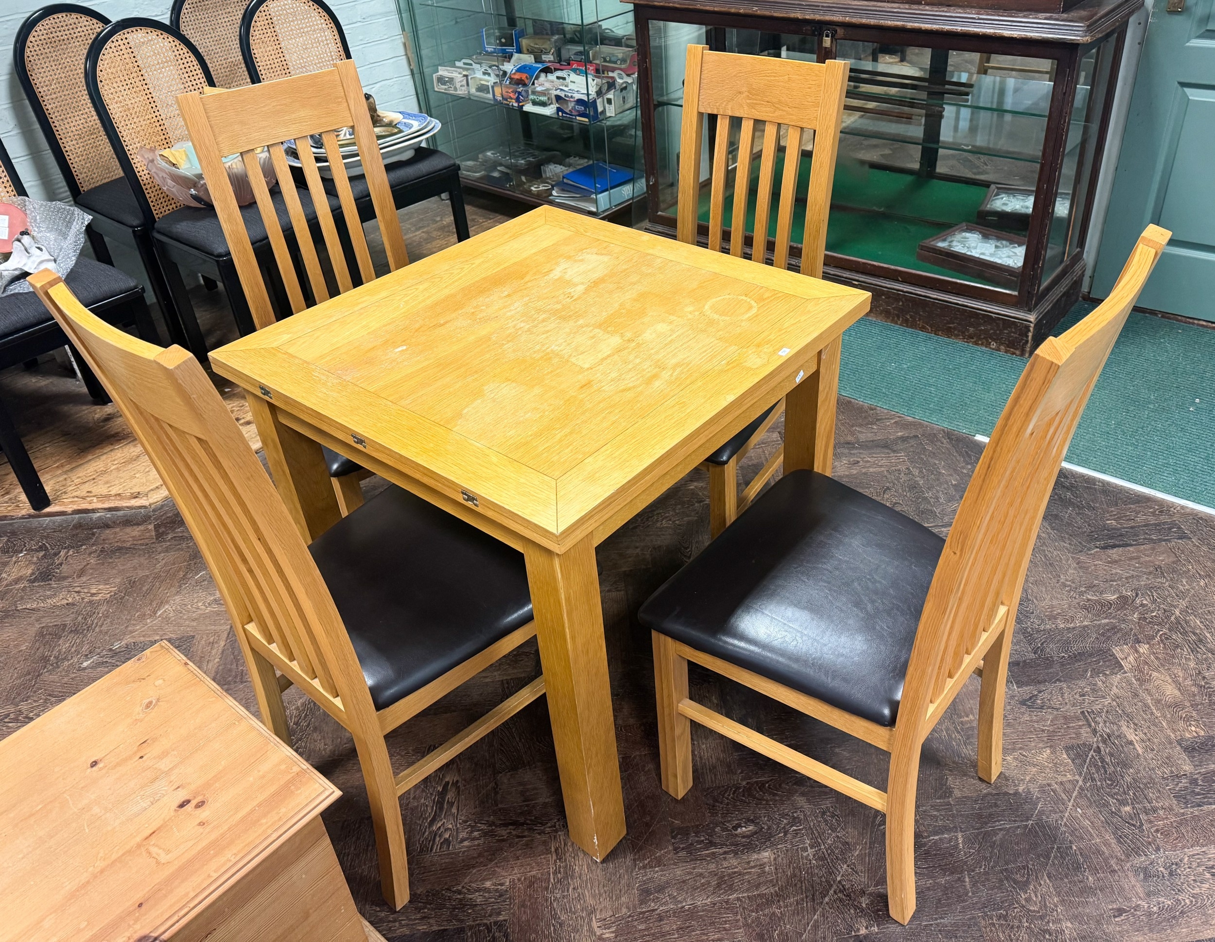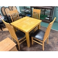 A square modern light oak dining table and four matching slat back chairs with faux brown leather seats