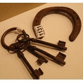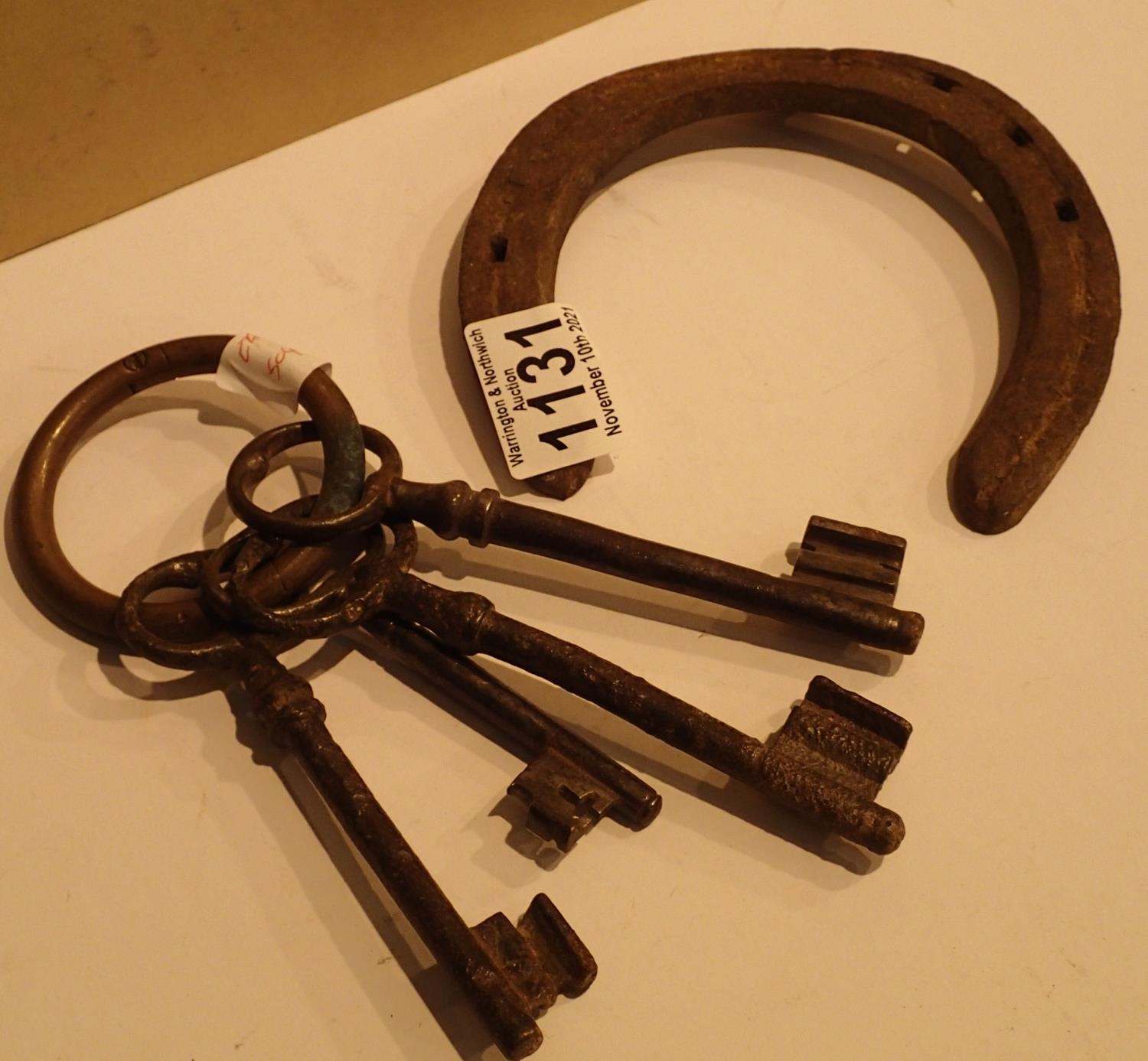 Four antique cast iron keys and a horseshoe. P&P Group 1 (£14+VAT for the first lot and £1+VAT for subsequent lots)