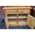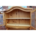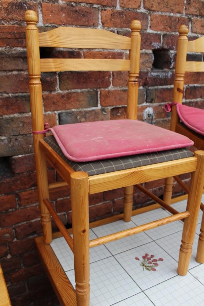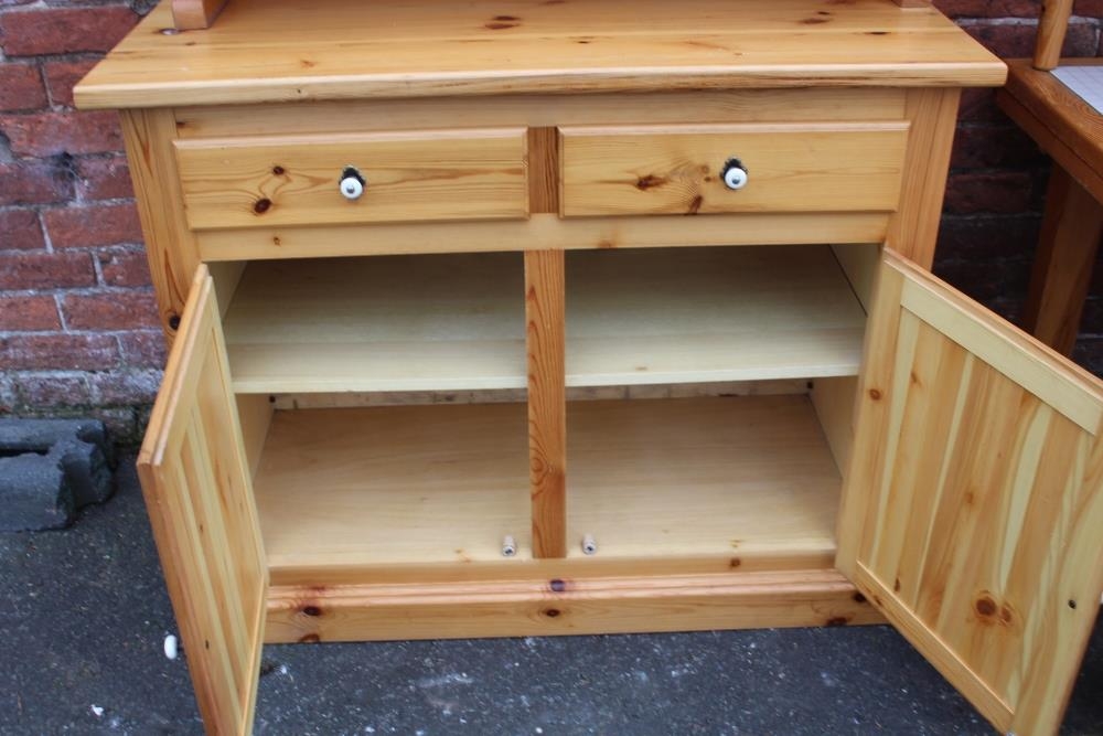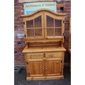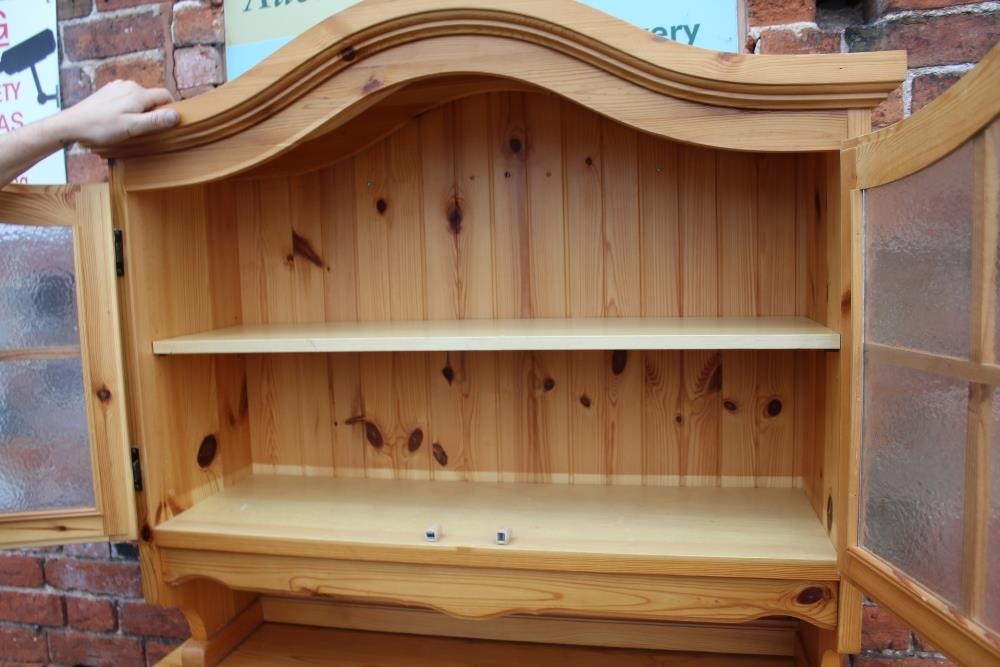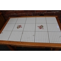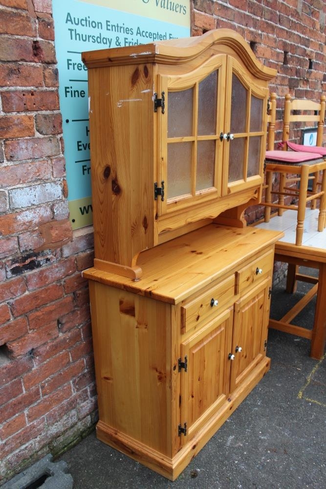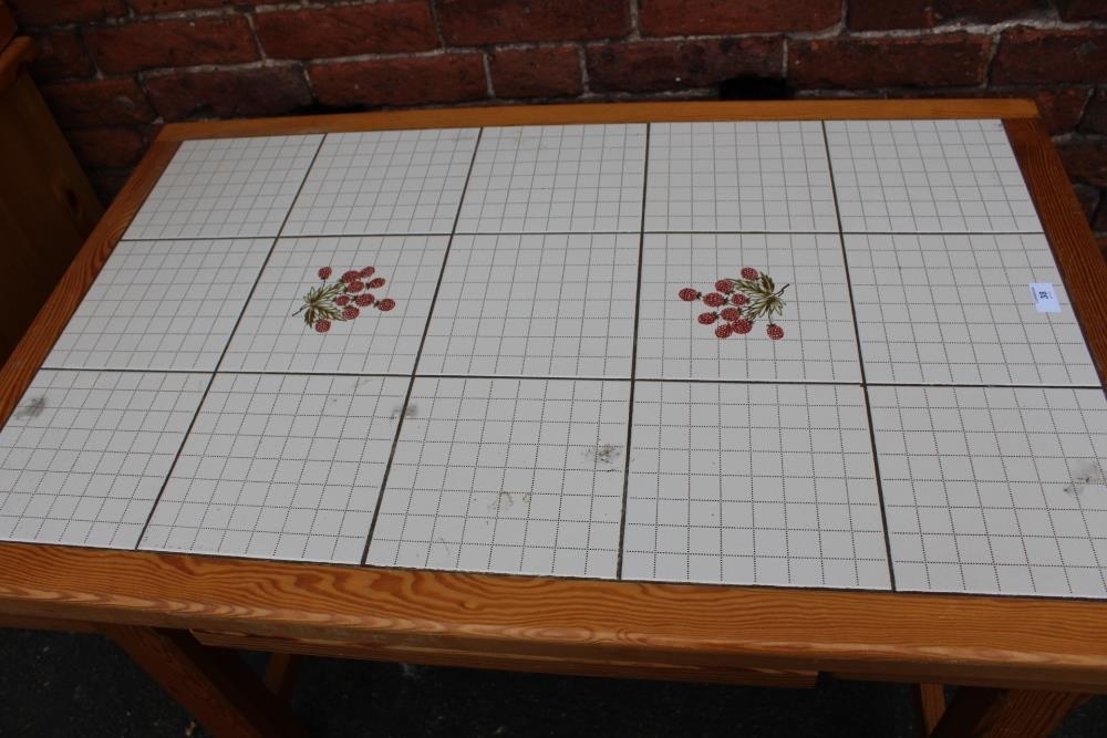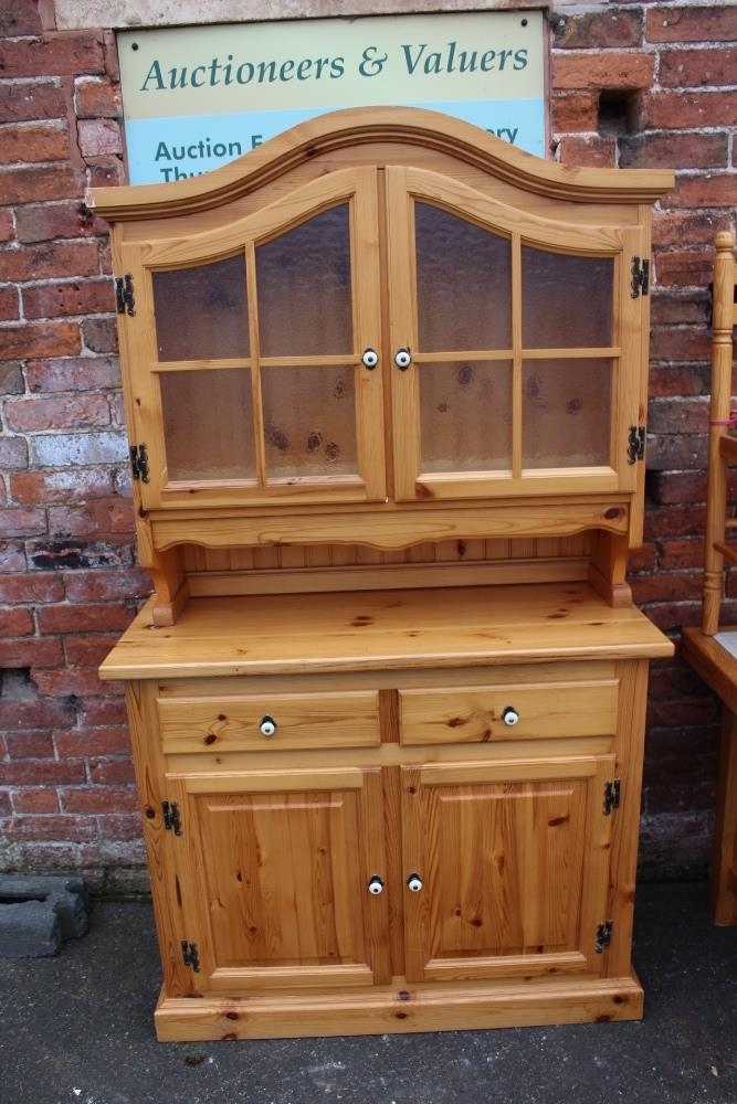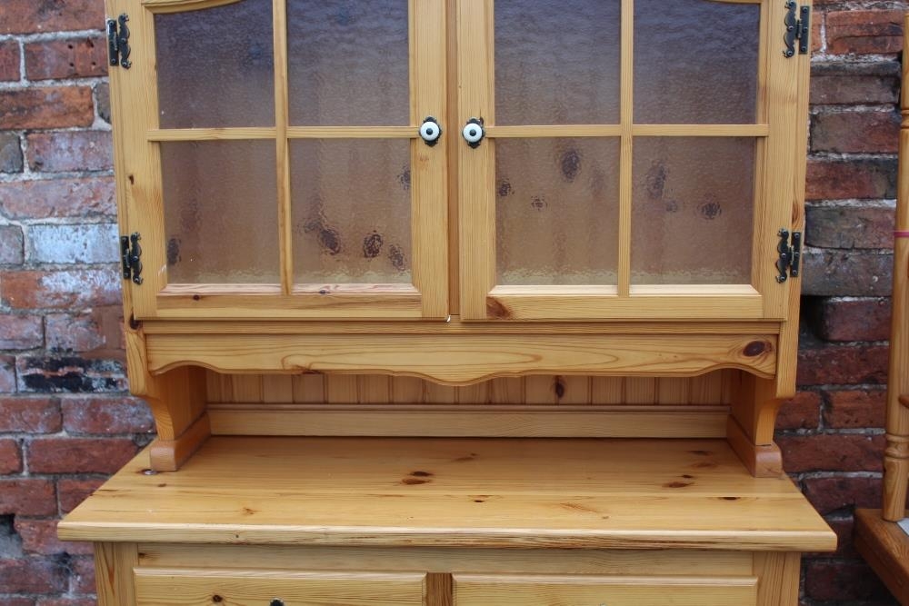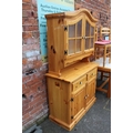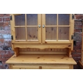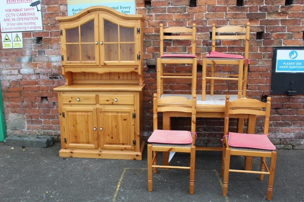 A MODERN PINE TILE TOP KITCHEN TABLE WITH FOUR CHAIRS, together with a pine glazed dresser