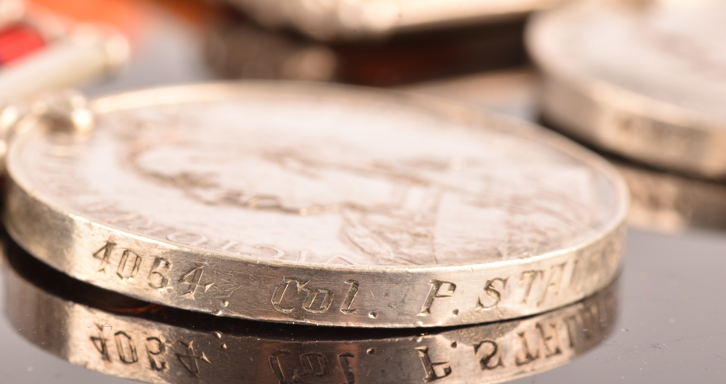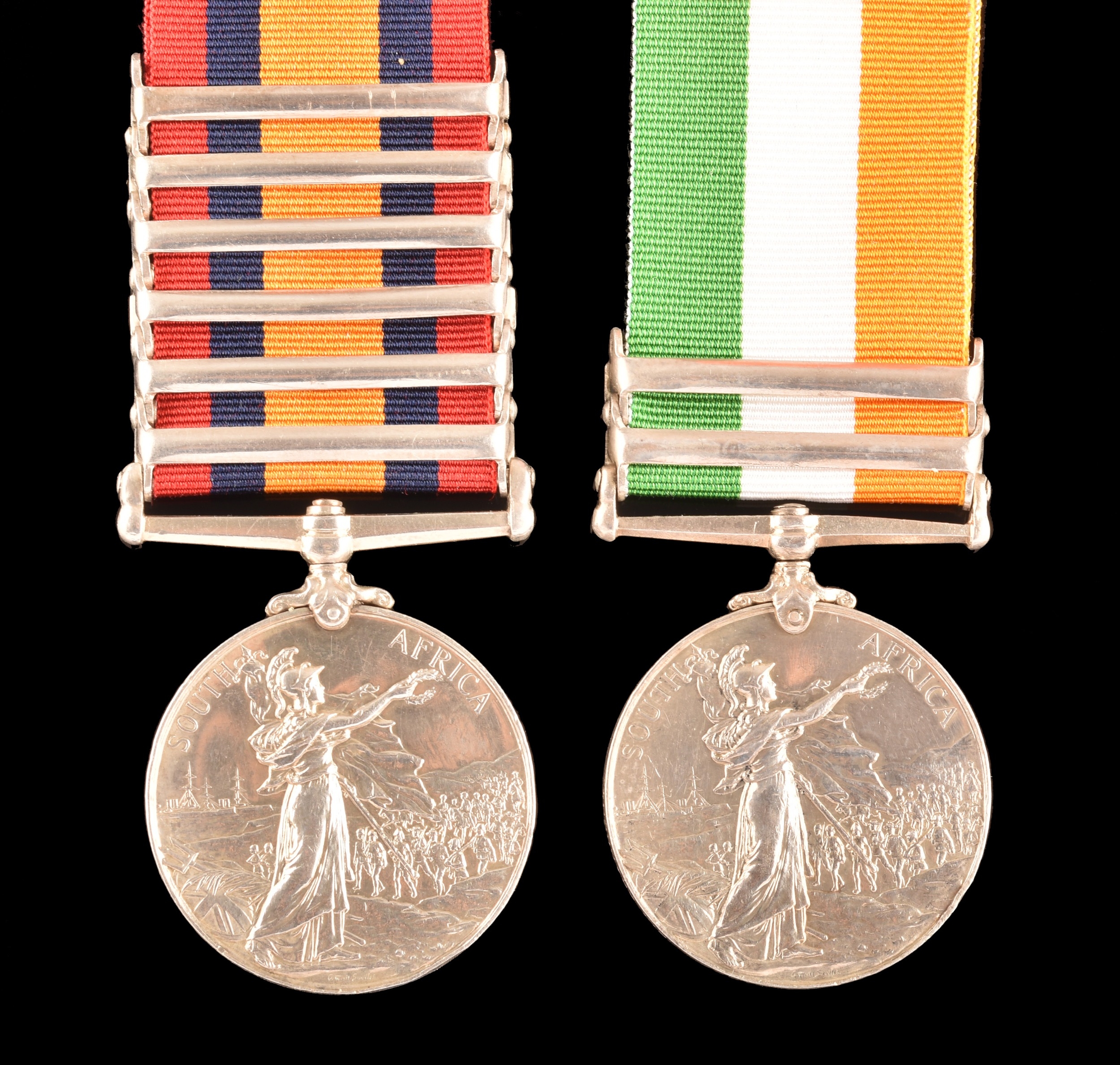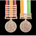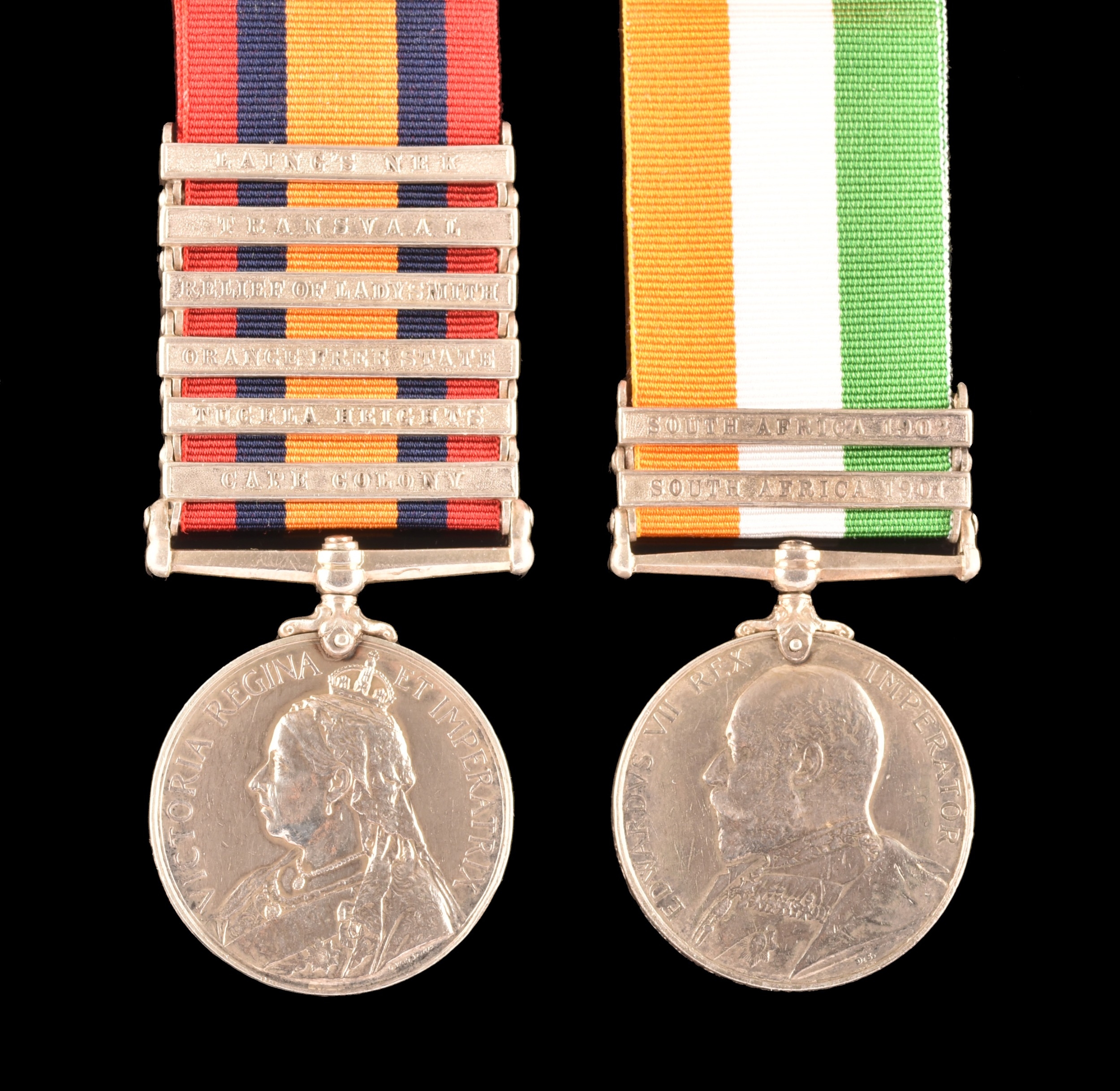 A Boer War medal pair awarded to: 4064 Corporal. P. Stallibrass, Royal Dragoons. Comprising: a QSA Queen’s South Africa medal with 6 clasps Cape Colony, Tugela Heights, Orange Free State, Relief of Ladysmith, Transvaal, Laing's Nek (4064 Col. P. Stallibrass 1/ Rl. Drgns); and a KSA King's South Africa medal with 2 clasps South Africa 1901 and South Africa 1902 (4064 Corpl. P. Stallibrass Rl: Dragoons).