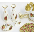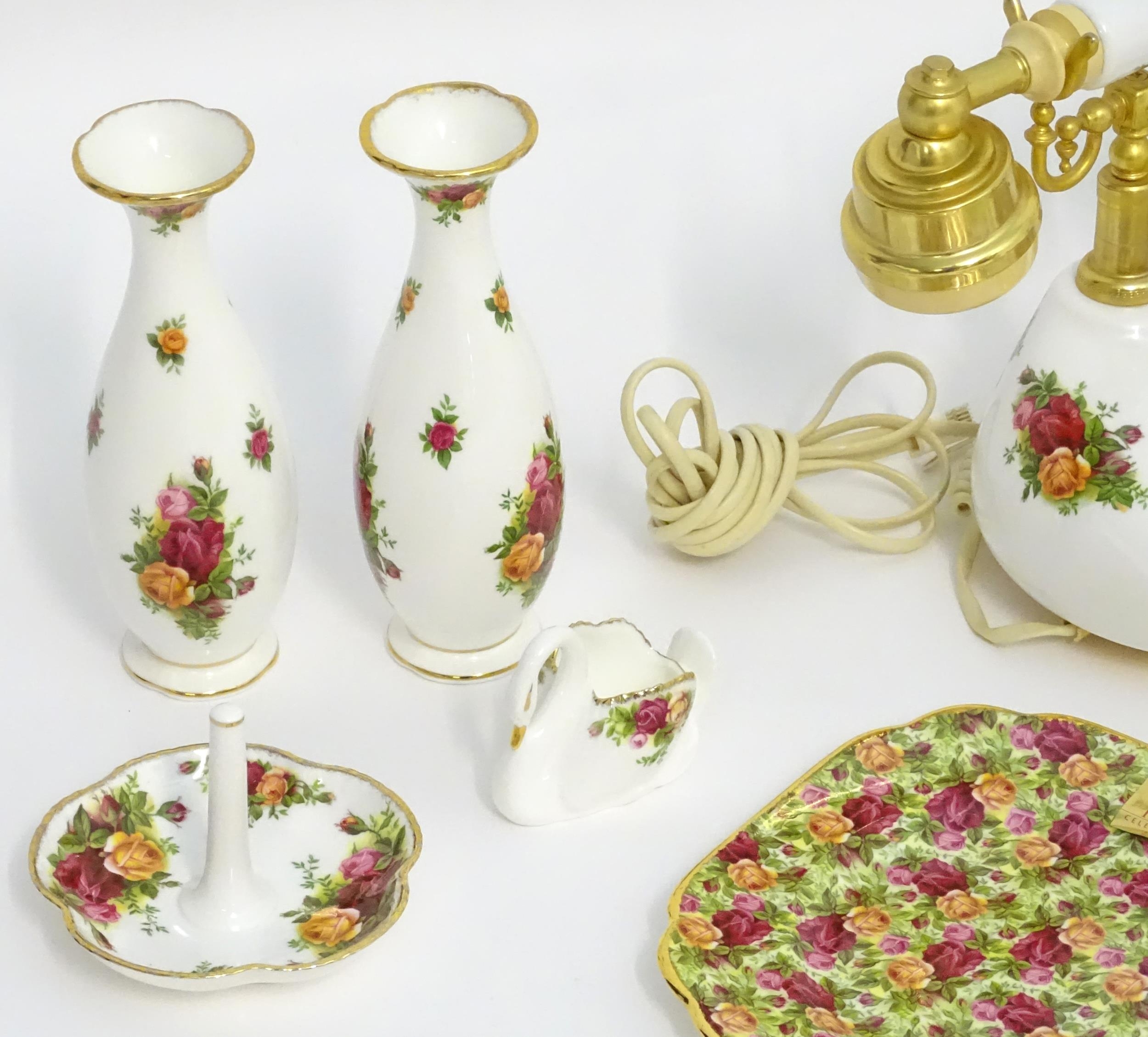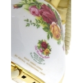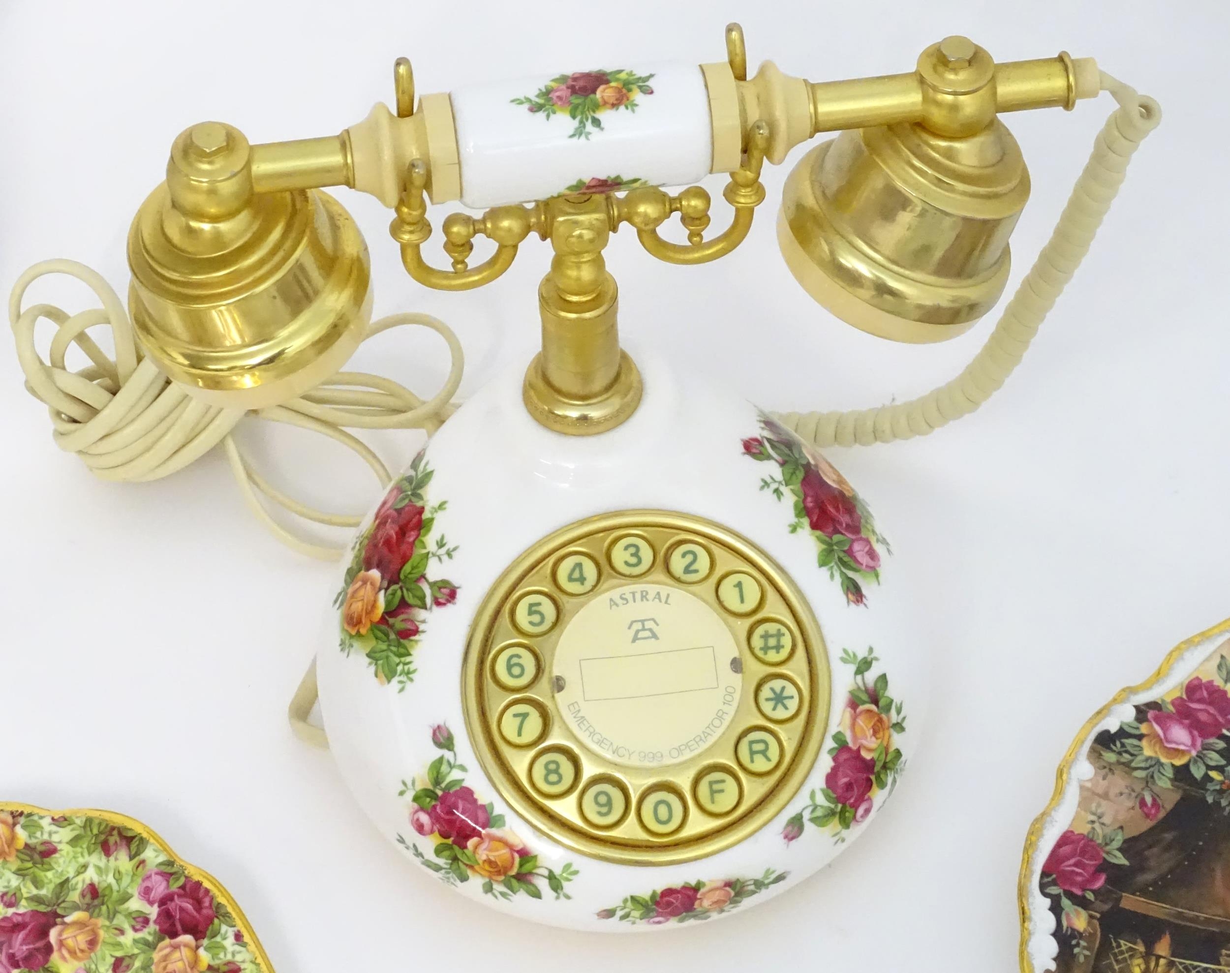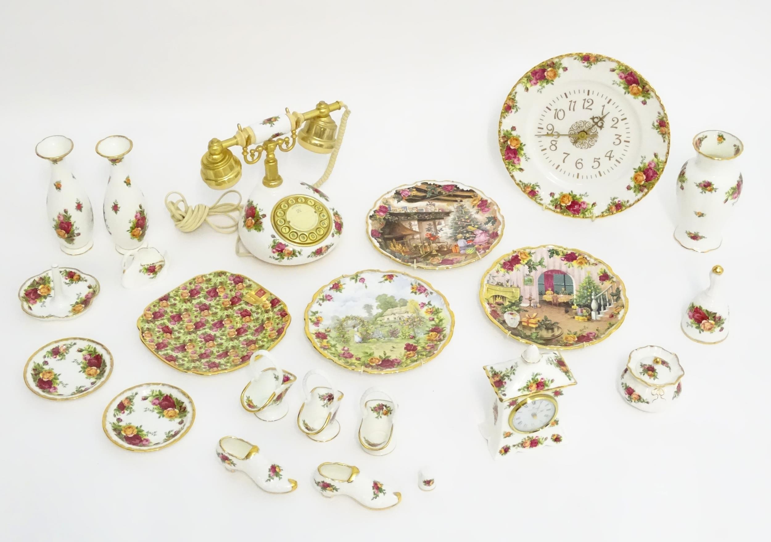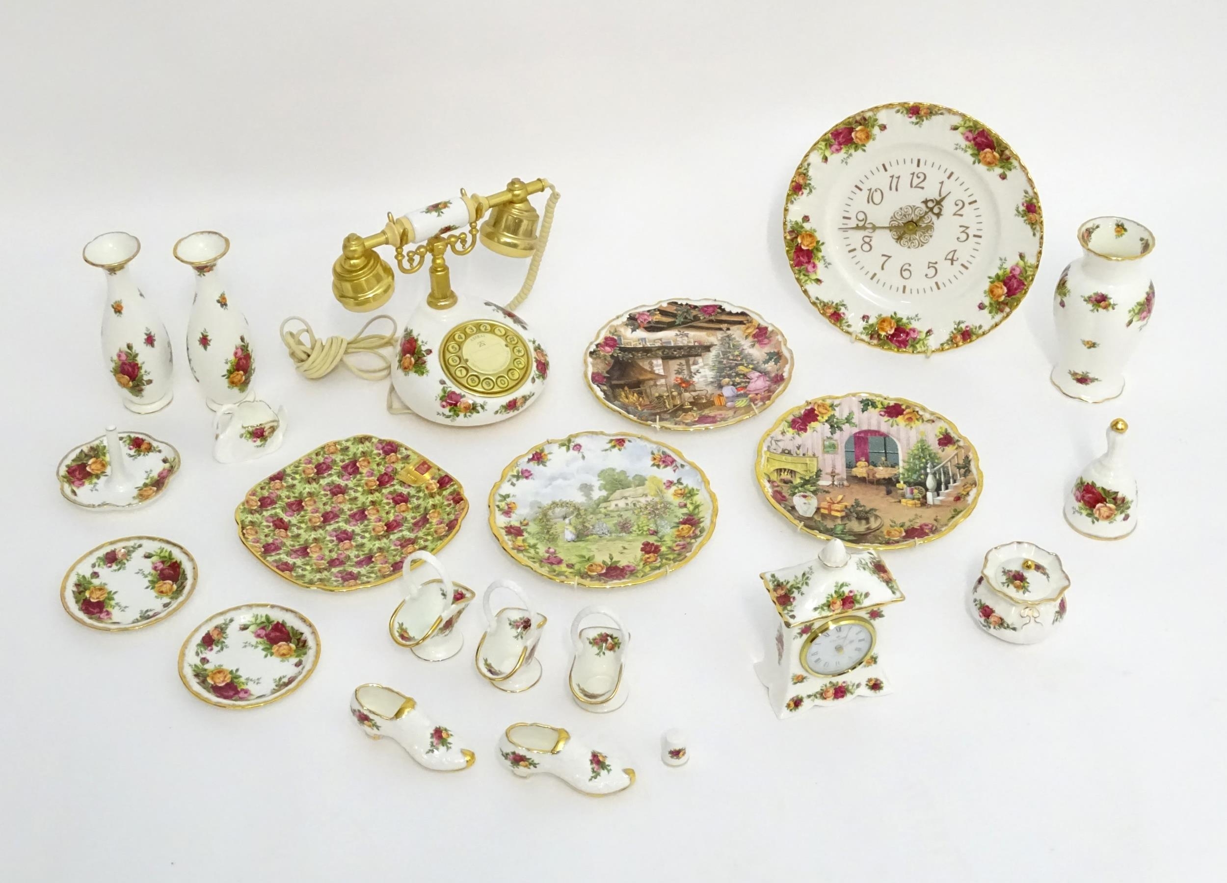 A quantity of assorted Royal Albert items in the Old Country Roses pattern to include telephone, wall clock, mantle clock, miniature baskets, ring / jewellery stand, thimble, novelty miniature shoes, vases, table bell, pot and cover, Christmas plates etc. Various back stamps under. Telephone approx. 7 3/4" high (Approx. 22 pieces)