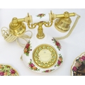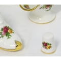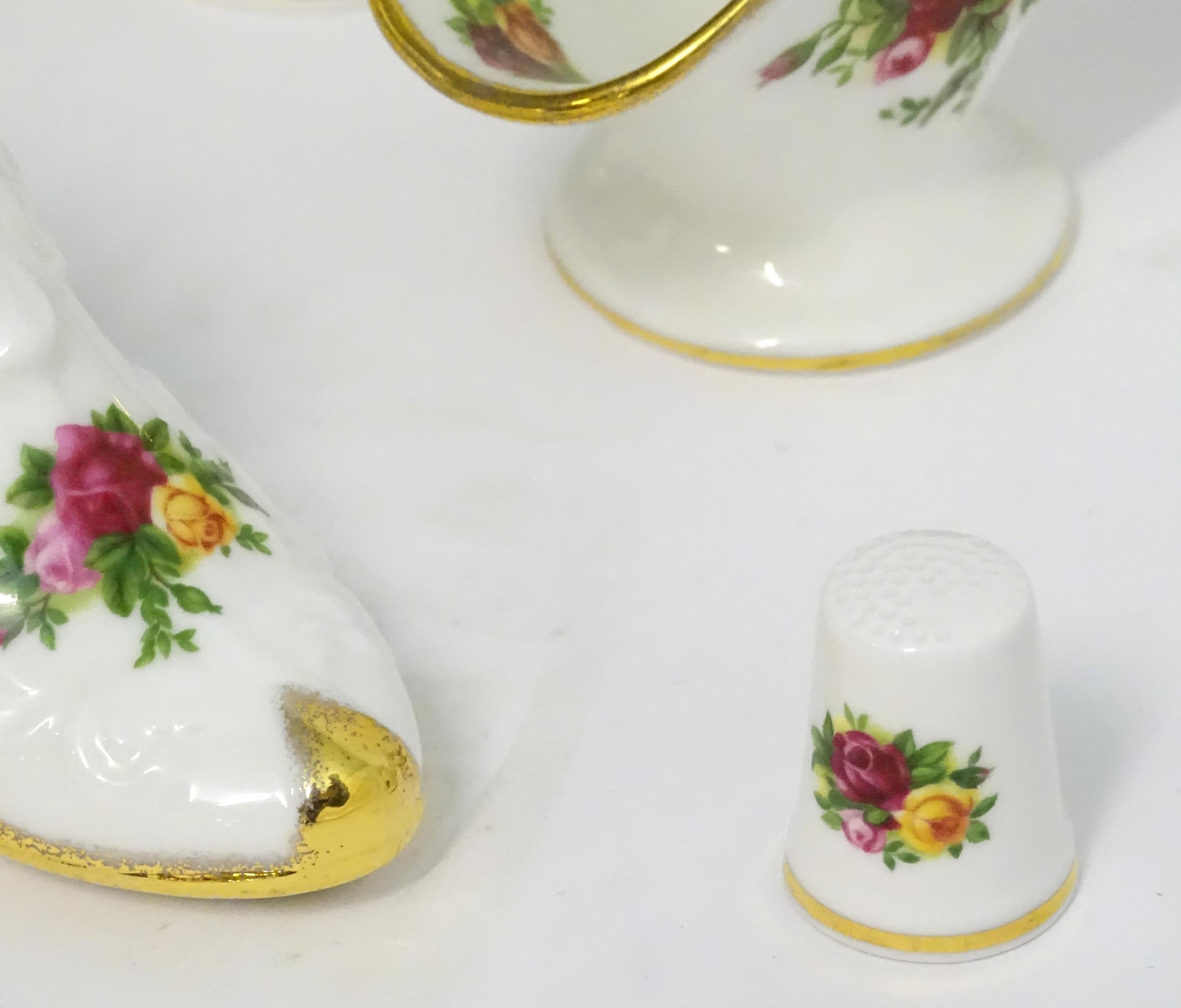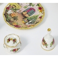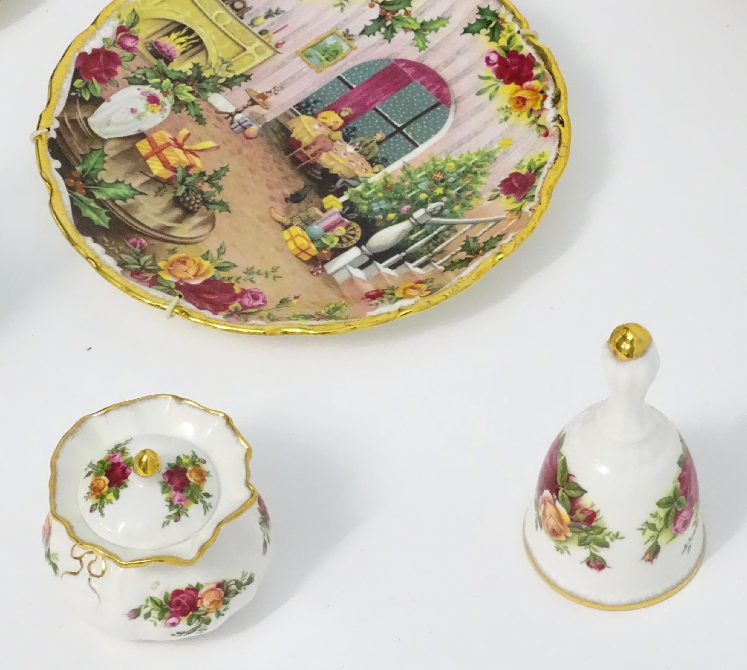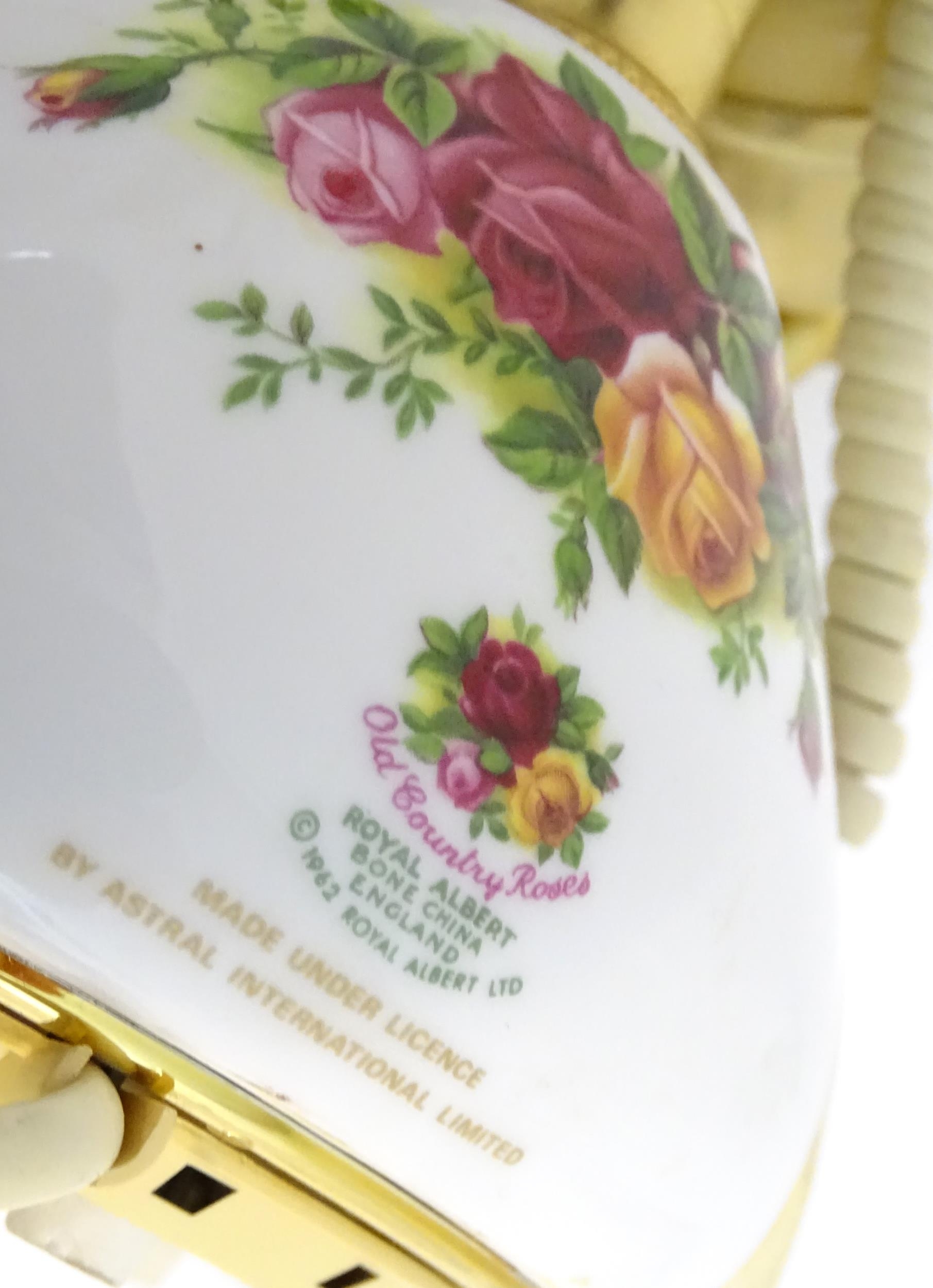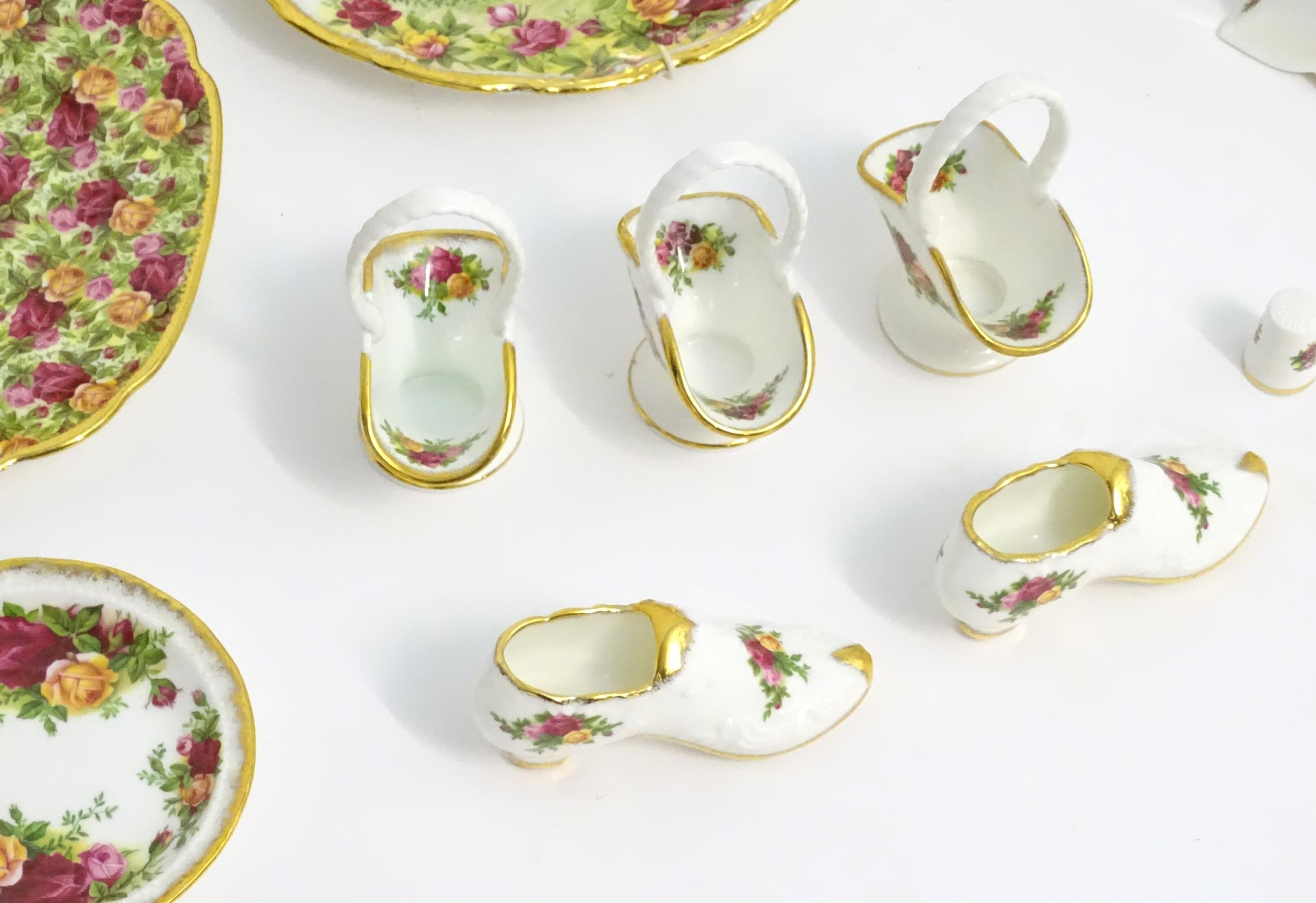 A quantity of assorted Royal Albert items in the Old Country Roses pattern to include telephone, wall clock, mantle clock, miniature baskets, ring / jewellery stand, thimble, novelty miniature shoes, vases, table bell, pot and cover, Christmas plates etc. Various back stamps under. Telephone approx. 7 3/4" high (Approx. 22 pieces)