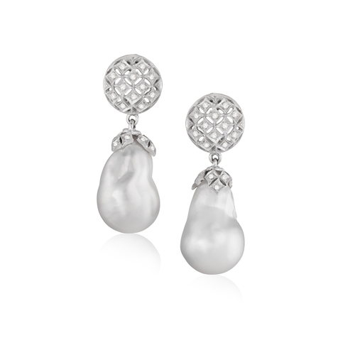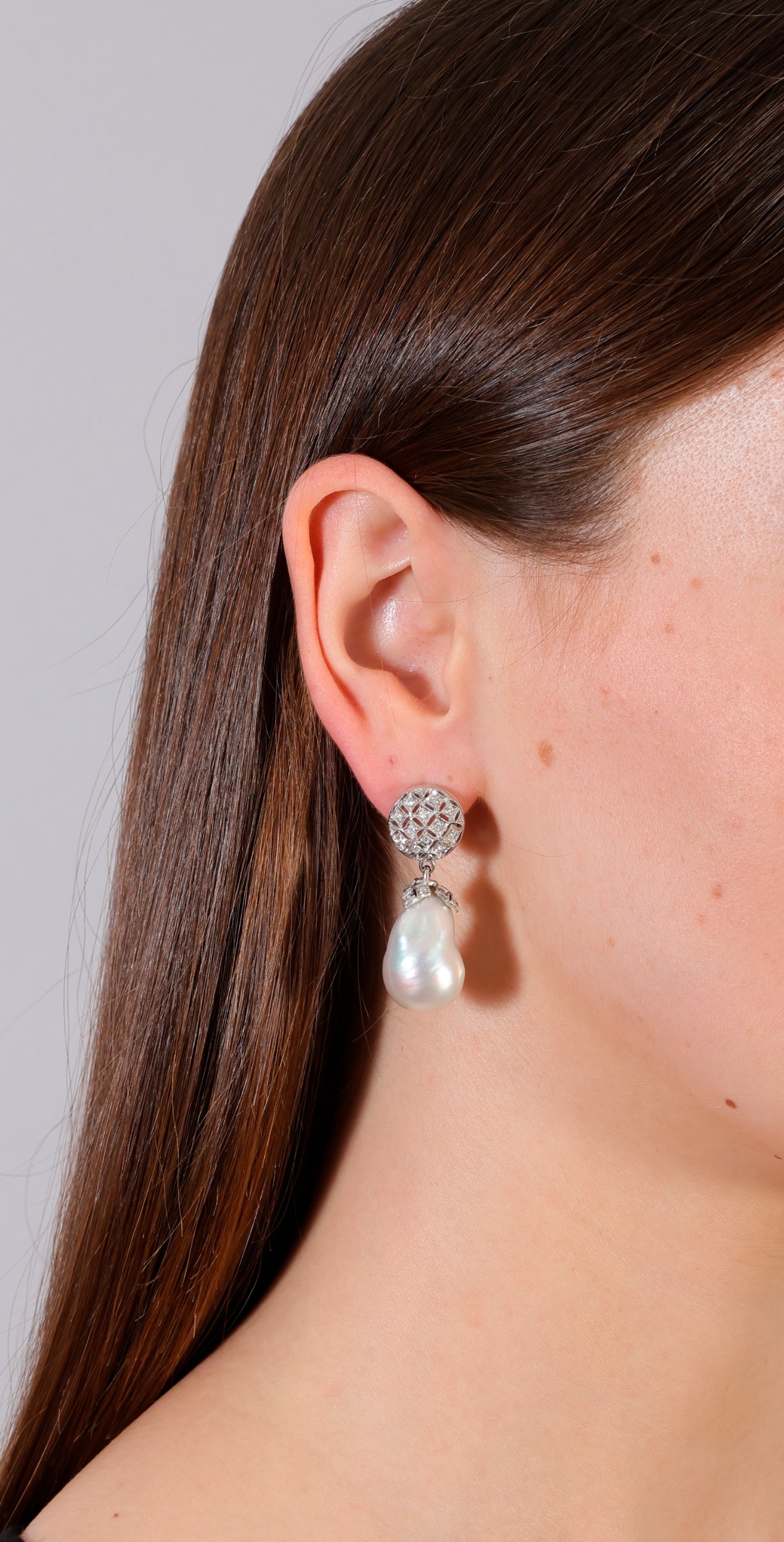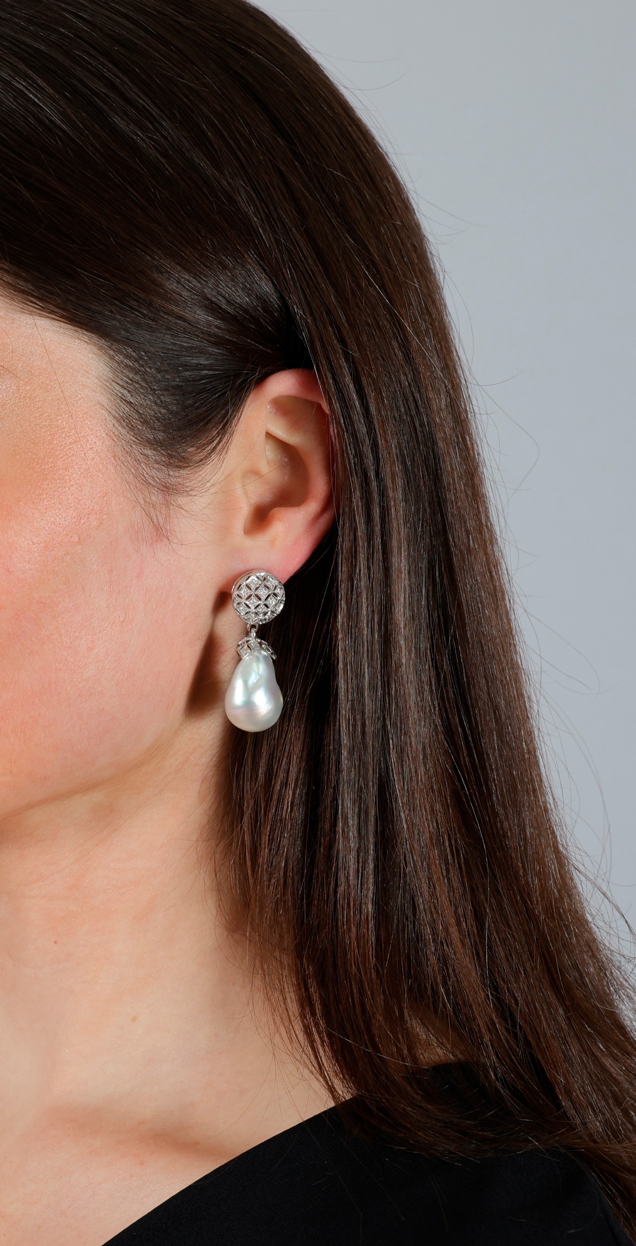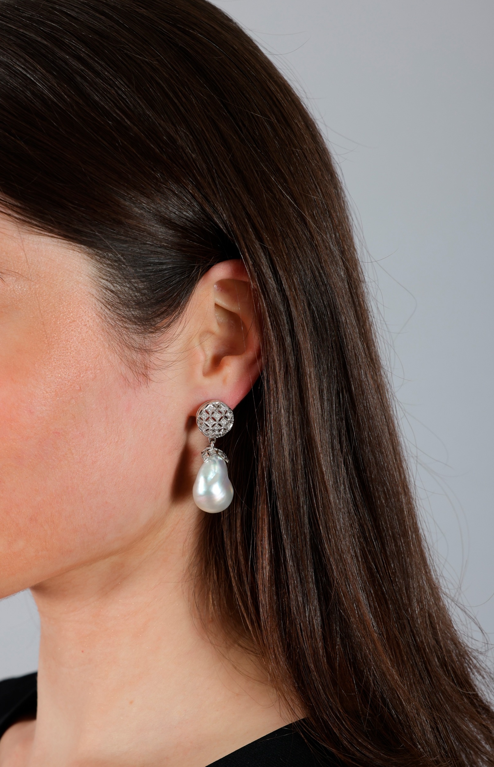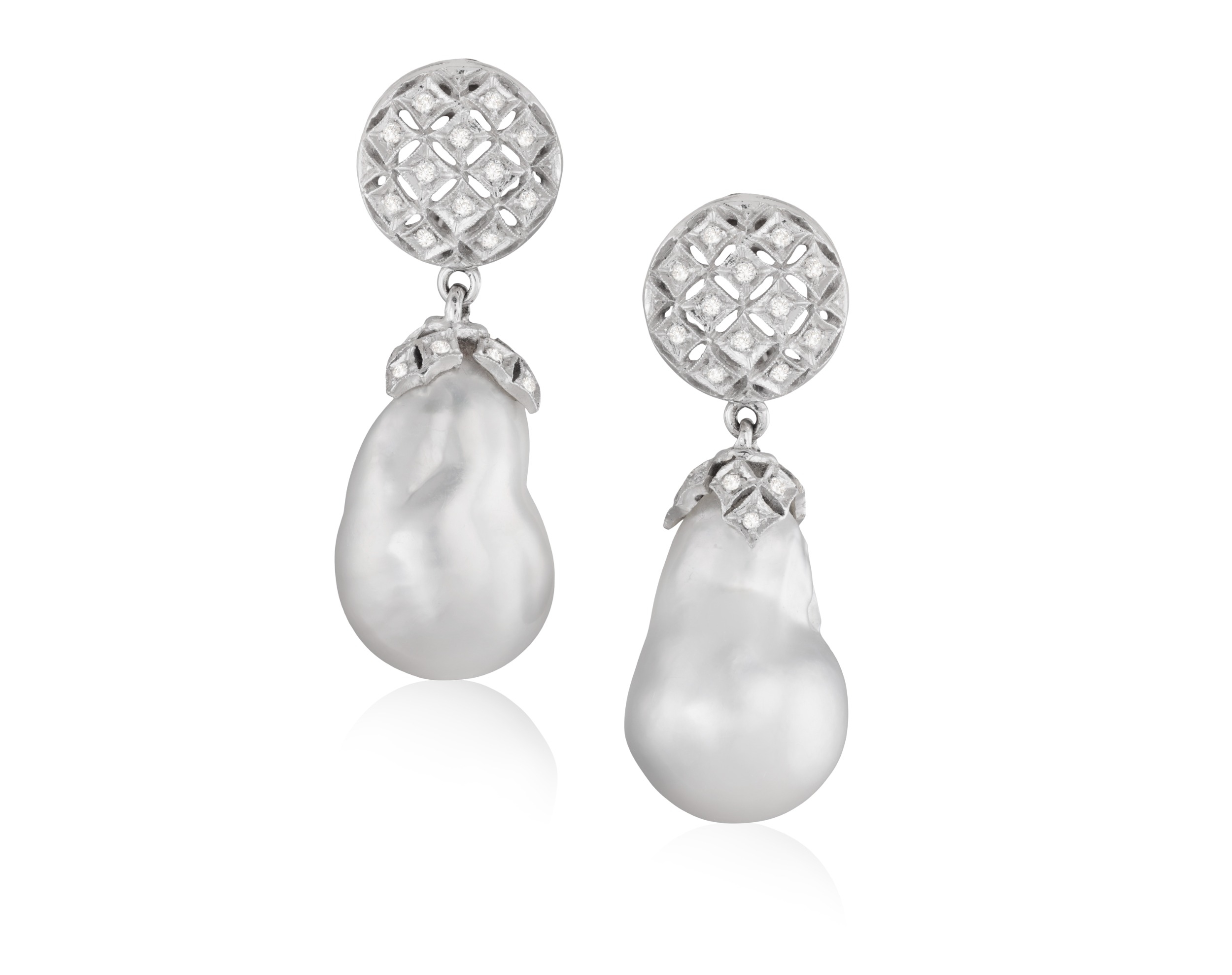 A PAIR OF CULTURED PEARL AND DIAMOND PENDENT EARRINGS Each set with a baroque-shaped cultured pearl of white tint measuring approximately 22.3 x 15.5 x 15.3mm and 22.1 x 15.1 x 14.3mm, to a pierced cap and circular-shaped mount, set with brilliant-cut diamonds and millegrain-detailing, mounted in 18K white gold, Italian registry marks, length 4.4cm