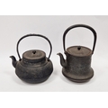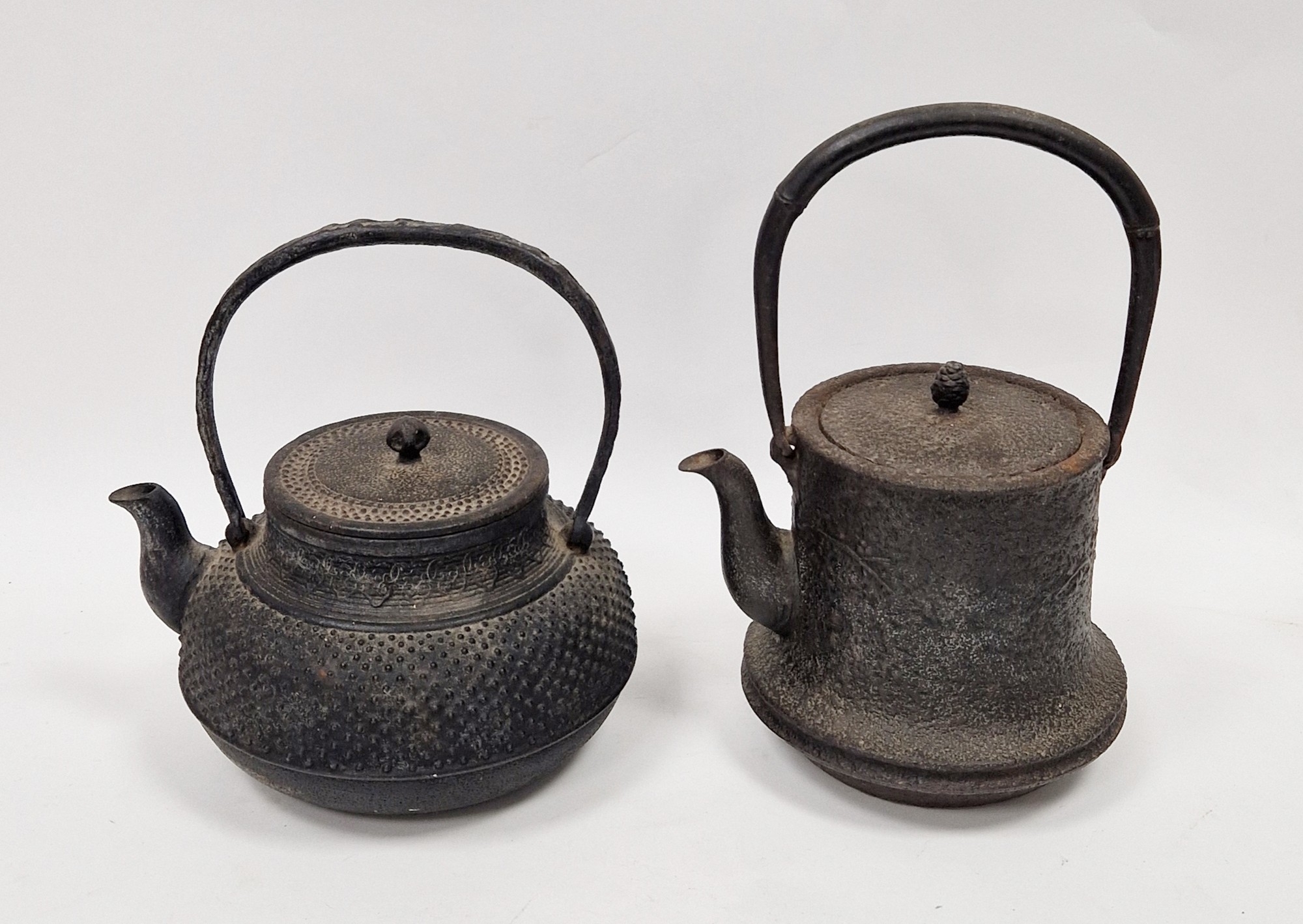 Two Japanese cast iron teapots and covers (Tetsubin), the first cast with dimples, with swing handle, the second with flowering prunus and two-handled terminal, tallest including handle 28cm high (2)