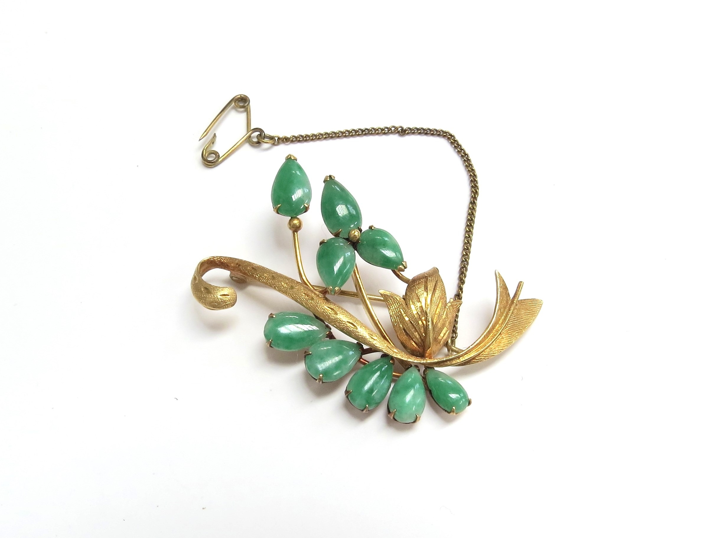 A jade set brooch of foliate form, unmarked gold, 4.5cm long, 7.1g