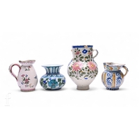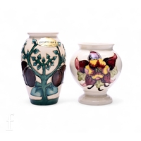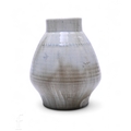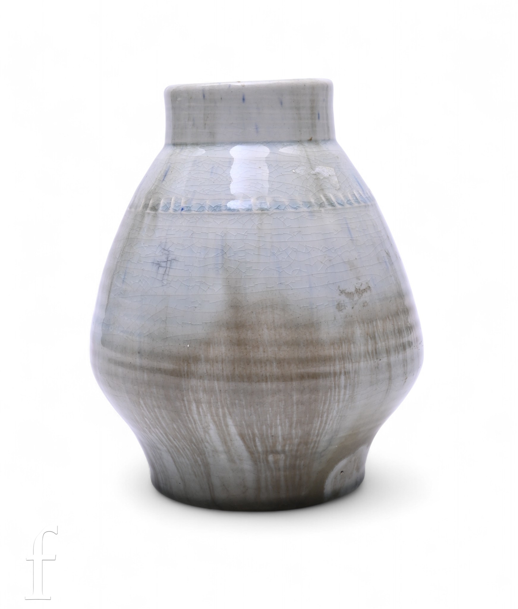 In the style of William Moorcroft, a natural ware vase, of ovoid form with textured band, in graded pale blue to sage green glaze, faint impressed marks to base, height 16cm.