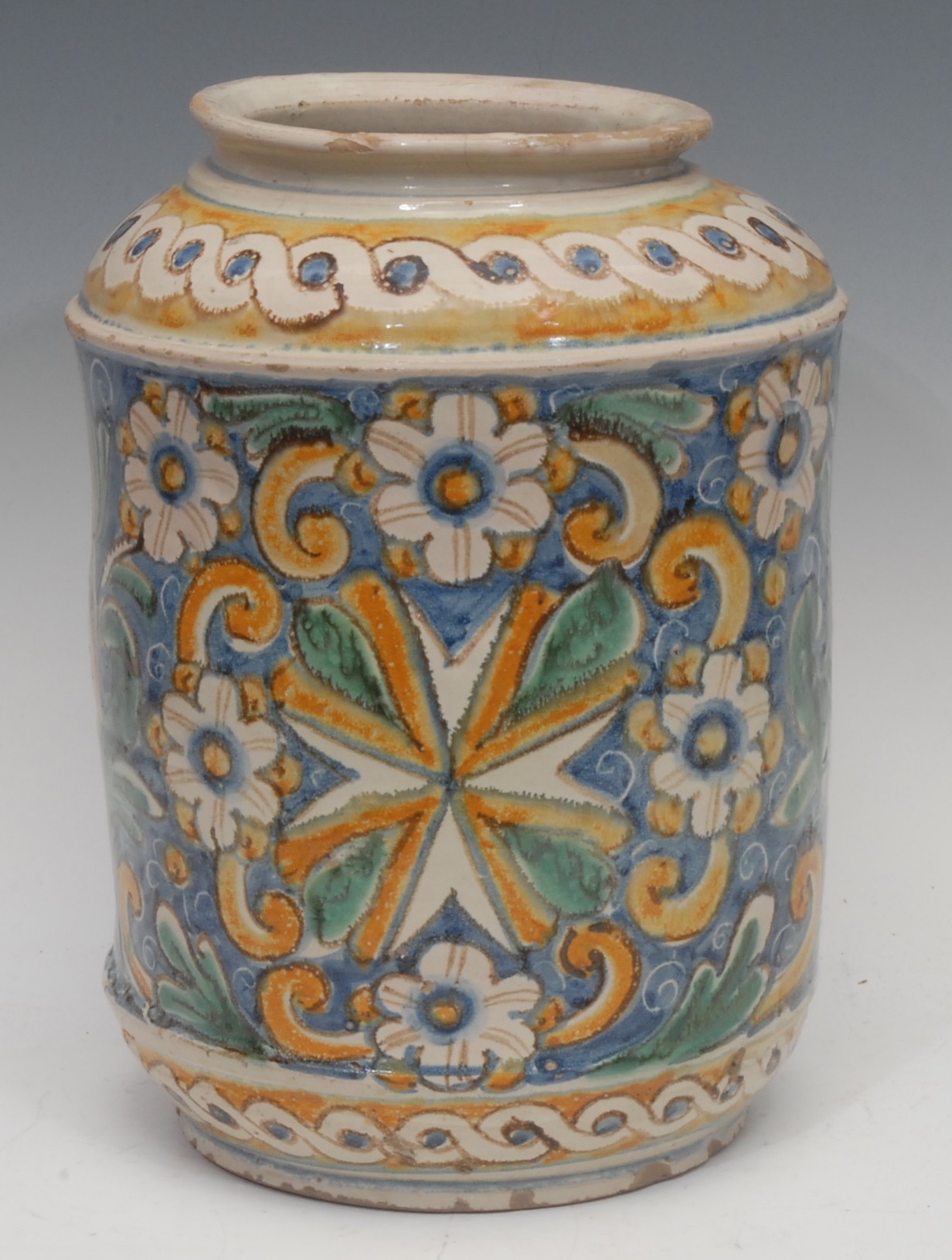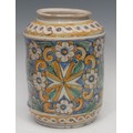 A 19th century Italian maiolica type tin glazed earthenware vase, hand painted guilloche pattern above scrolling acanthus and flowerheads in underglaze tones of blue, green and ochre on a blue ground, 33cm high overall