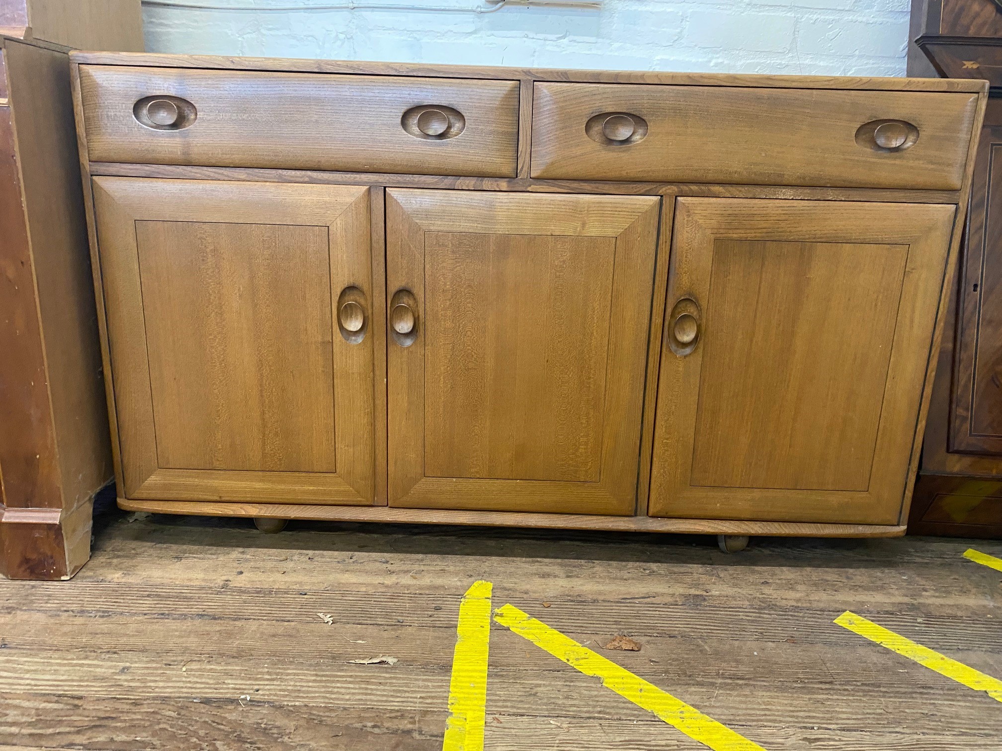 An Ercol Type Oak Sideboard. Circa 1950. Fitted with two long drawers above three cupboard doors. 81cm x 136cm x 46cm