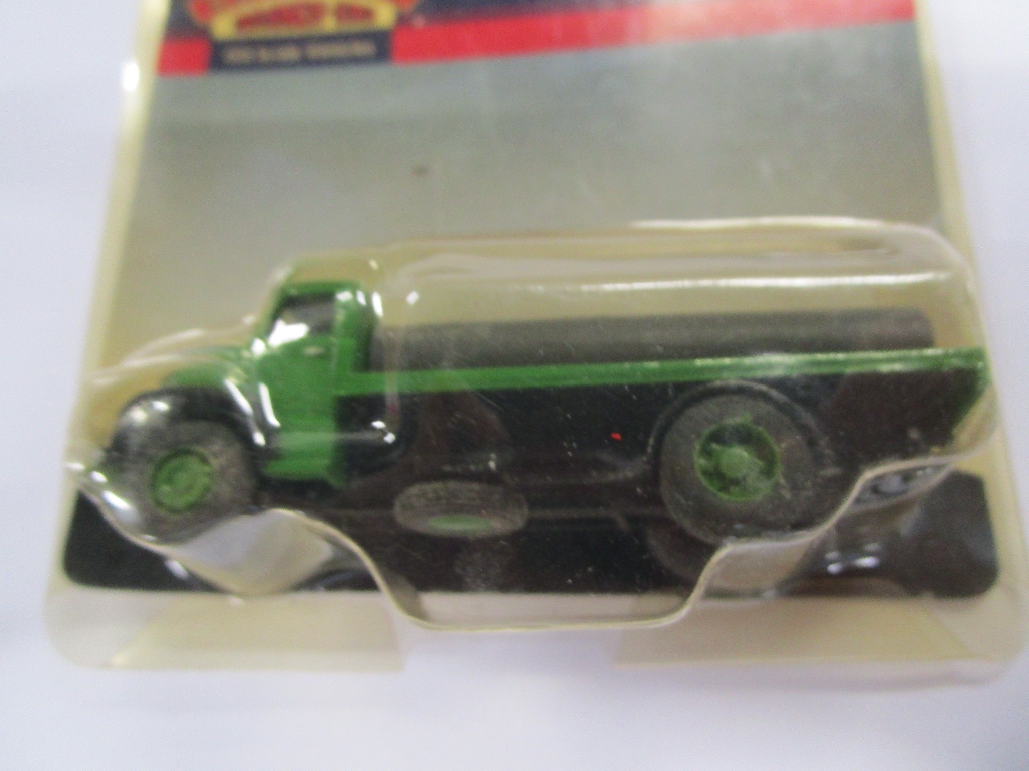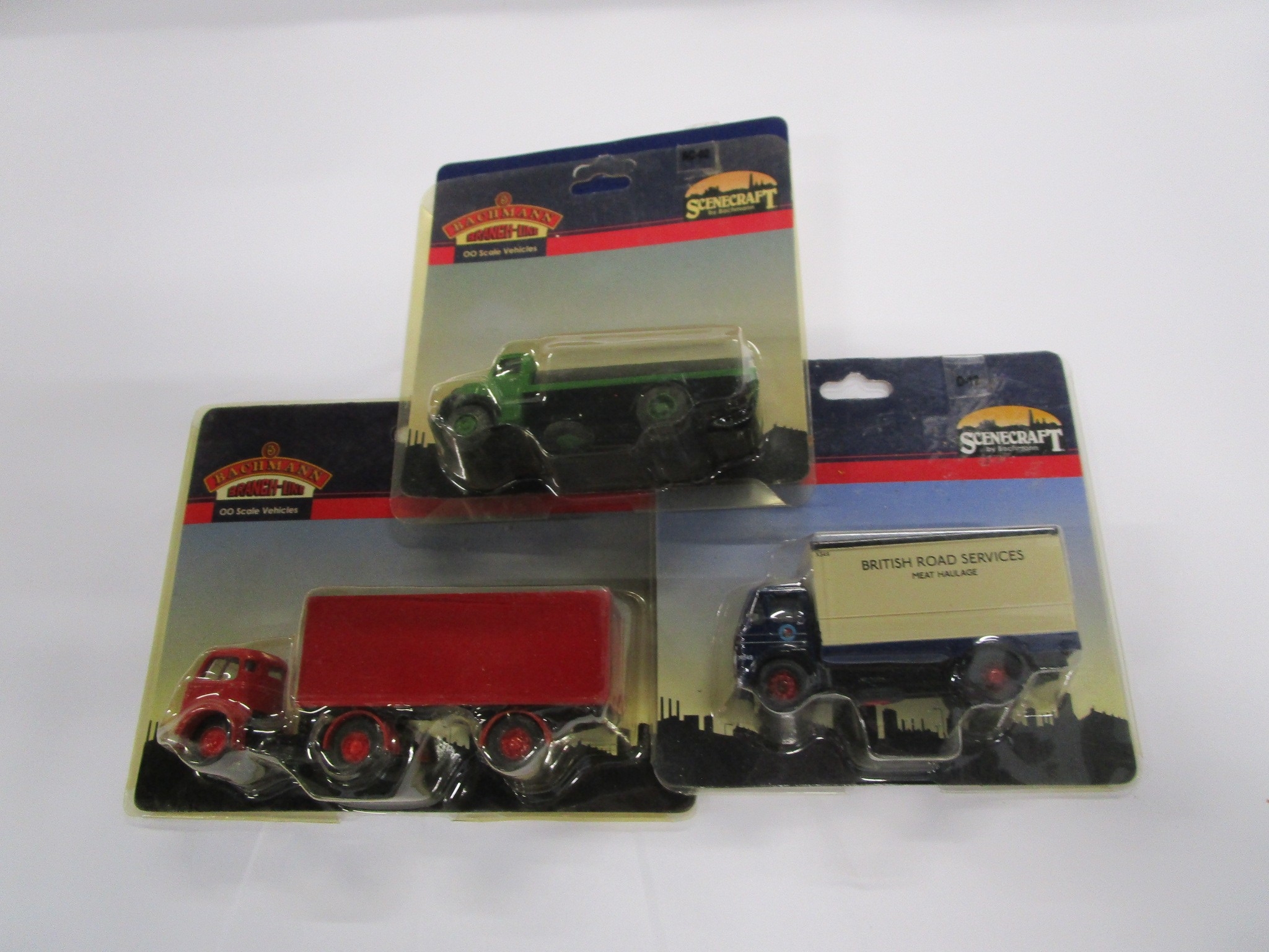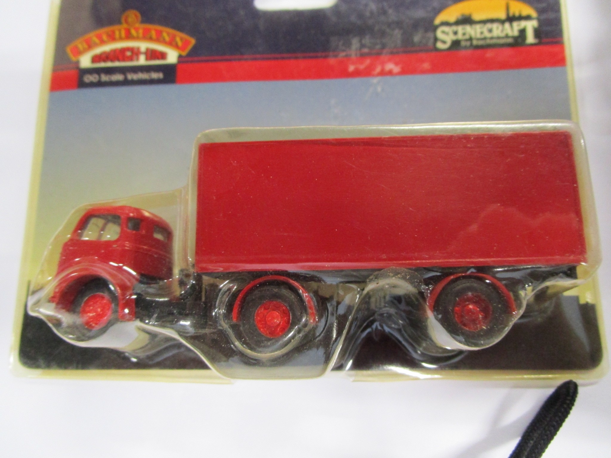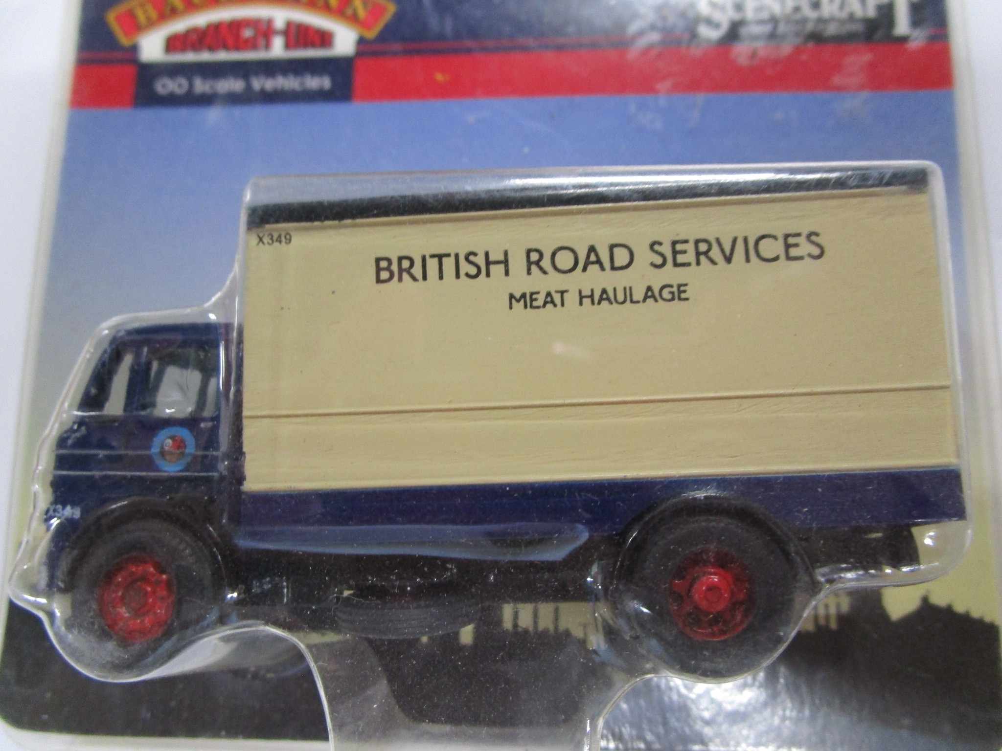 Bachmann Branchline Scenecraft three commercial vehicles British Road Meat haulage ,an early articulated lorry and a rigid lorry with Drainage pipe load.