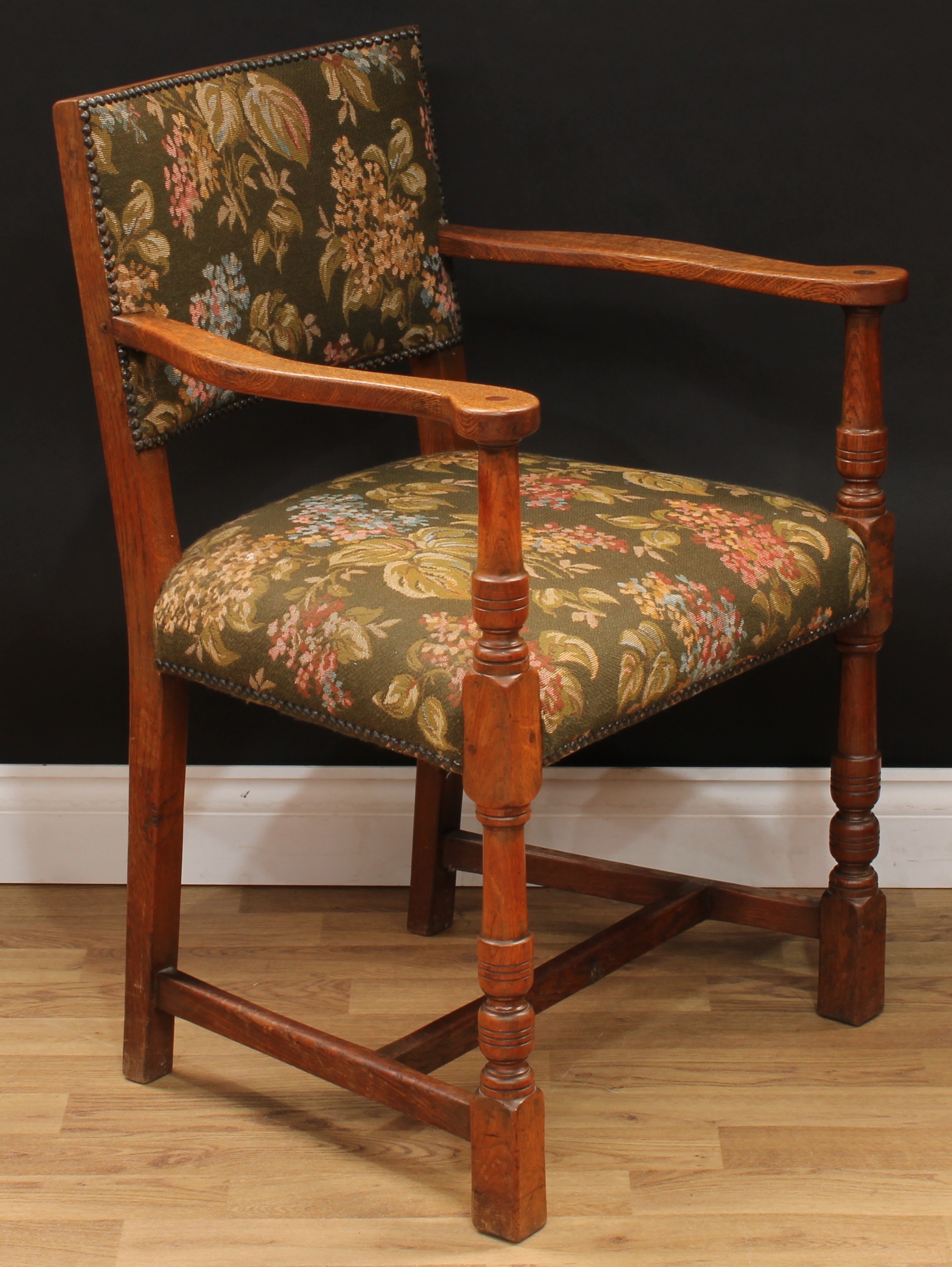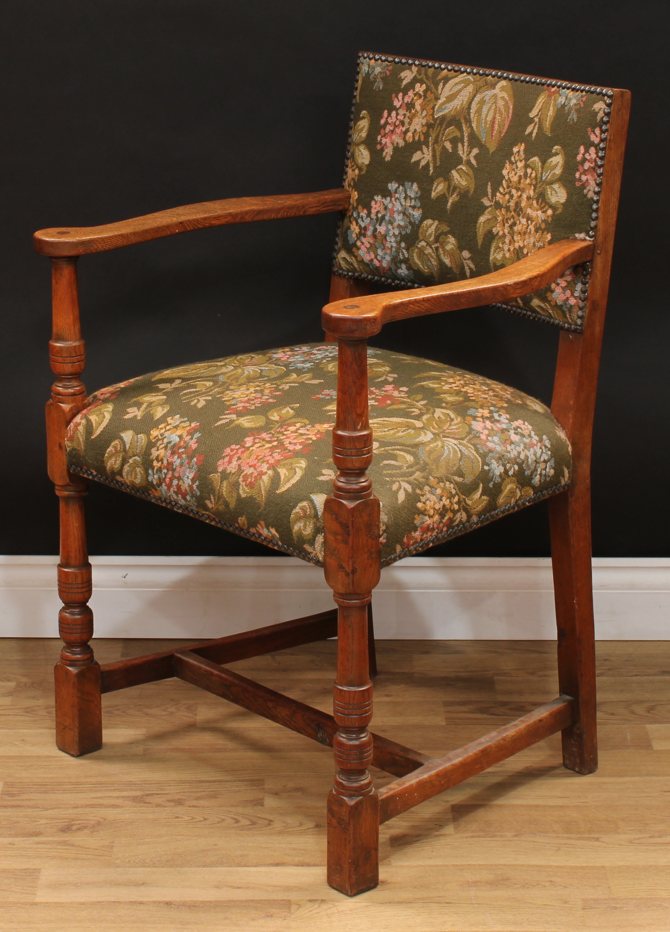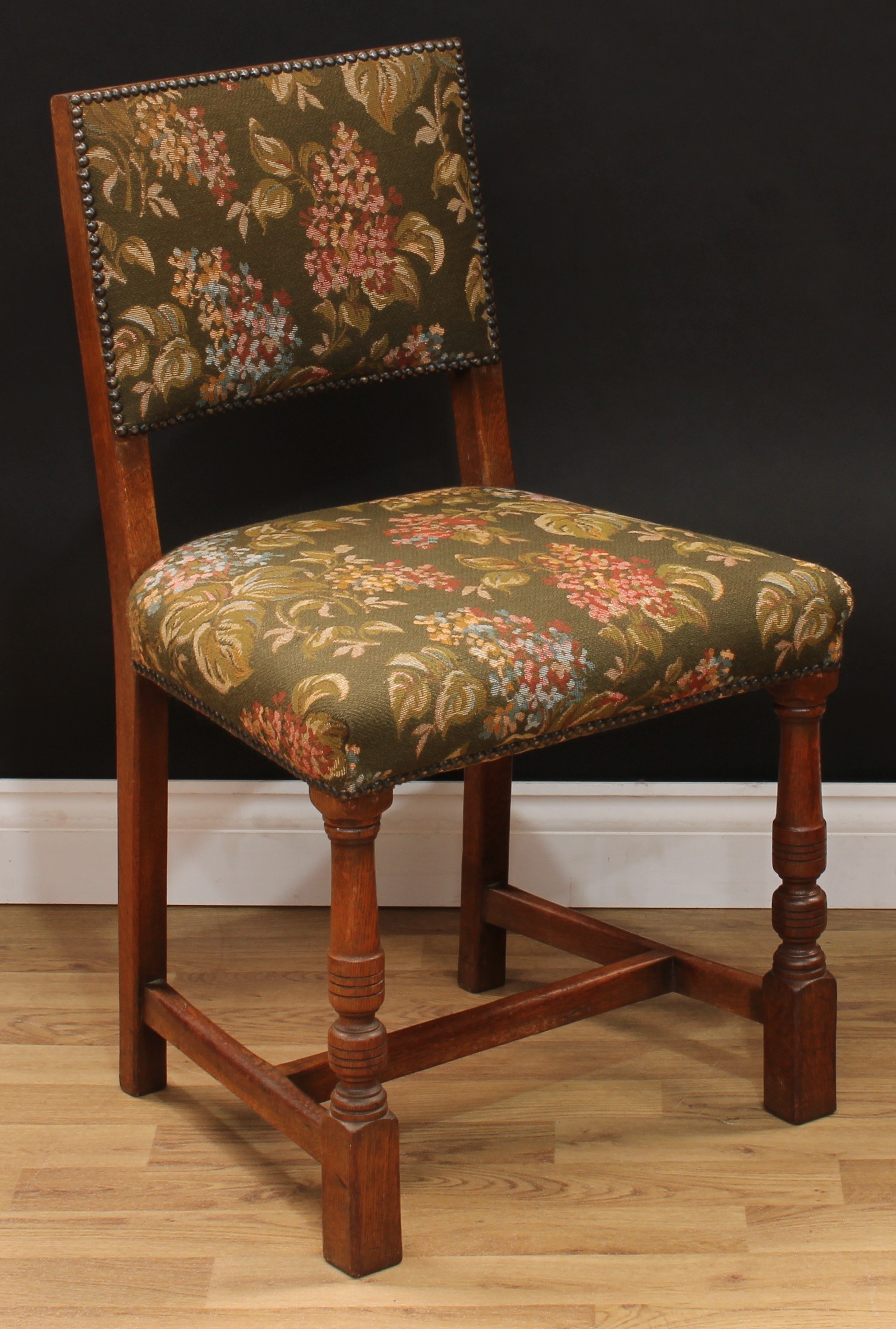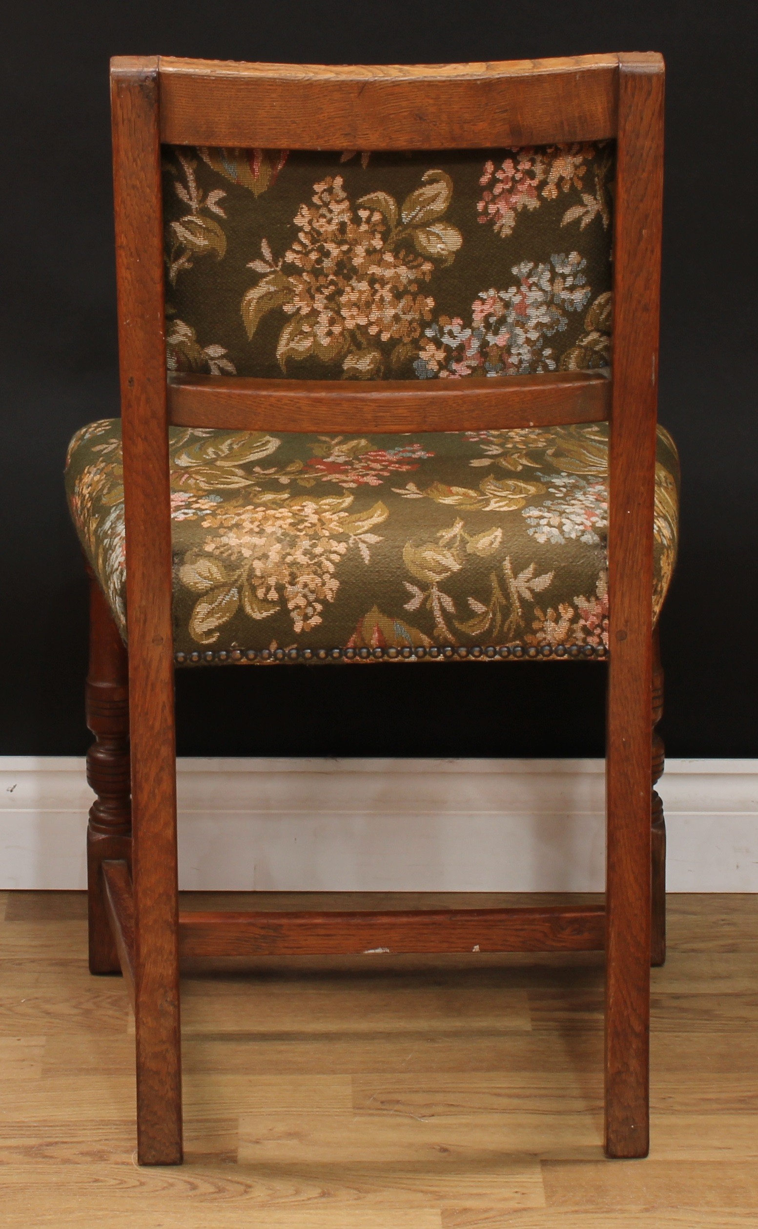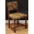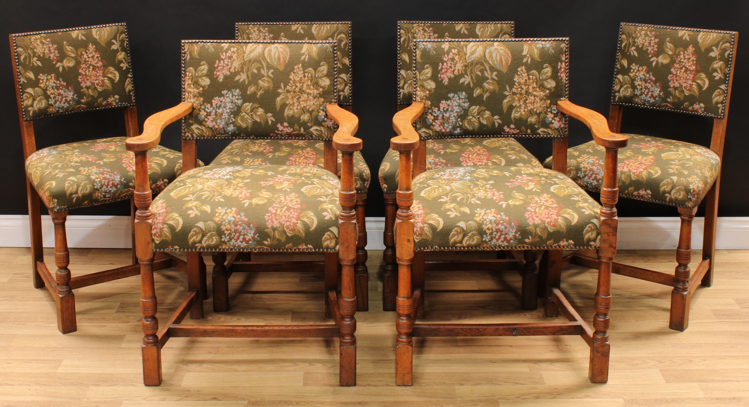 A set of six Cromwellian Revival oak dining chairs, comprising a pair of carvers and six side chairs, the carver 86.5cm high, 61.5cm wide, the seat 47cm wide and 40cm deep, the side chair 85cm high, 50cm wide, the seat 36cm deep (6)