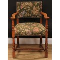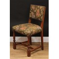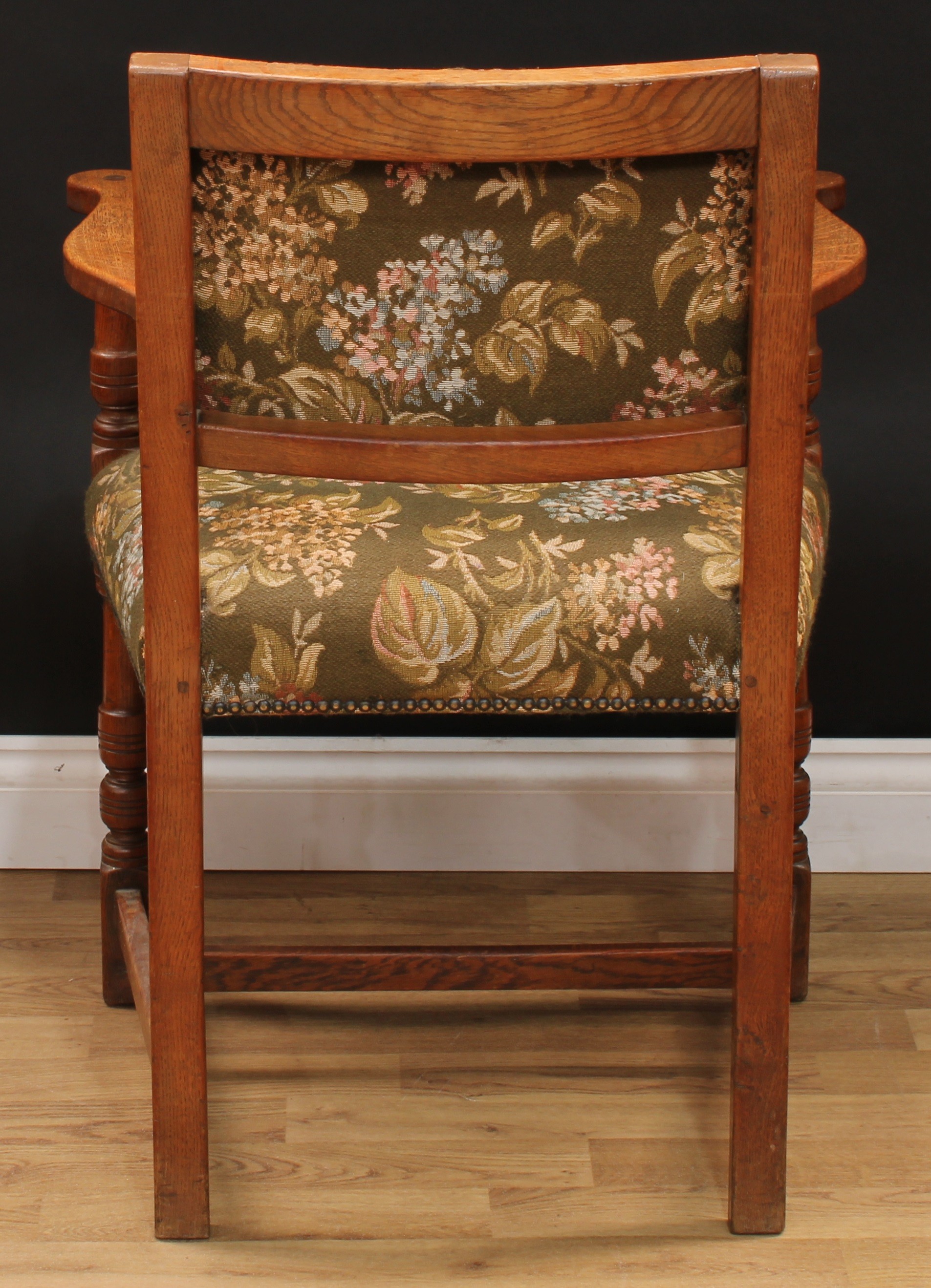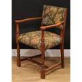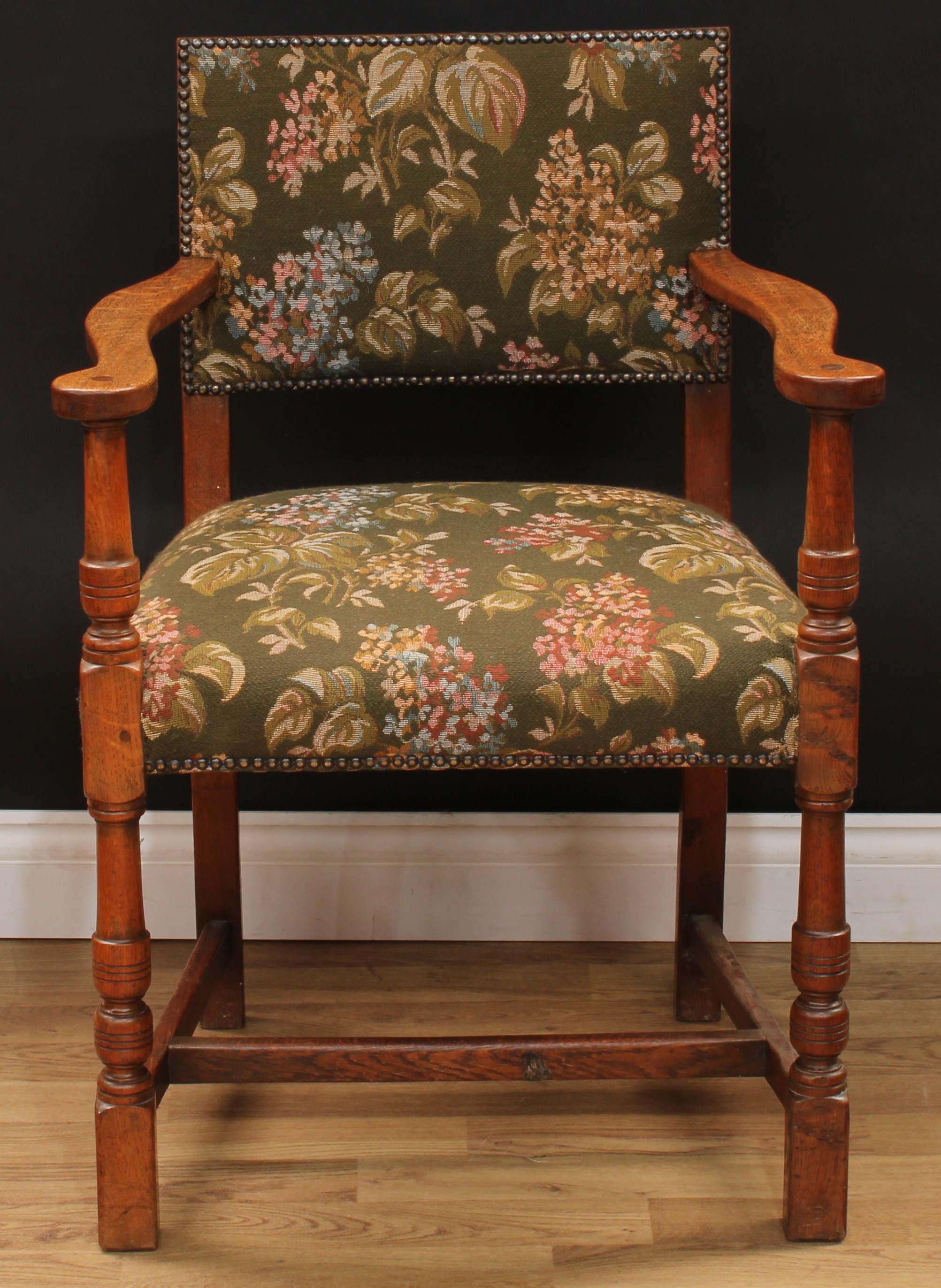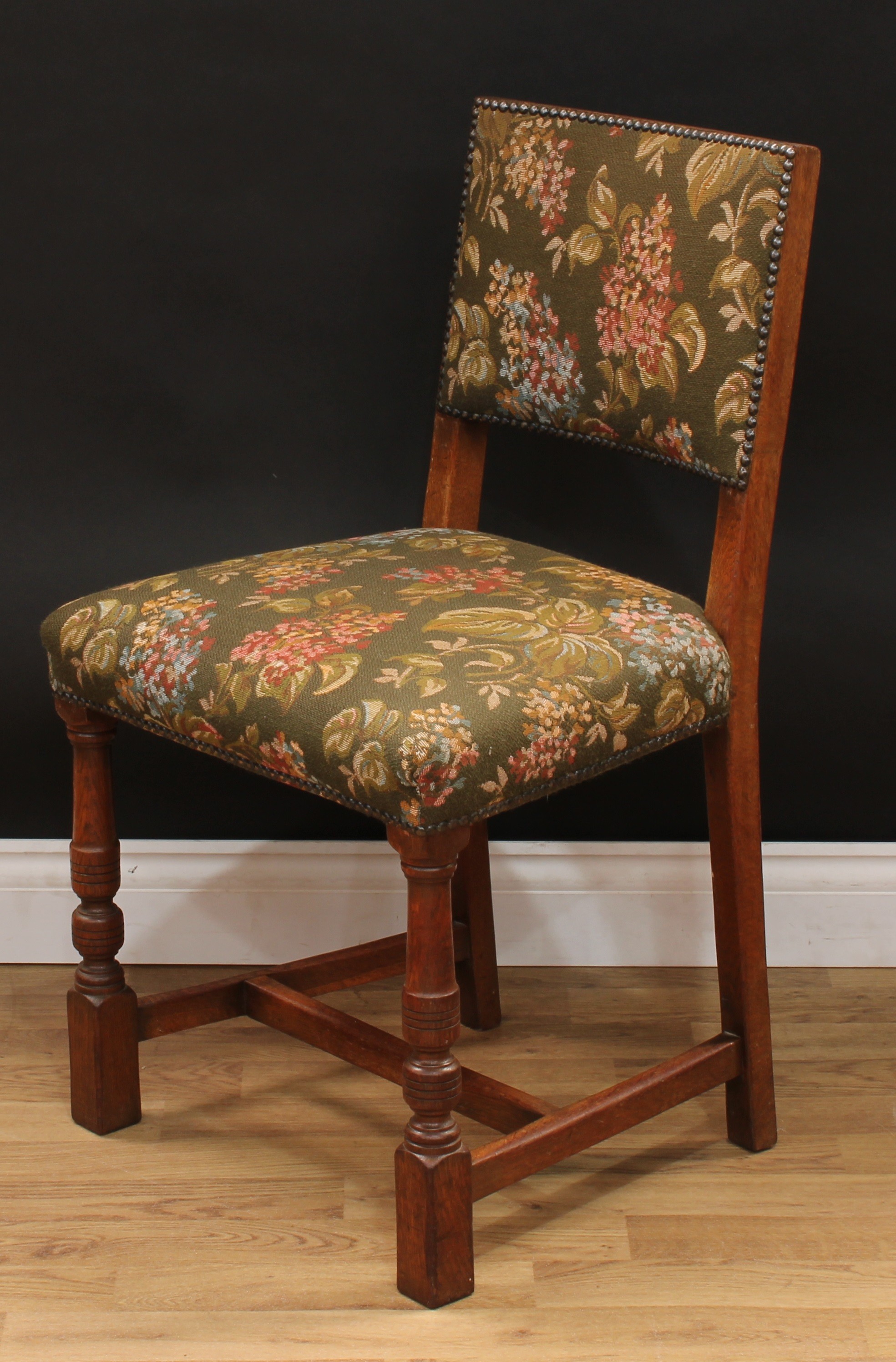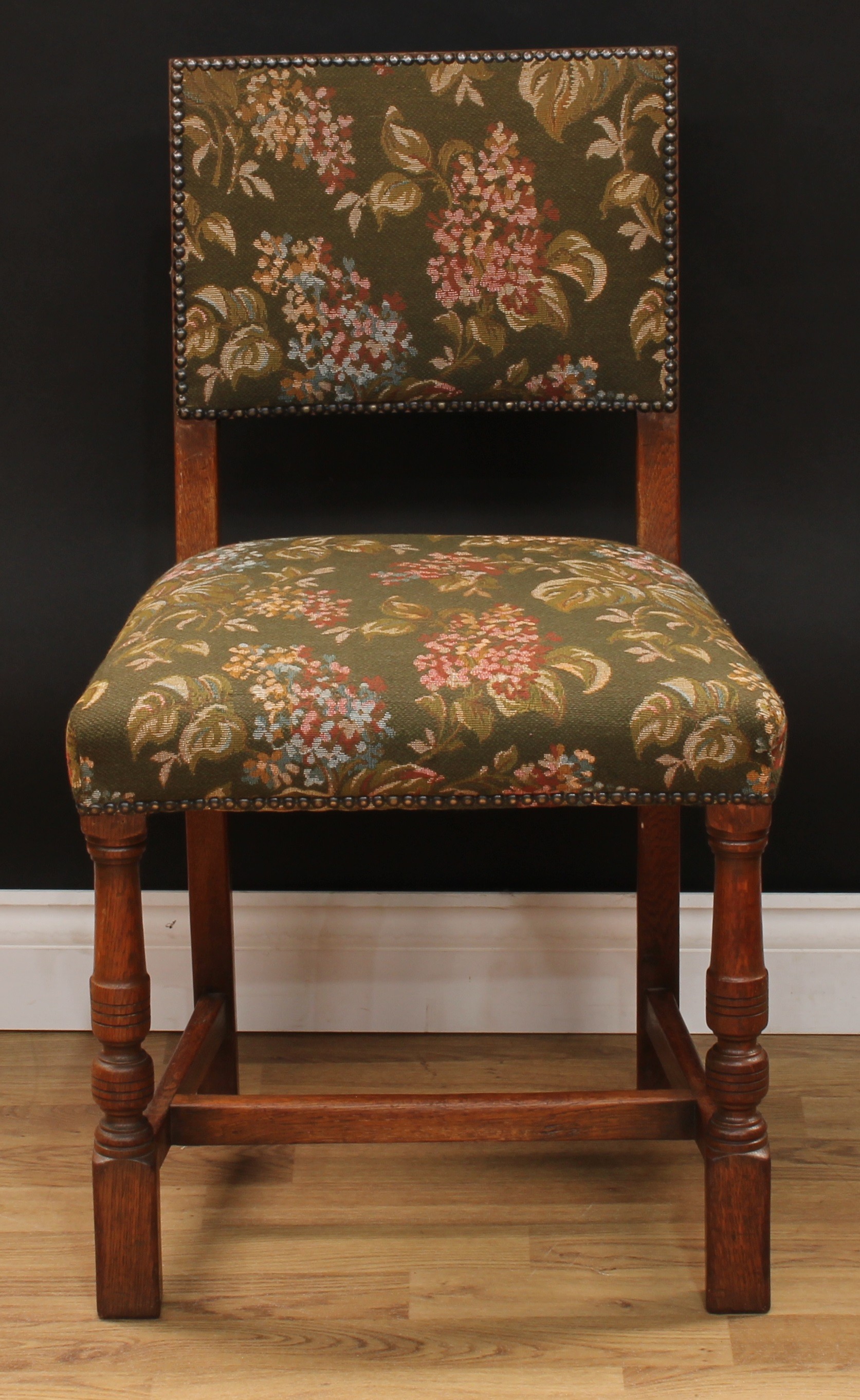 A set of six Cromwellian Revival oak dining chairs, comprising a pair of carvers and six side chairs, the carver 86.5cm high, 61.5cm wide, the seat 47cm wide and 40cm deep, the side chair 85cm high, 50cm wide, the seat 36cm deep (6)
