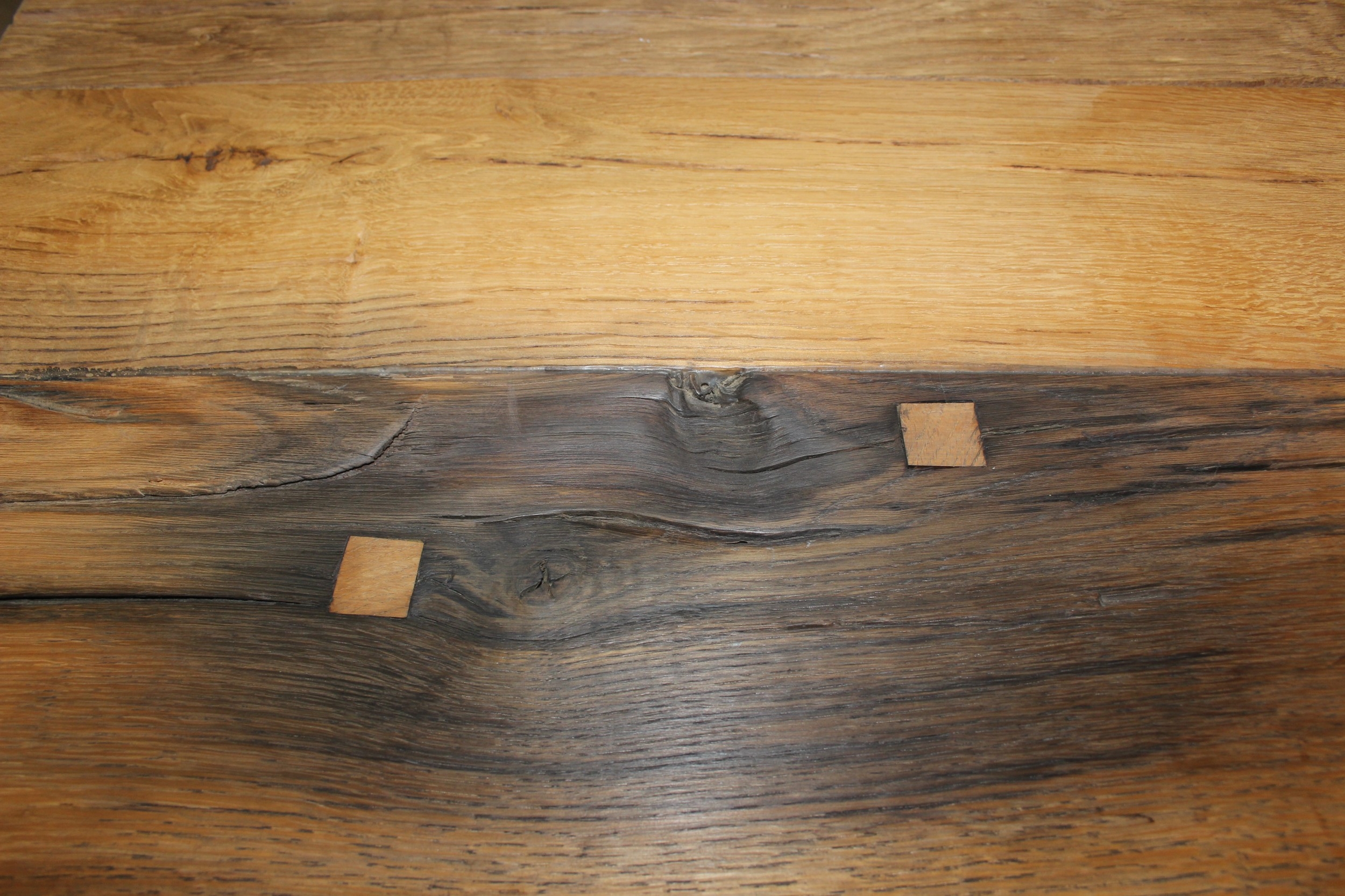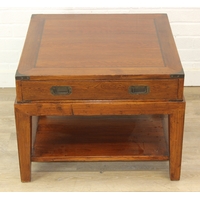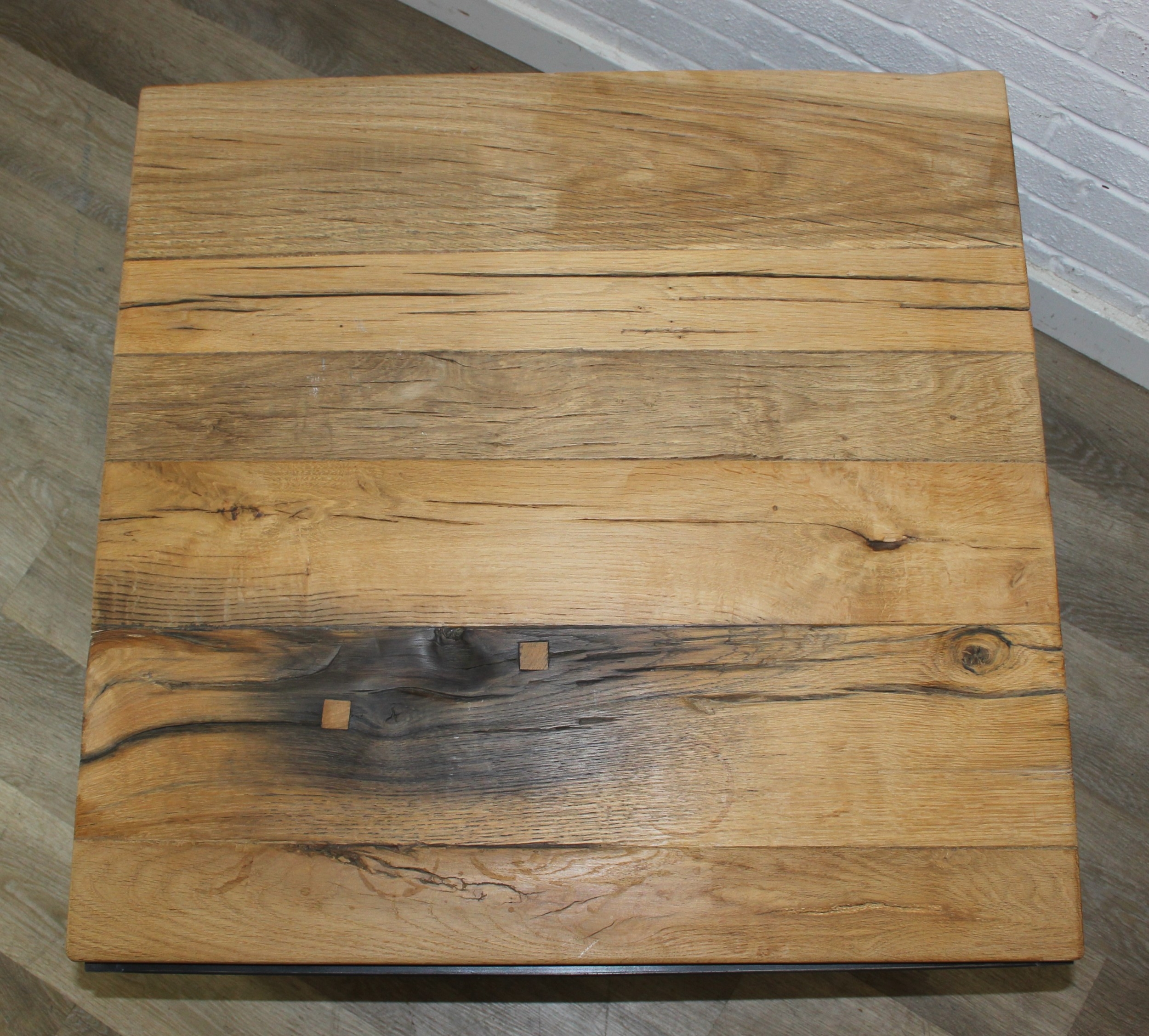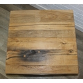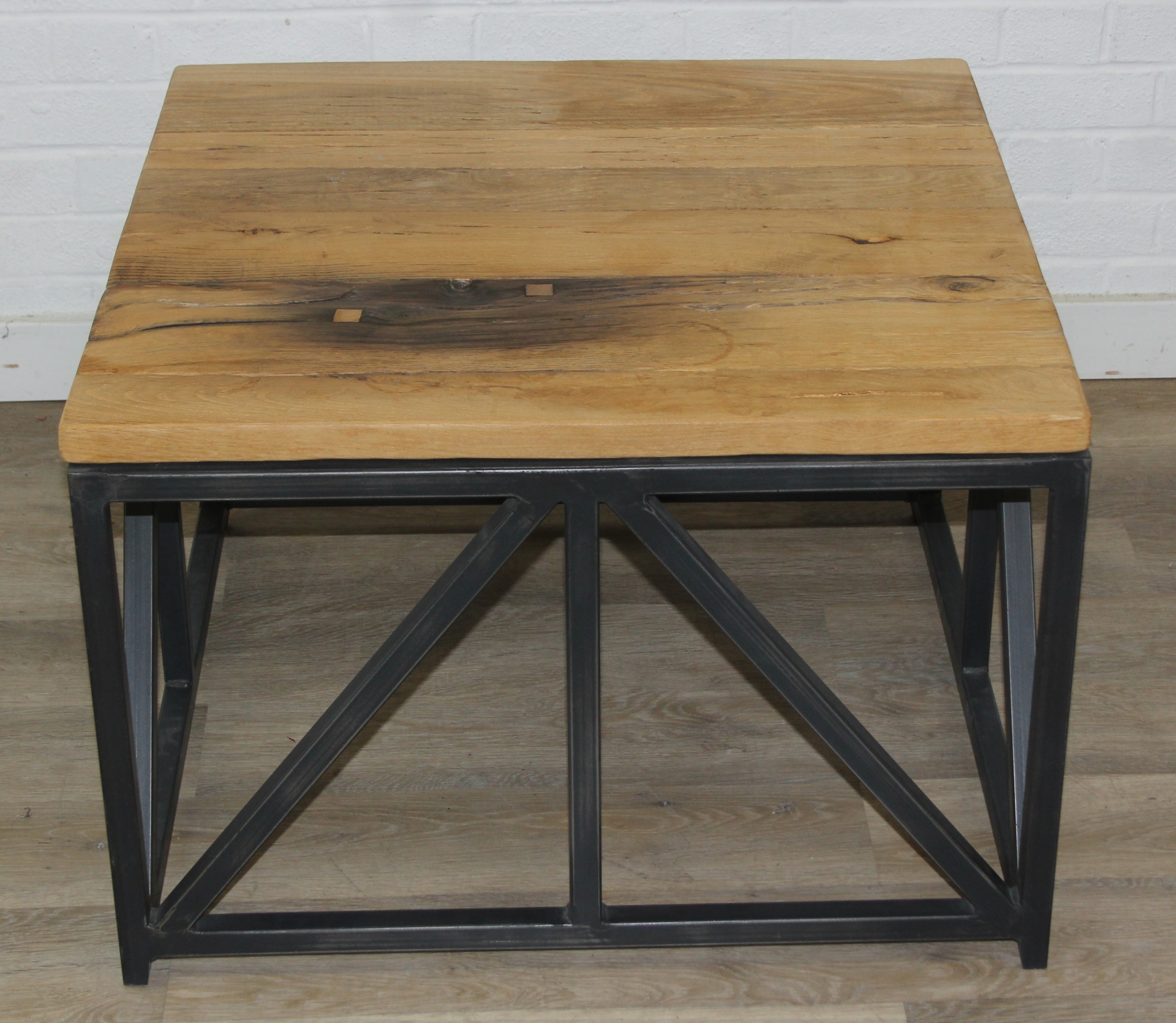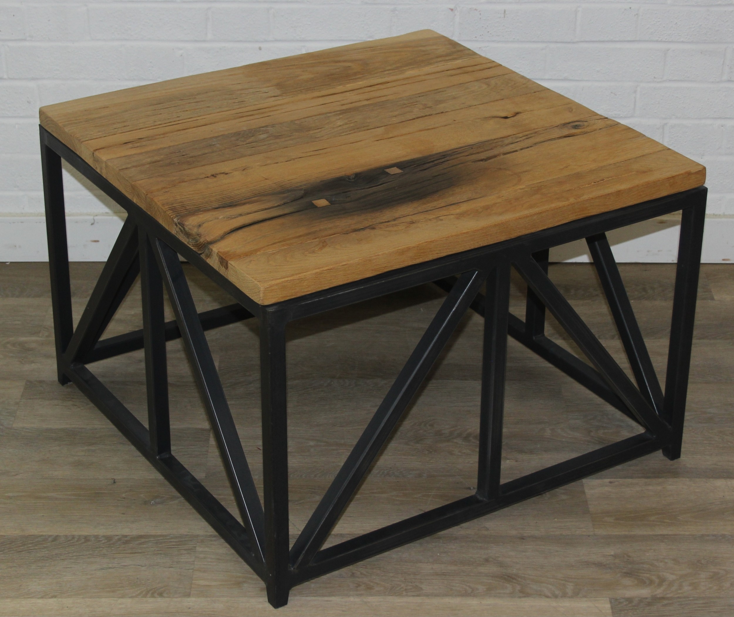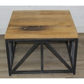 A good quality reclaimed wooden topped side table with wrought metal industrial style bases, 75cm x 75cm x 51cm, one of two in the sale
