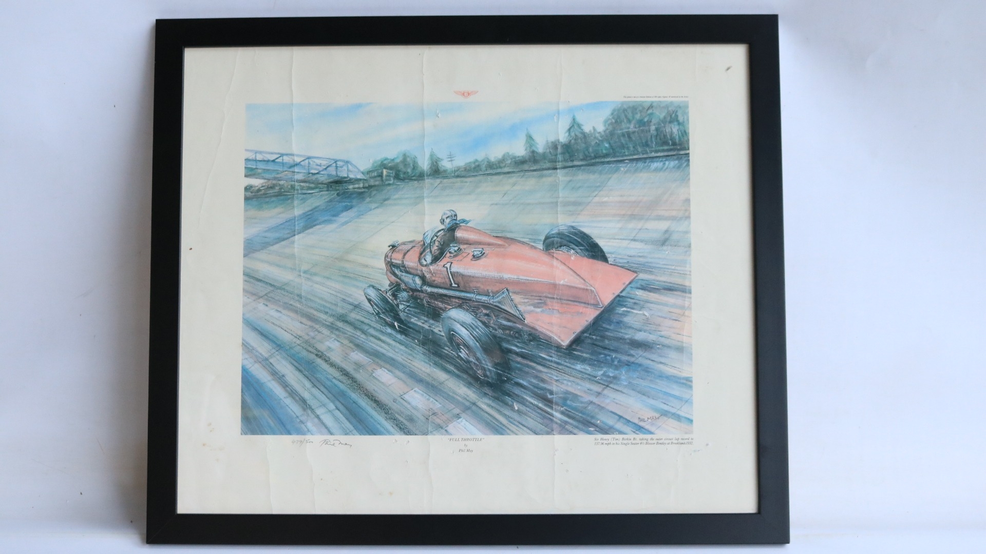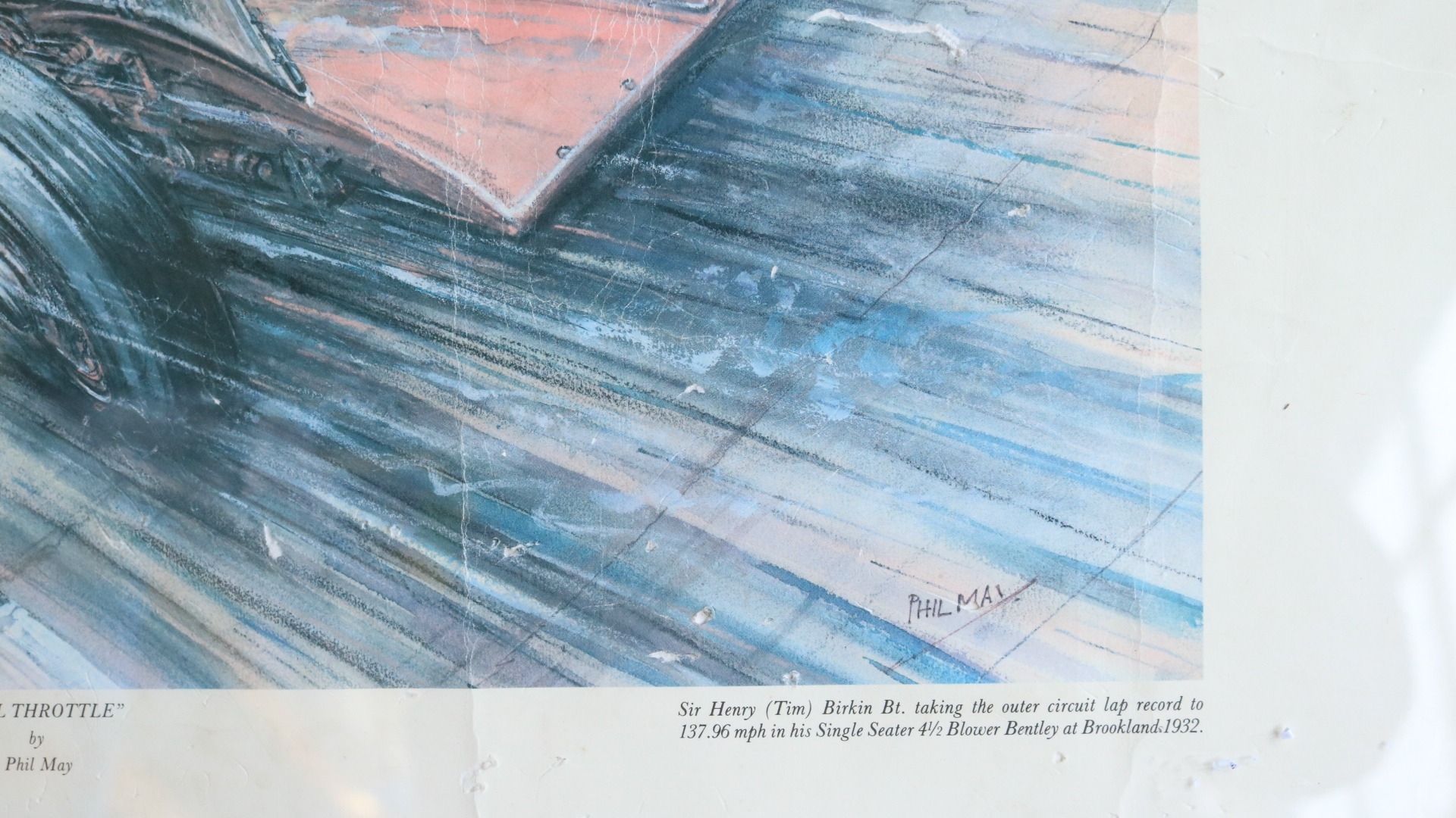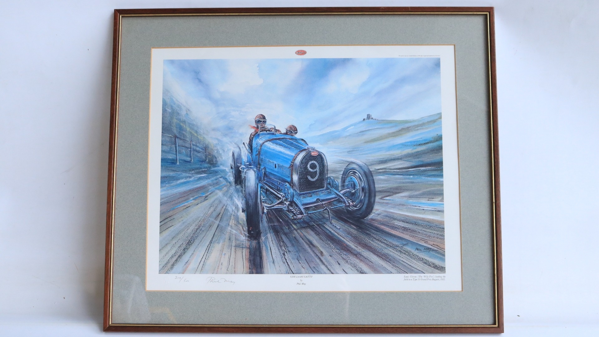 Three framed limited edition prints, all by Phil May, all numbered and signed in pencil by the artist to include 'The English Racing Automobile' (249/500, 60x50.5cm, very good condition with some very minor creasing to borders), 'Vive La Bugatti!' (219/500, 60.5x50.5cm, at least near mint) and 'Full Throttle' (479/500, 62.6x52.5cm, fair creased condition, some light staining etc.), all frames at least very good Shipping POA https://www.bradleys.ltd/quotation-request-form