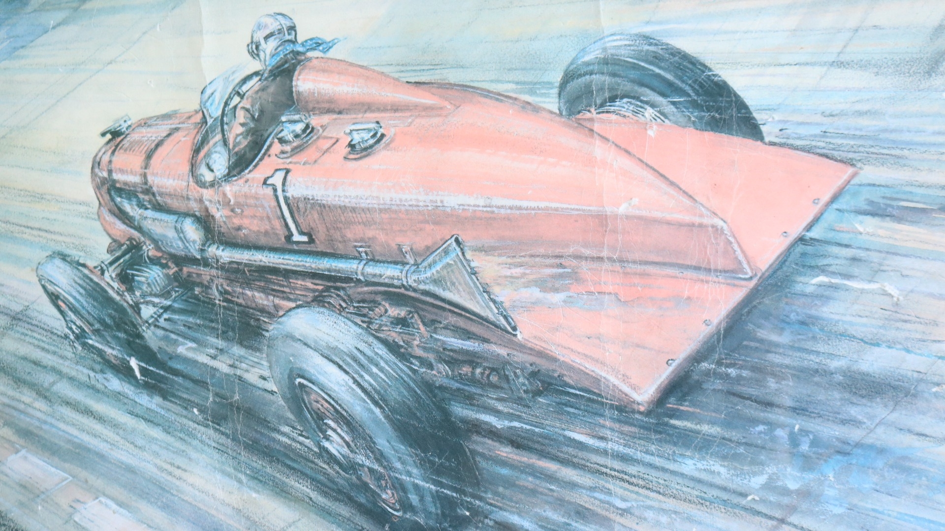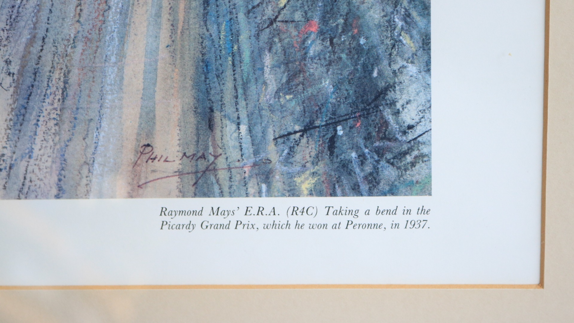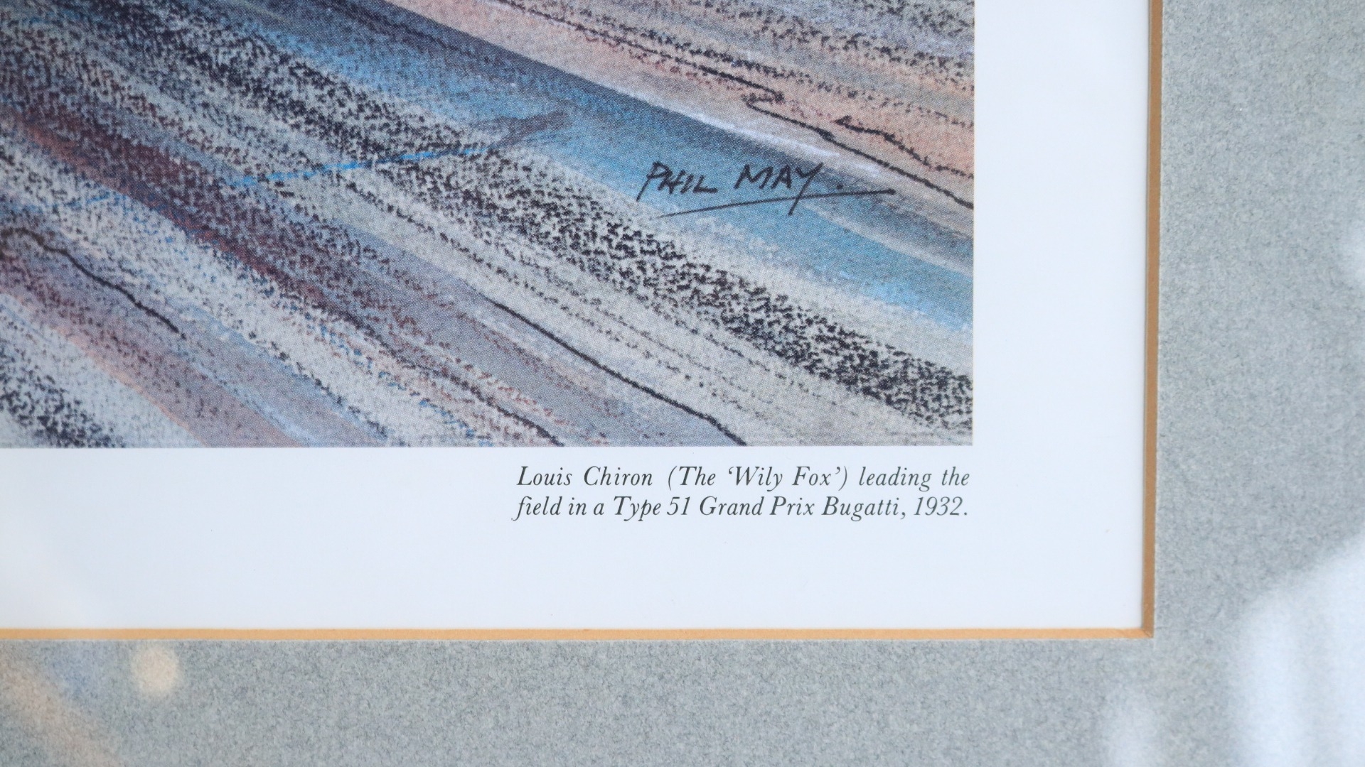 Three framed limited edition prints, all by Phil May, all numbered and signed in pencil by the artist to include 'The English Racing Automobile' (249/500, 60x50.5cm, very good condition with some very minor creasing to borders), 'Vive La Bugatti!' (219/500, 60.5x50.5cm, at least near mint) and 'Full Throttle' (479/500, 62.6x52.5cm, fair creased condition, some light staining etc.), all frames at least very good Shipping POA https://www.bradleys.ltd/quotation-request-form