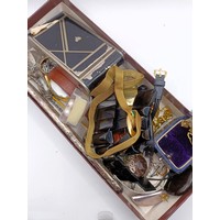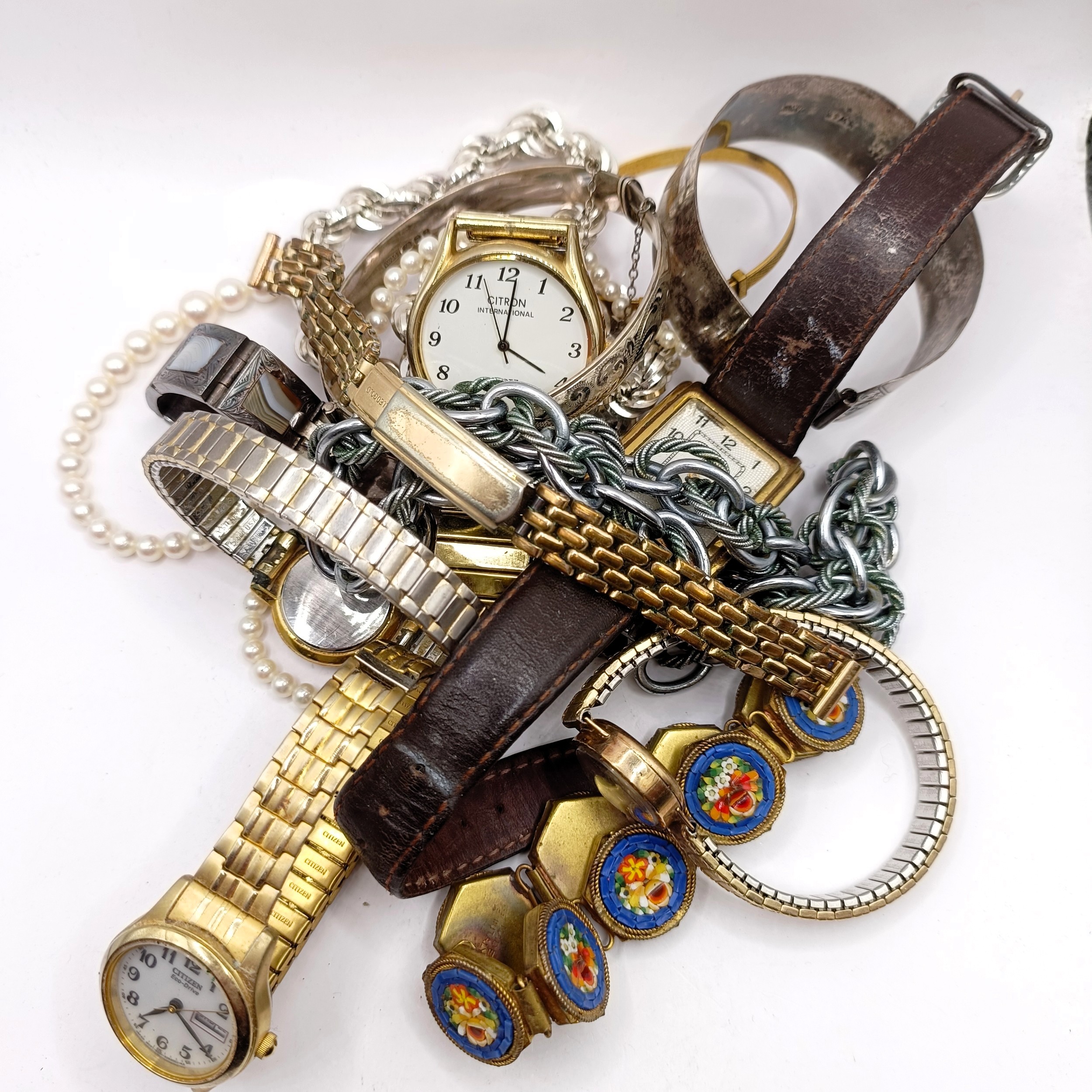 A silver bangle, another, a gilt metal bangle, assorted costume jewellery and dress watches