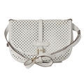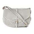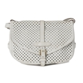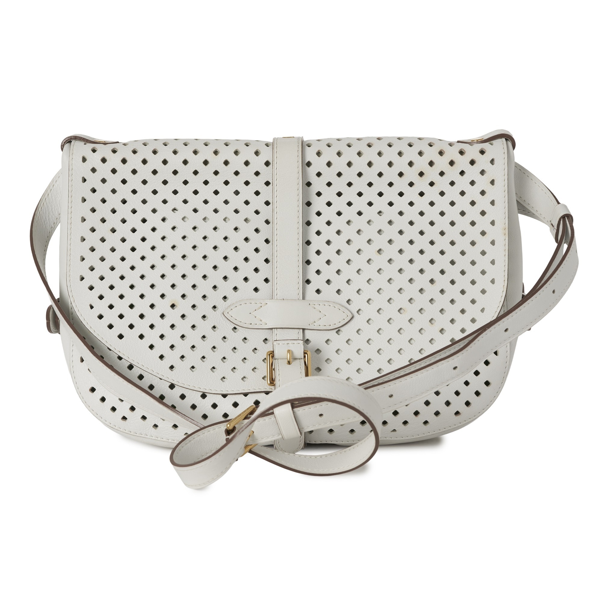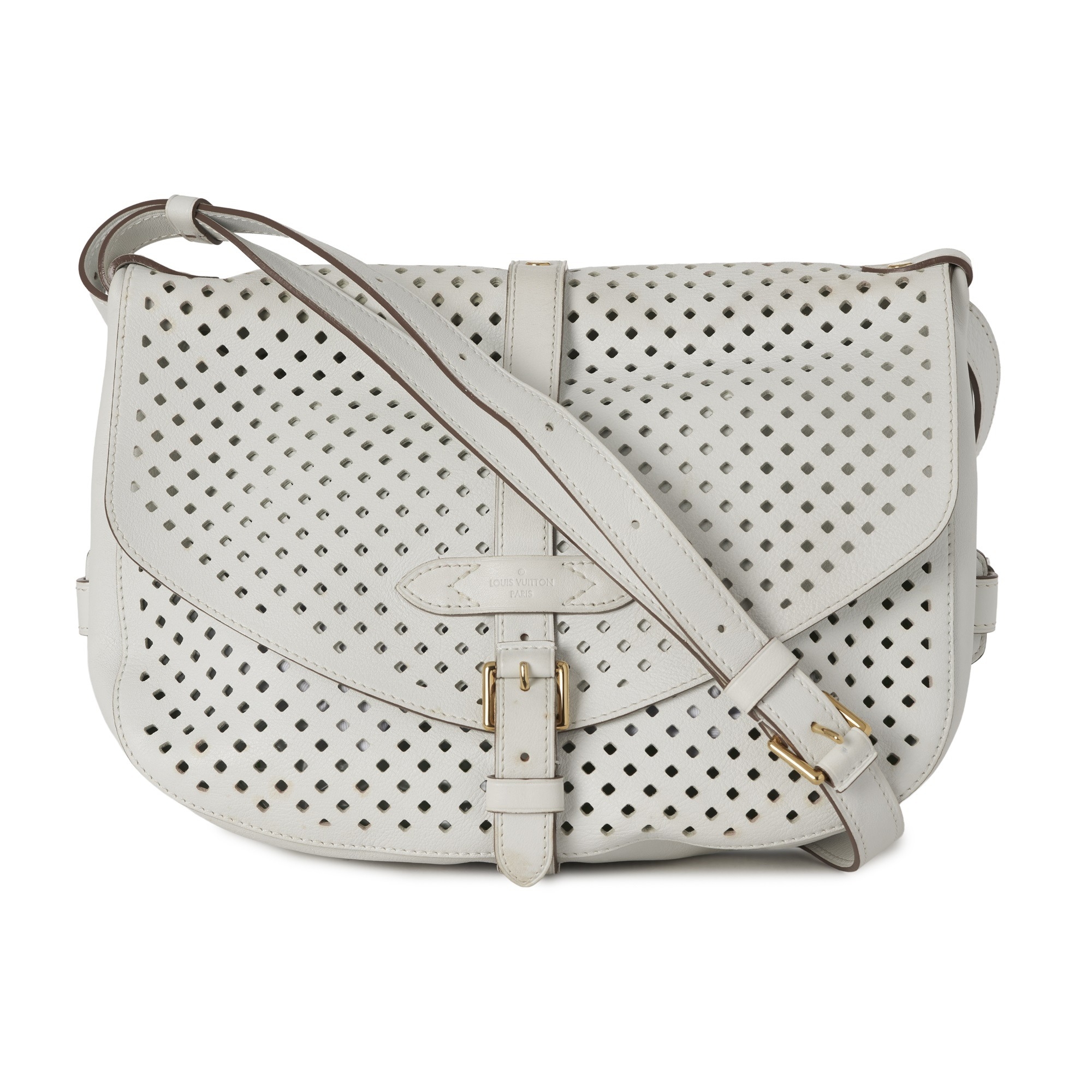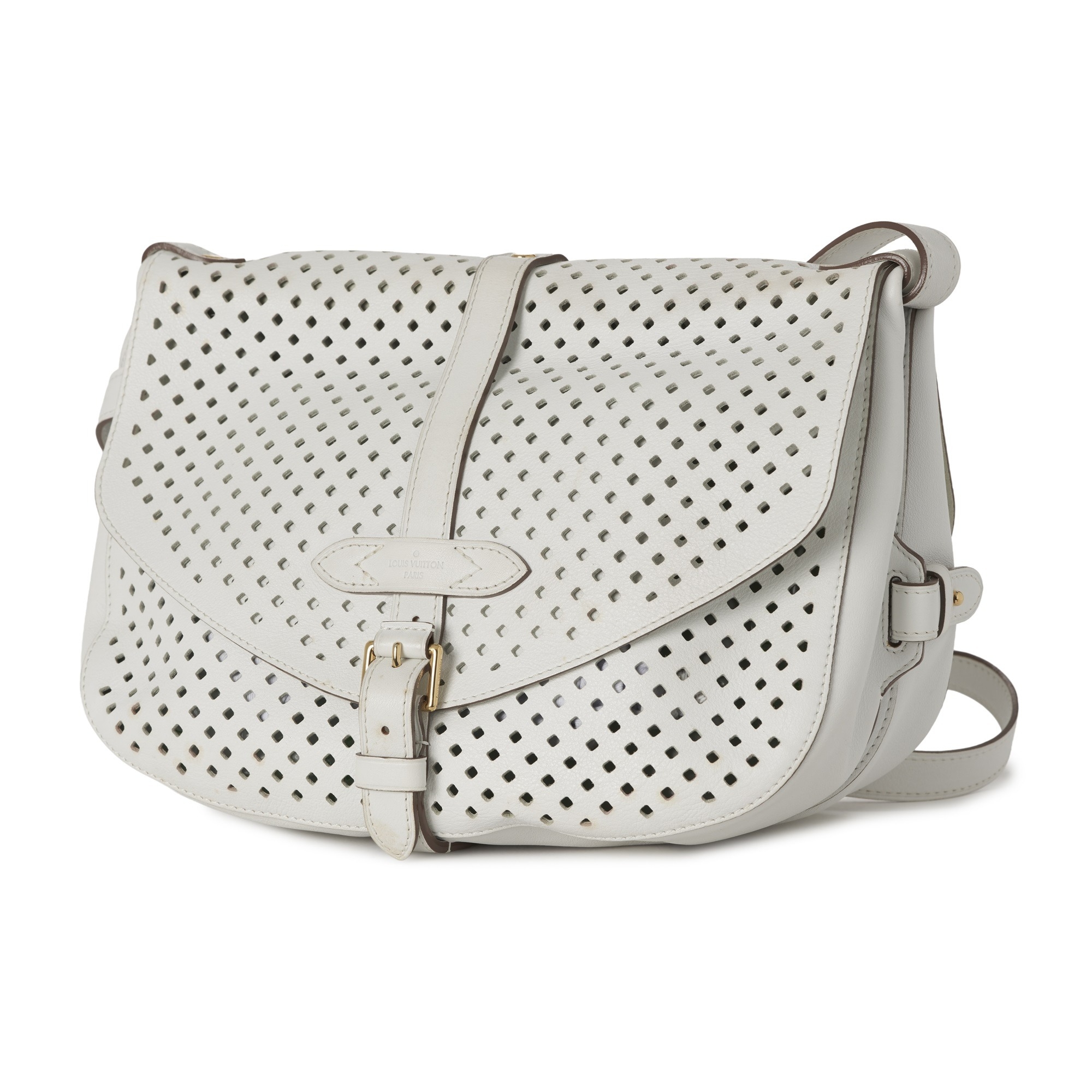 Louis Vuitton x Sofia Coppola, a Flore Perforated Saumur handbag, crafted from perforated white leather, with an adjustable leather shoulder strap and multiple belt straps, featuring two main compartments with top flap closures and single buckle front and back fastenings, measuring 15 by 22 by 30cm