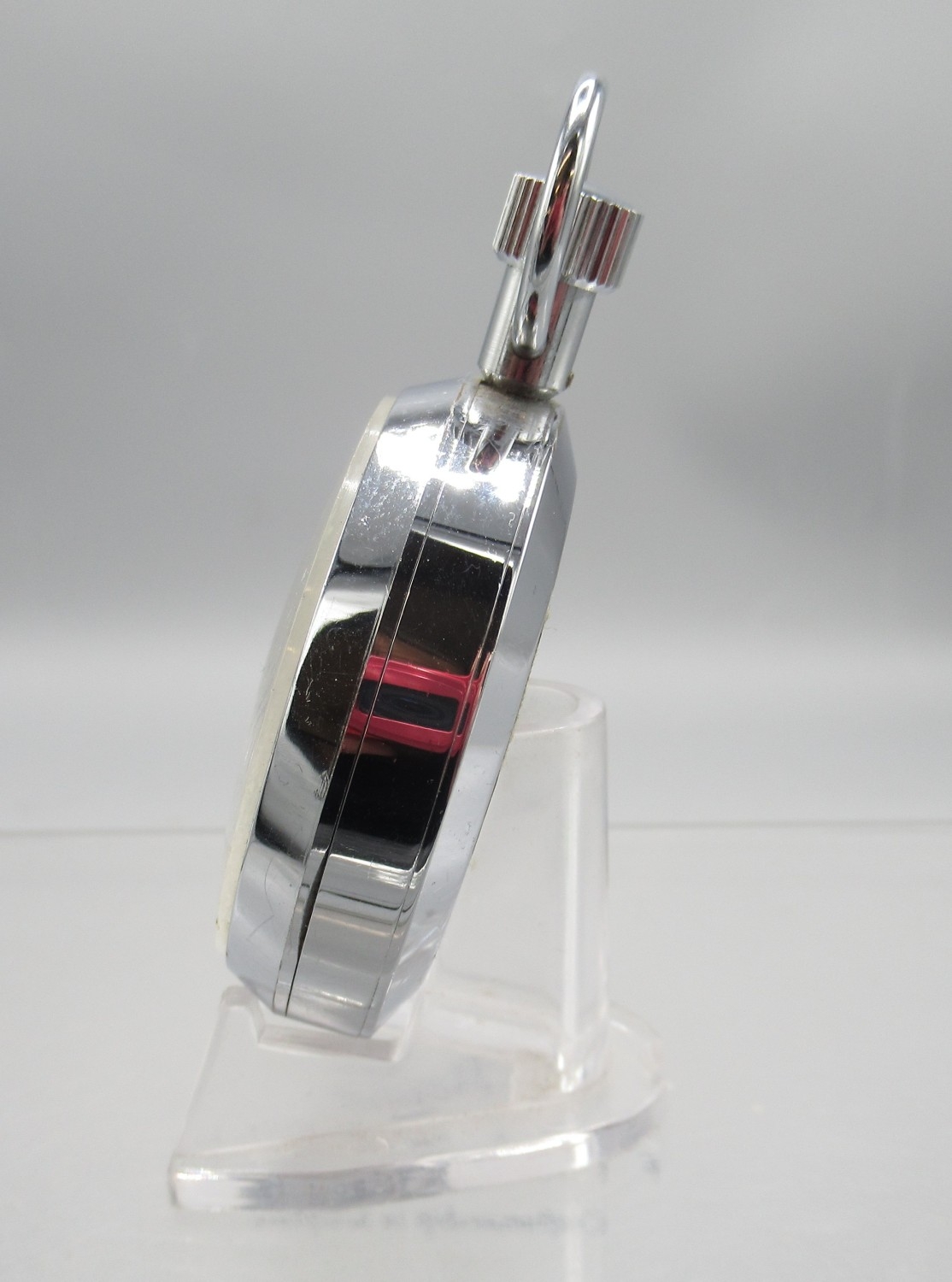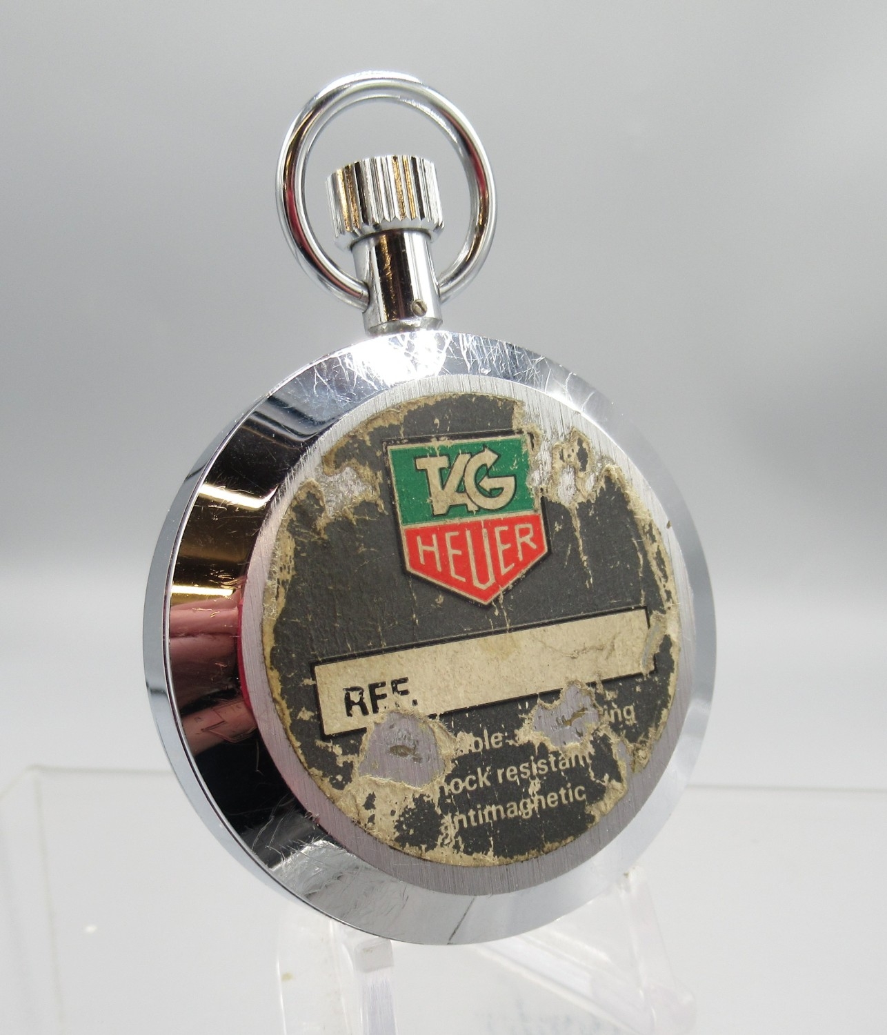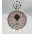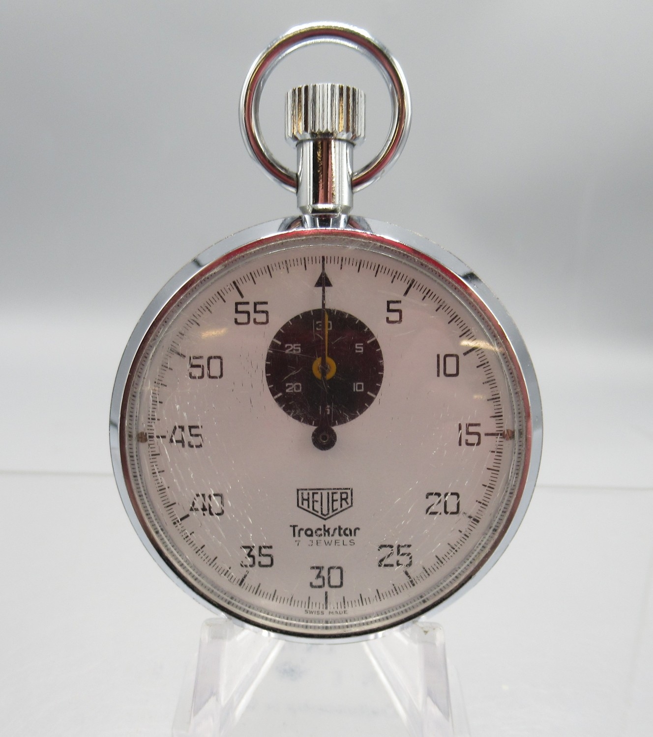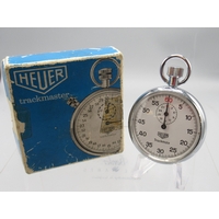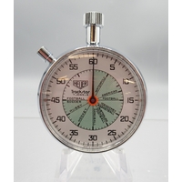 Heuer Trackstar chrome stopwatch, signed white Arabic dial with 30 minute black subsidiary dial, snap on case back, 7 jewel movement, D53.5mm