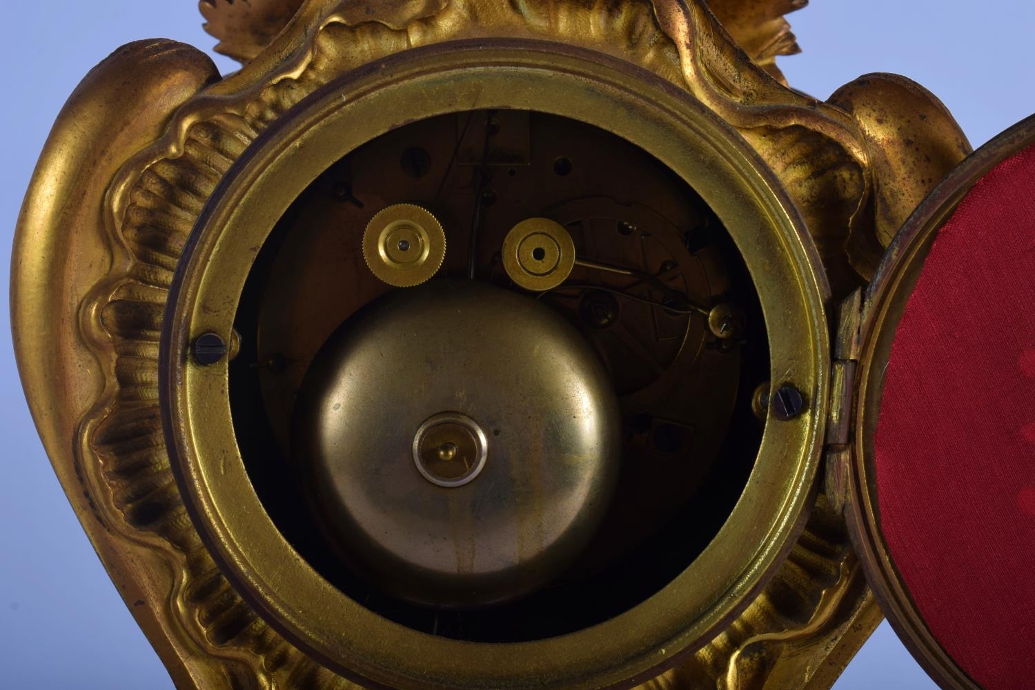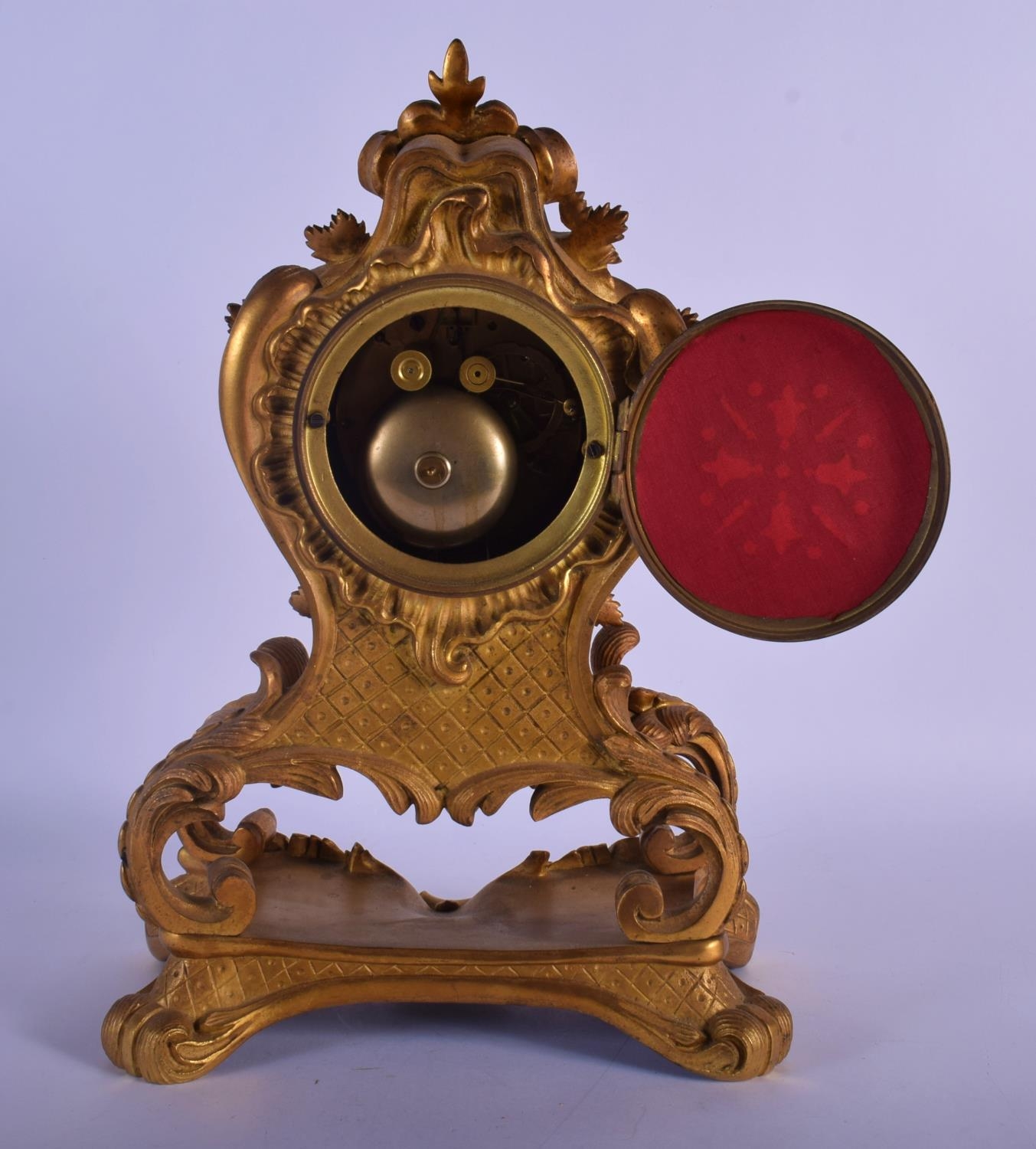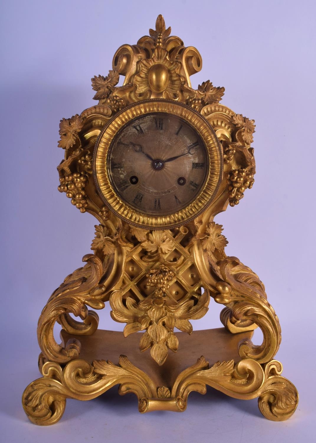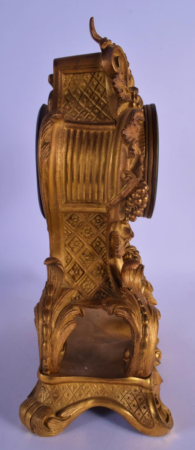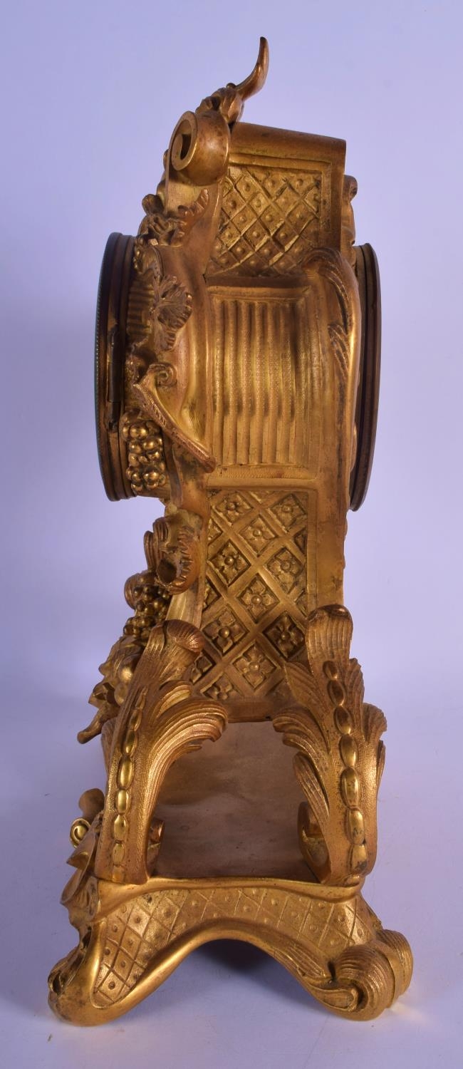 A LOVELY 19TH CENTURY FRENCH ORMOLU MANTEL CLOCK overlaid with scrolling acanthus and hanging berries. 34 cm x 18 cm.