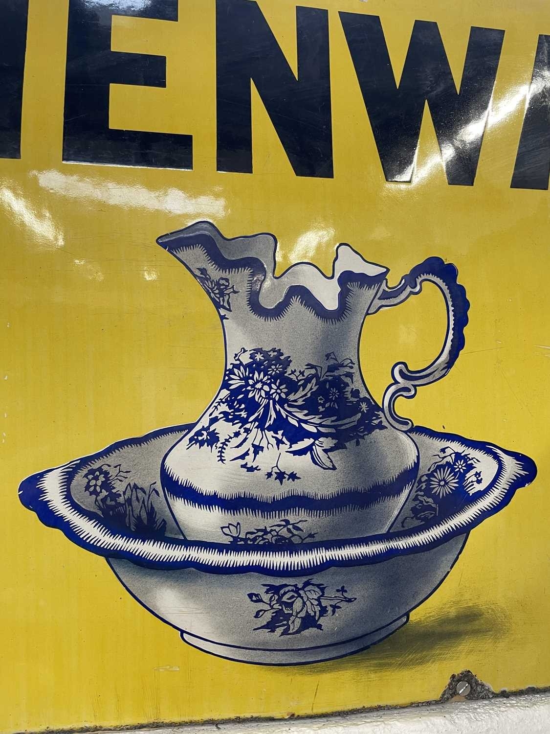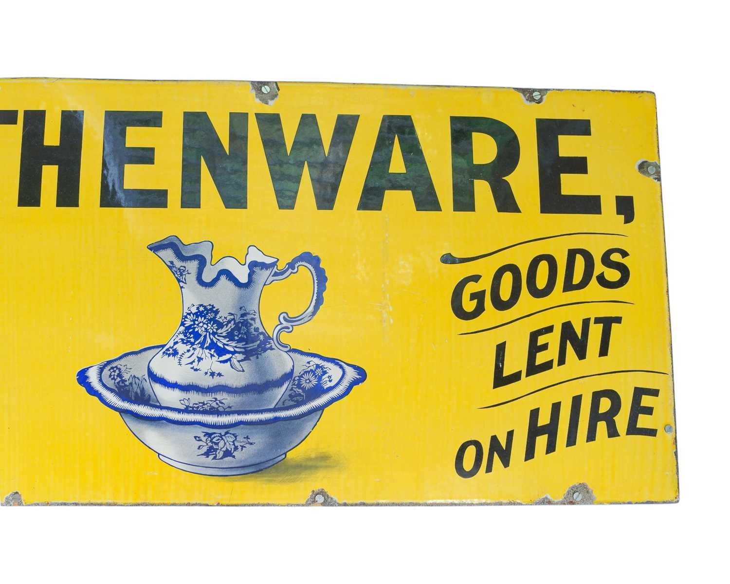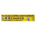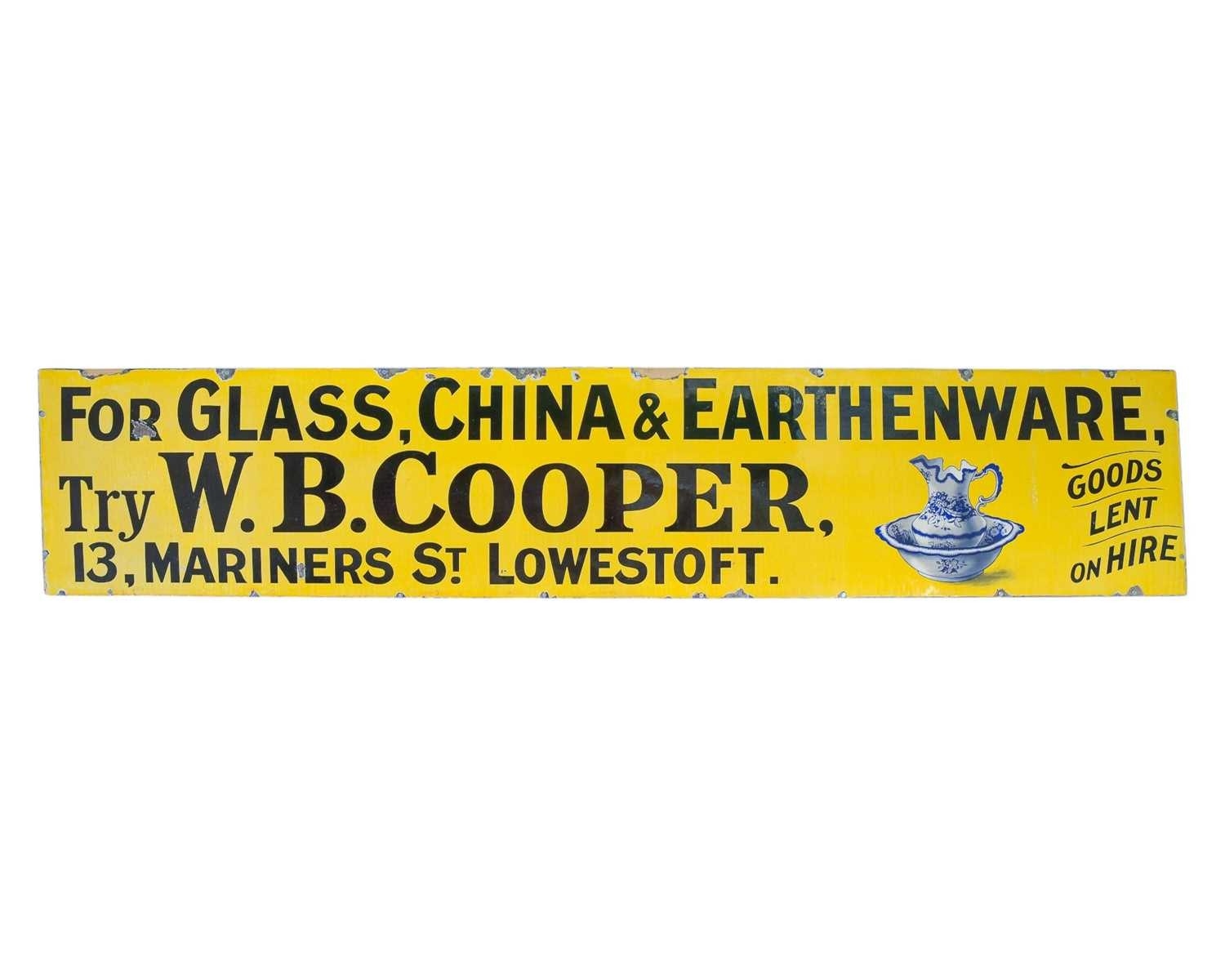 A W.B. Cooper Lowestoft enamel advertising sign. Early 20th century, yellow ground with black font '13 Mariner's Street, For Glass, China & Earthenware', the sign has been attached to a piece of batten for strengthening, height 48cm, width 241cm, depth 2.5cm. Aside from the strengthening battens, in our opinion this is in good original condition. There are some very small areas where black paint has been used to re-touch lettering that has lost an edge to damage, but these are minor. (see photos)