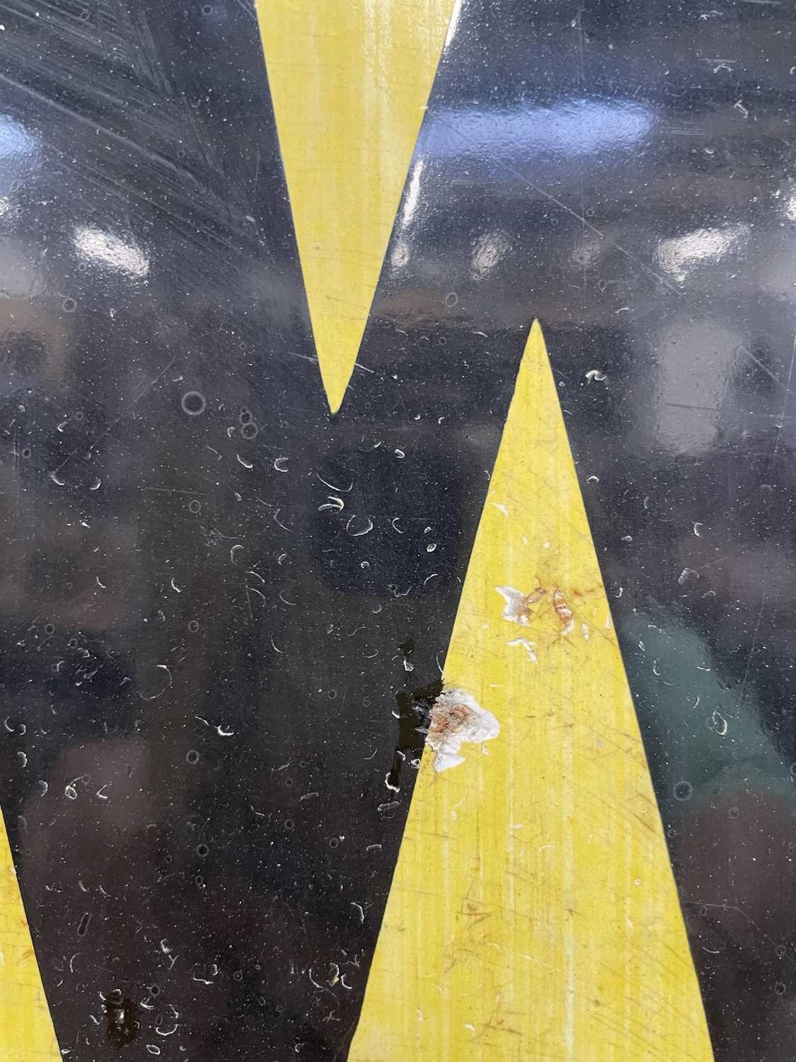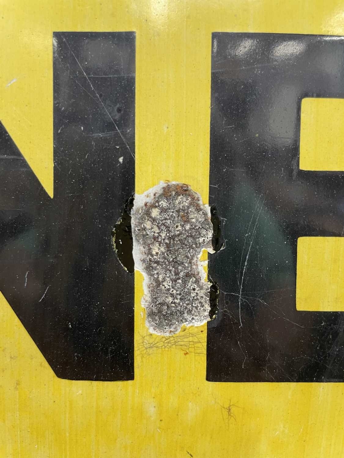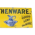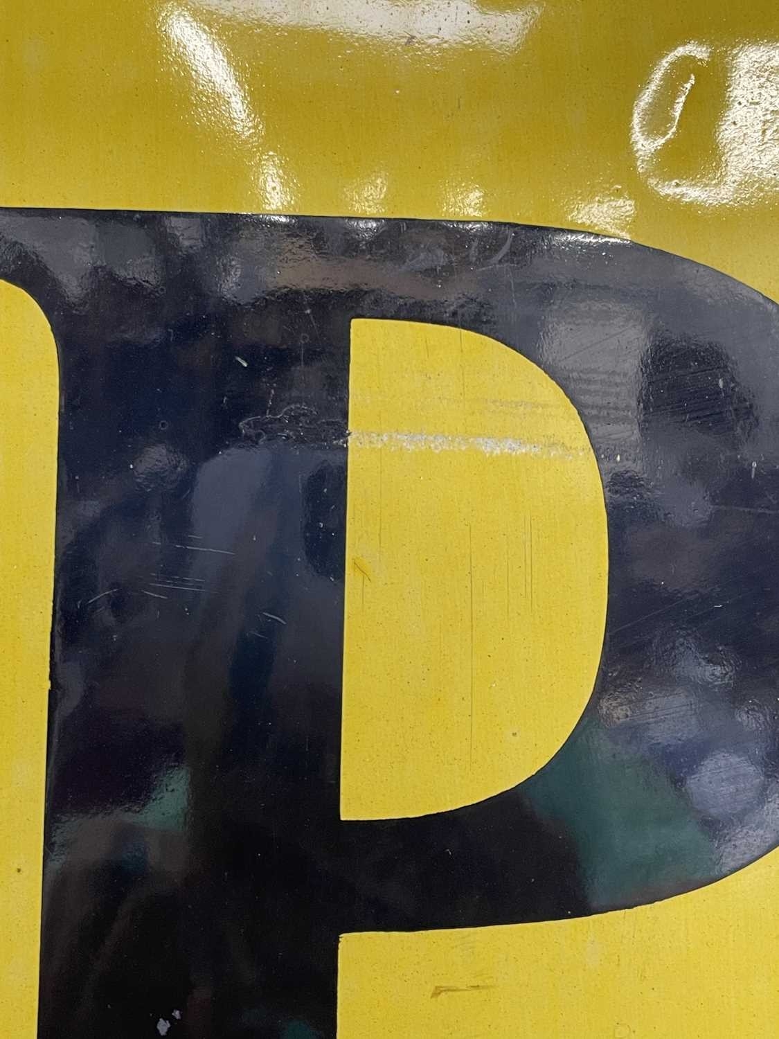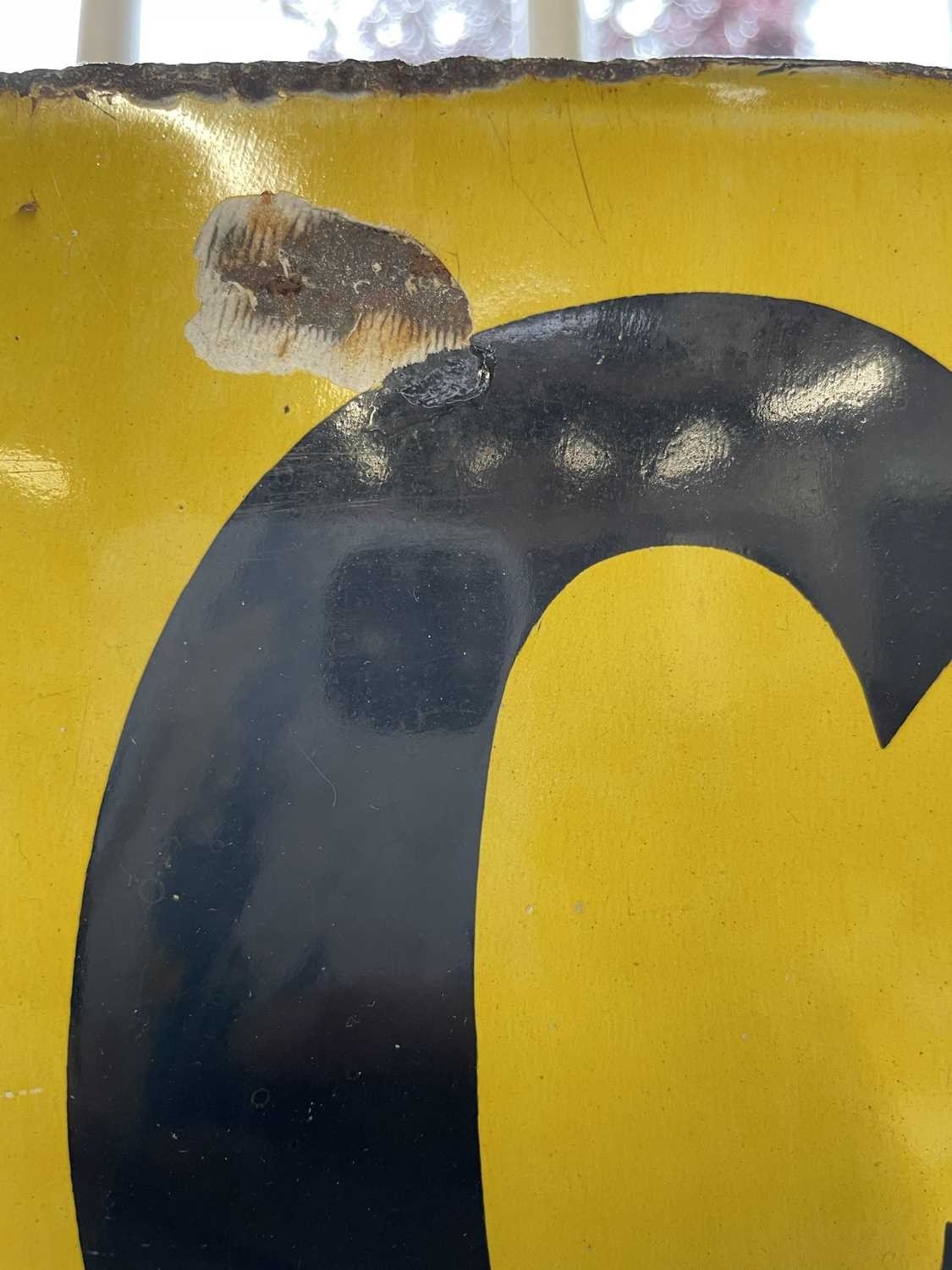 A W.B. Cooper Lowestoft enamel advertising sign. Early 20th century, yellow ground with black font '13 Mariner's Street, For Glass, China & Earthenware', the sign has been attached to a piece of batten for strengthening, height 48cm, width 241cm, depth 2.5cm. Aside from the strengthening battens, in our opinion this is in good original condition. There are some very small areas where black paint has been used to re-touch lettering that has lost an edge to damage, but these are minor. (see photos)
