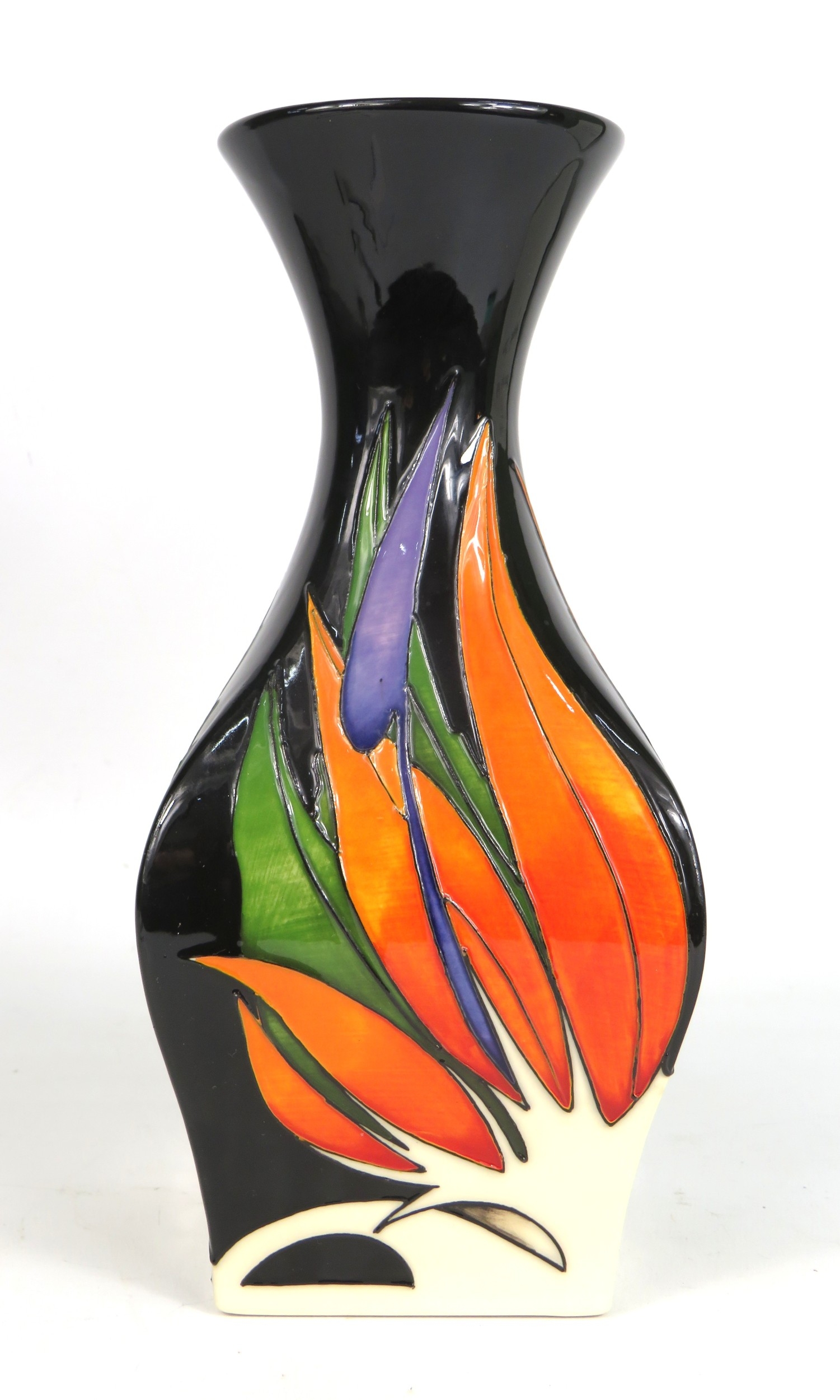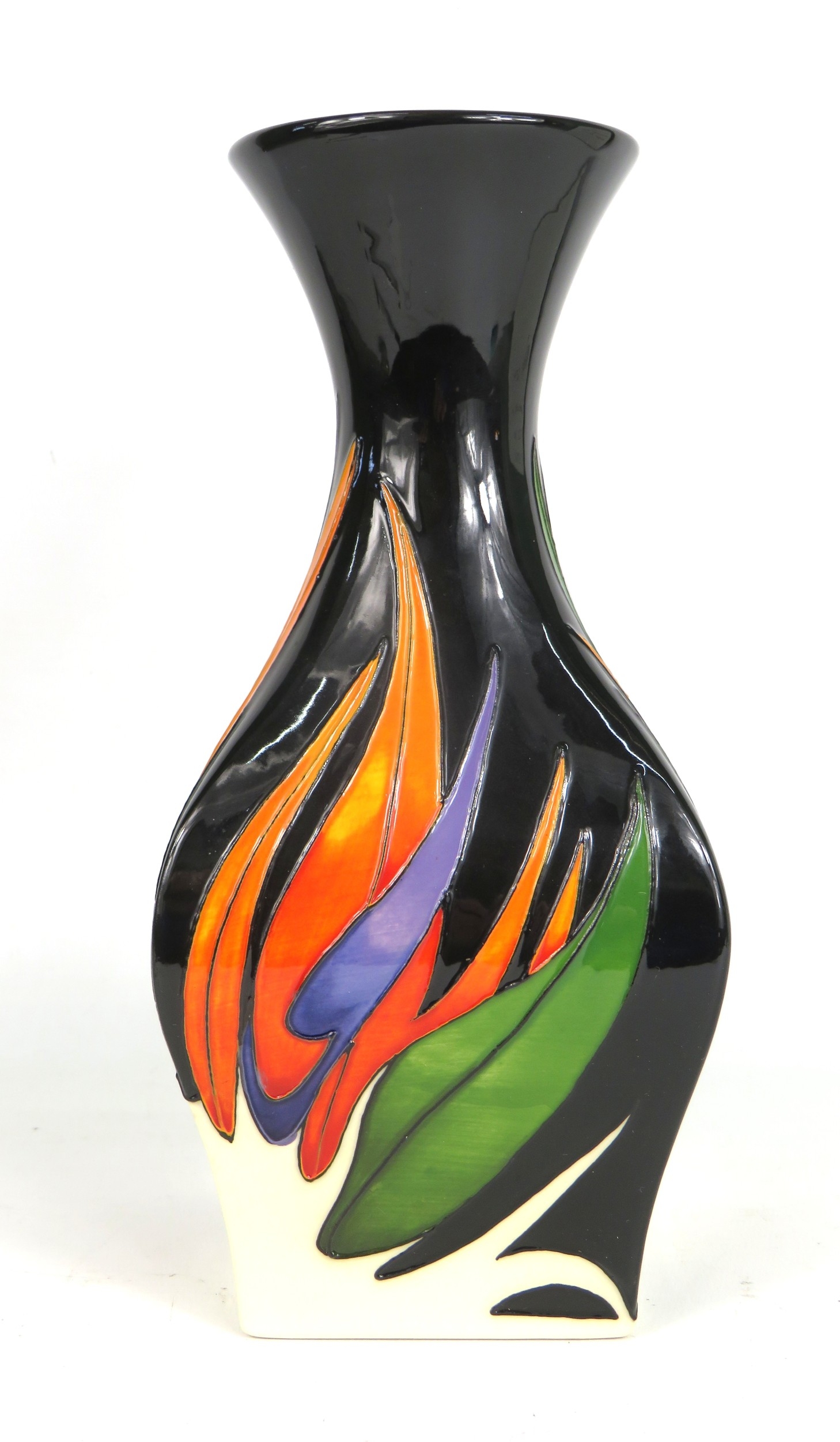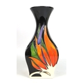 Moorcroft vase Paradise Found pattern with multicolour flame design on black ground - 25cm tall