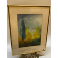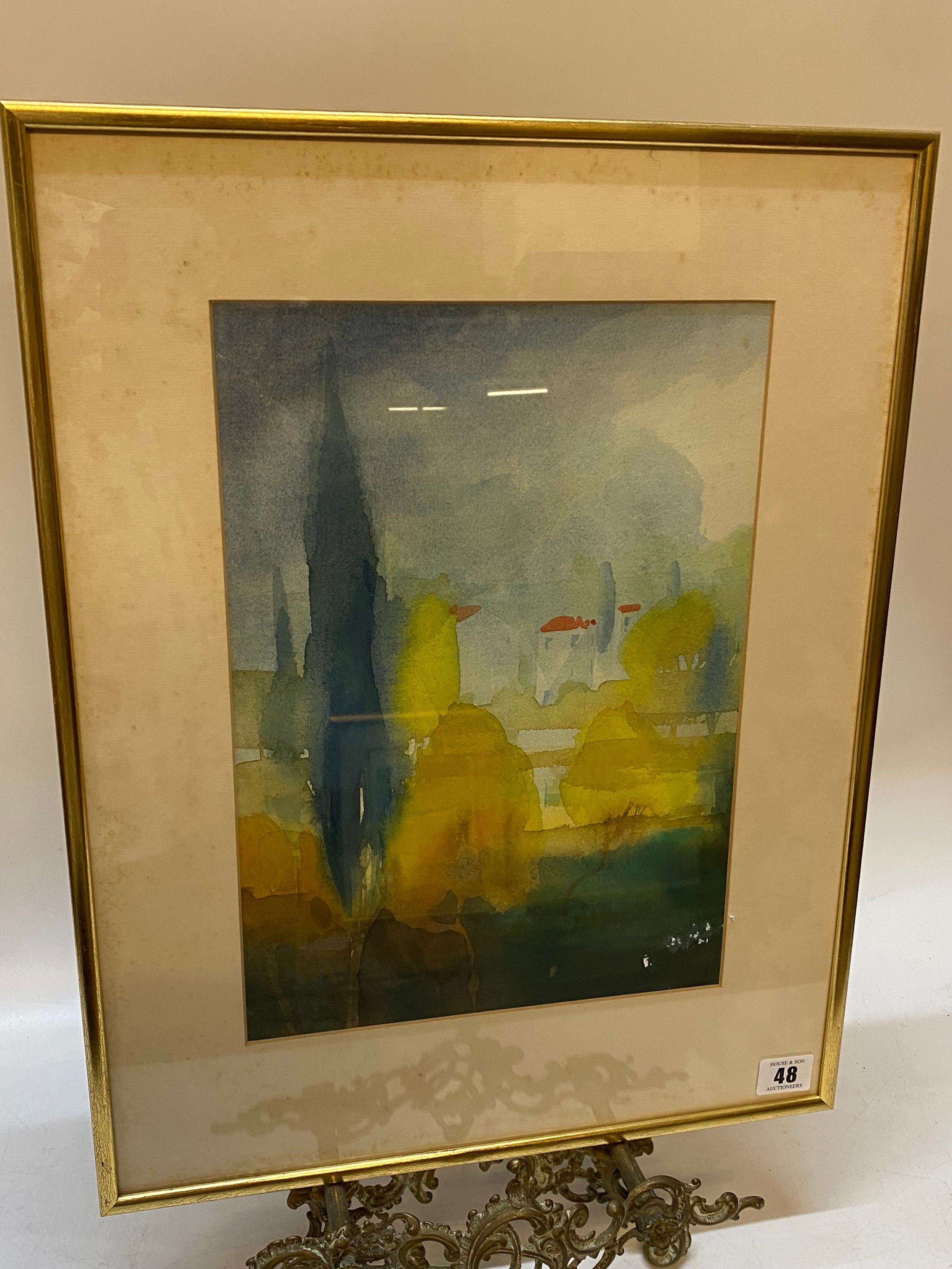 A signed watercolour - Continental scene with trees and red roofs, mounted, framed and glazed - 13 1/2in. x 9 1/2in