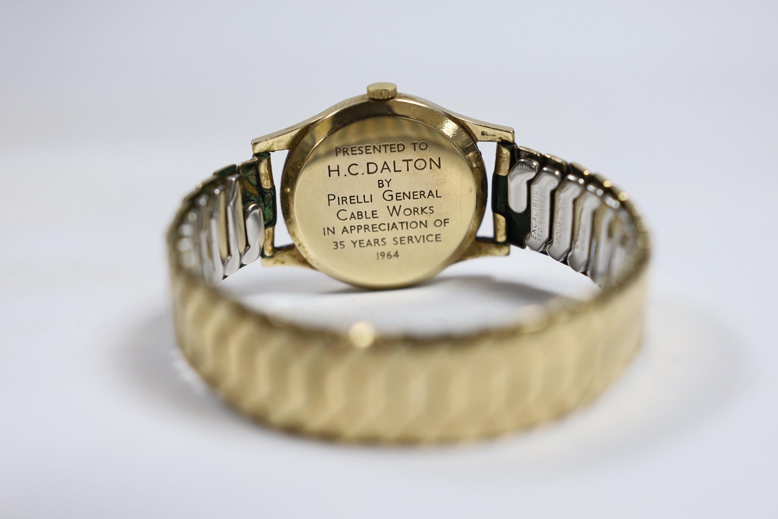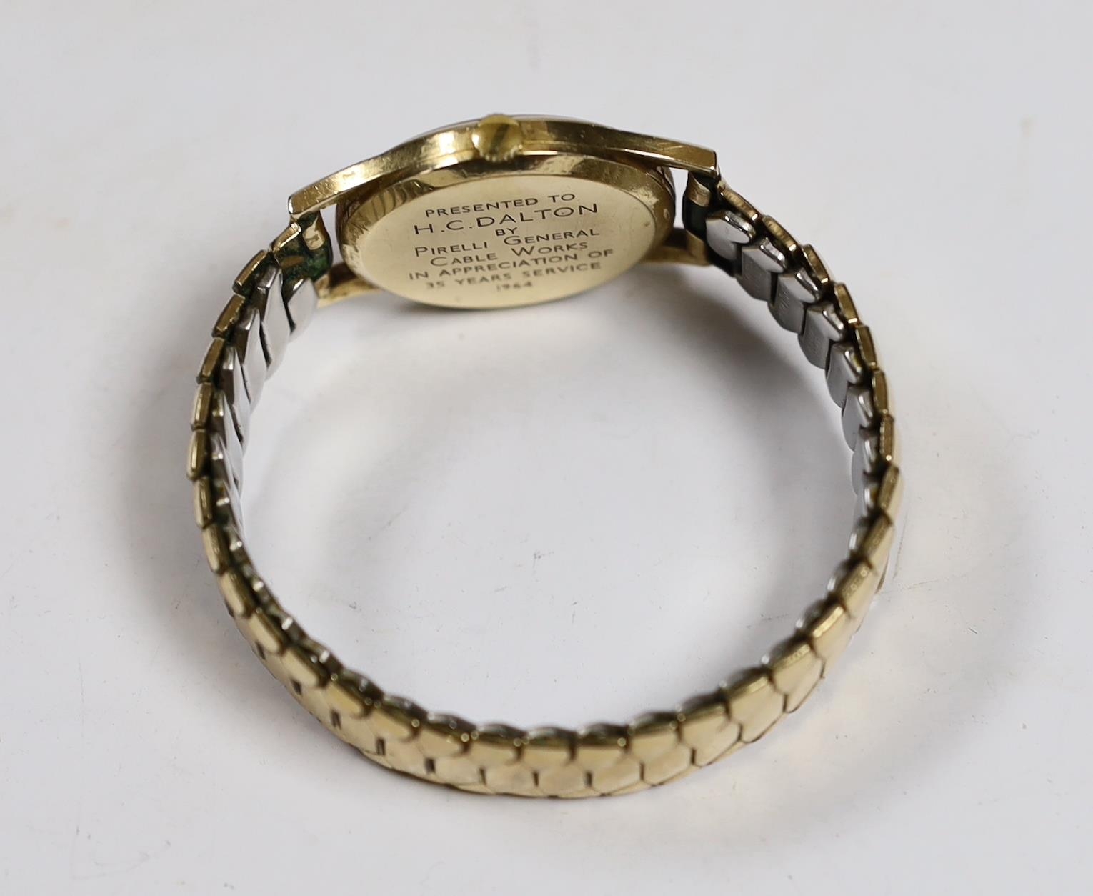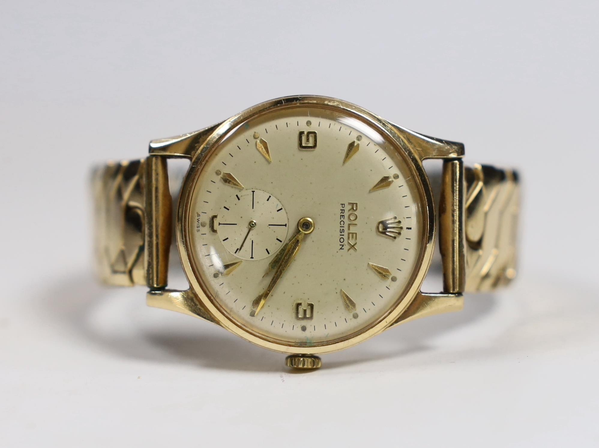 A gentleman's 1960's 9ct gold Rolex Precision manual wind wrist watch, with case back inscription, on associated flexible strap, case diameter 32mm.