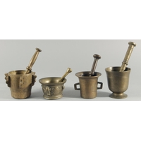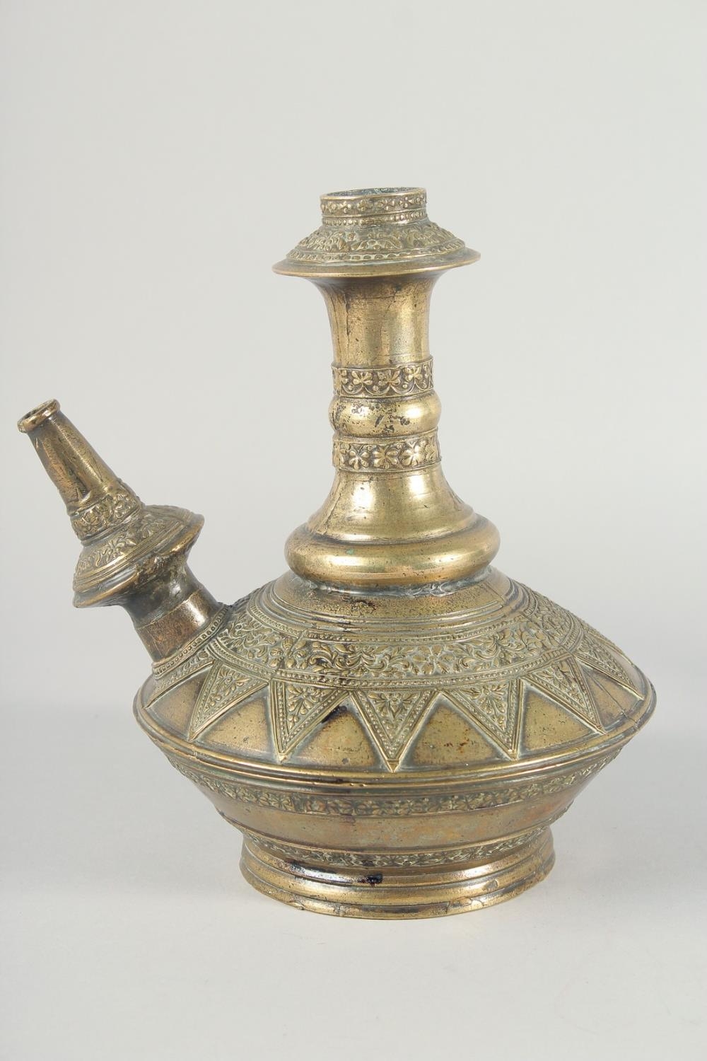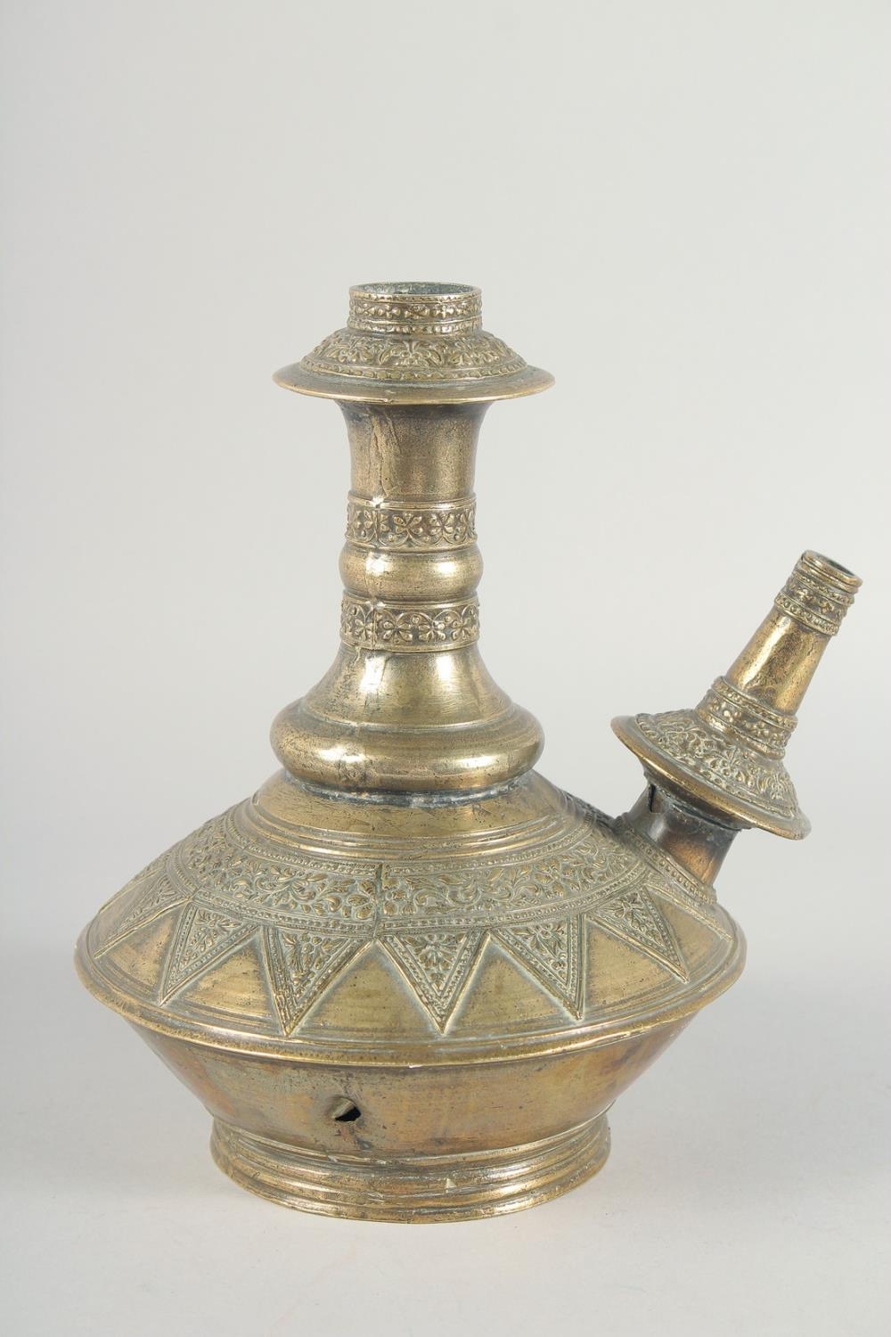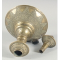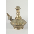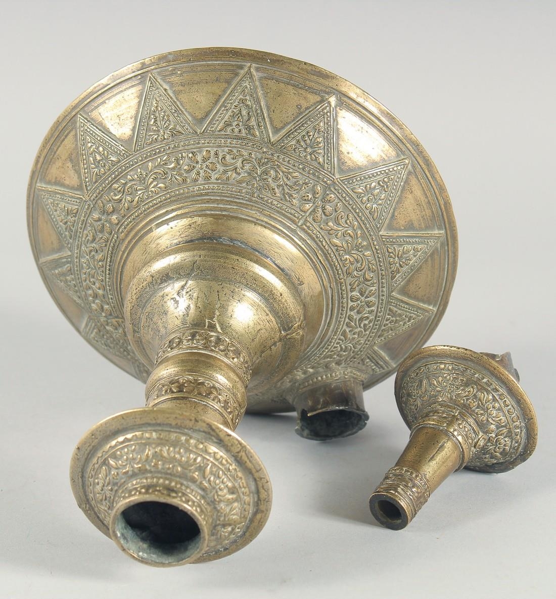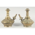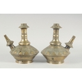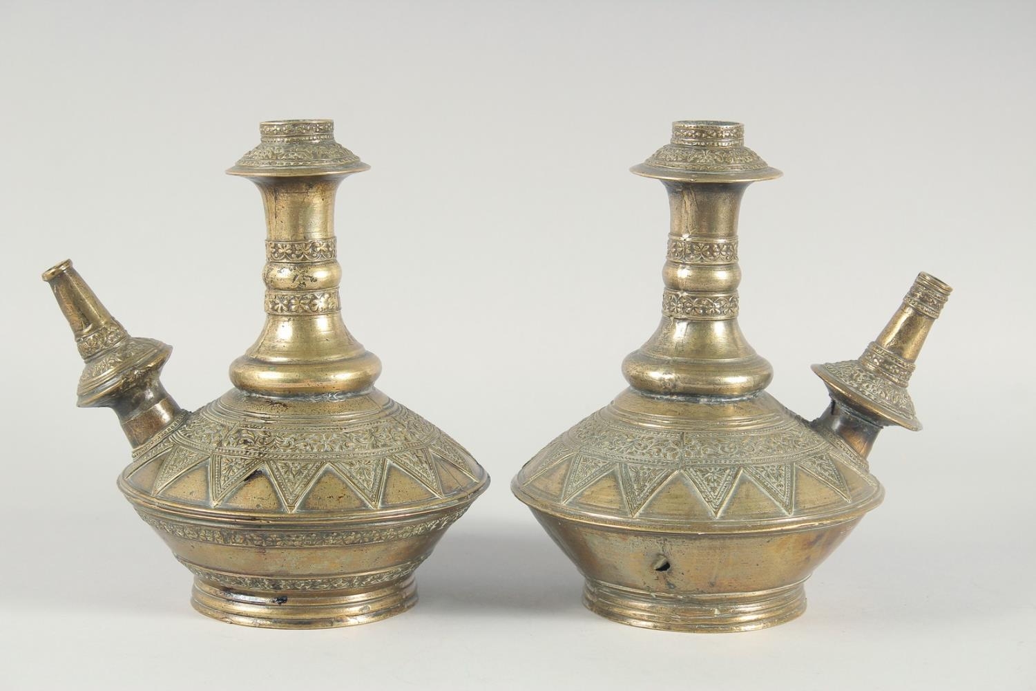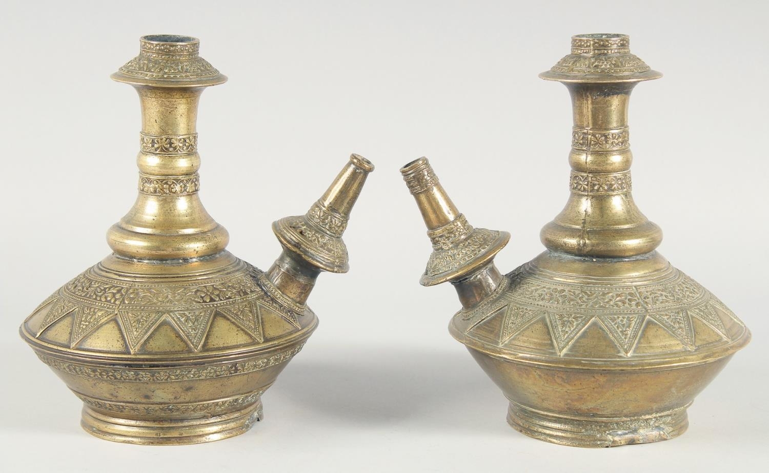 A PAIR OF EARLY ISLAMIC BRASS HUQQA BASES, with bands of foliate decoration, 25cm high.