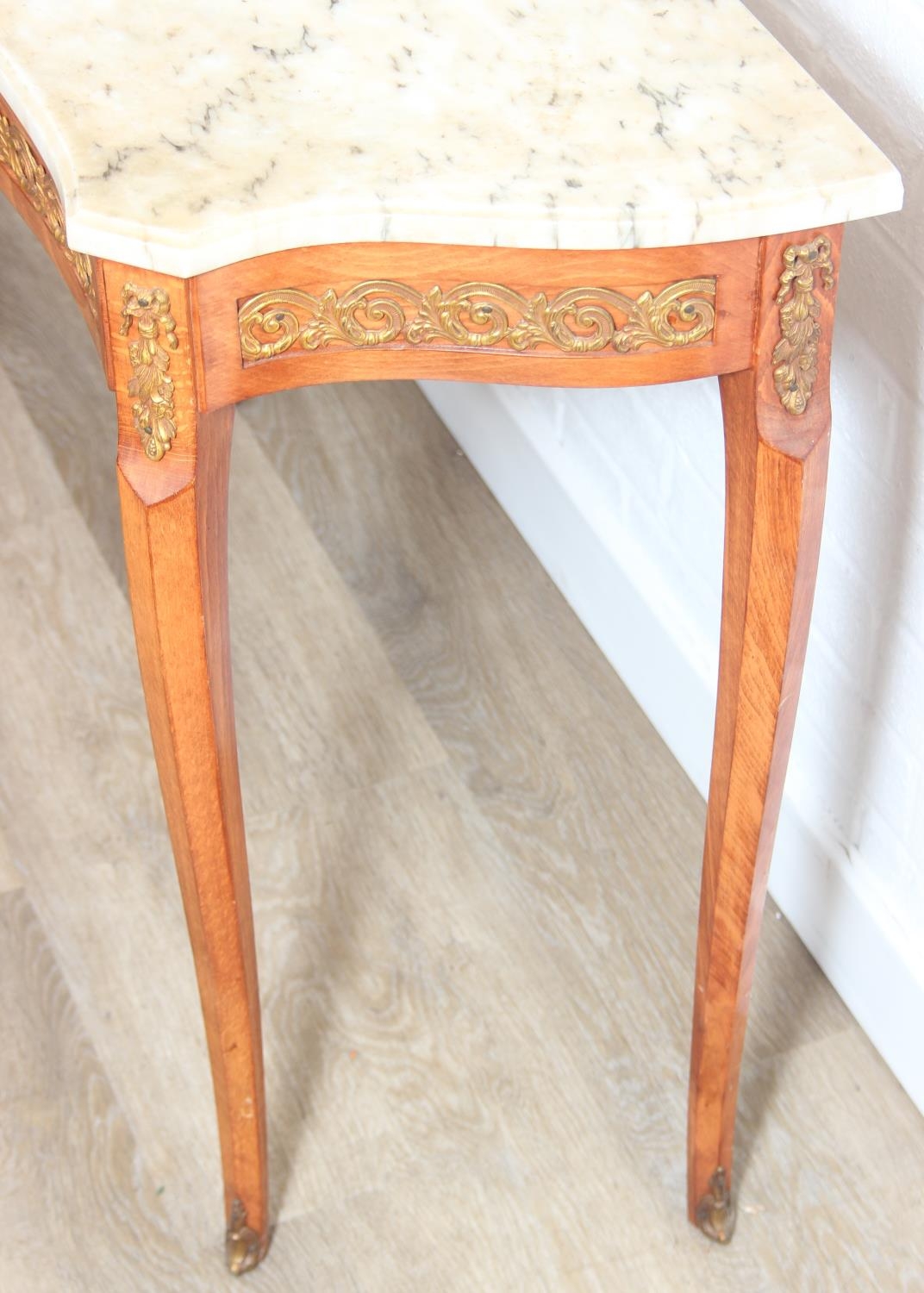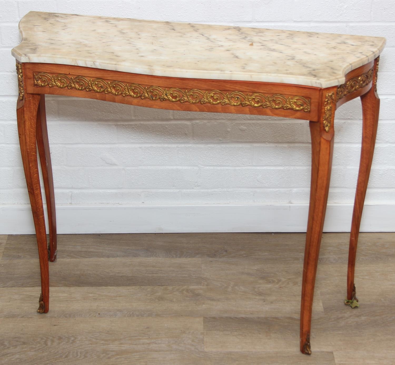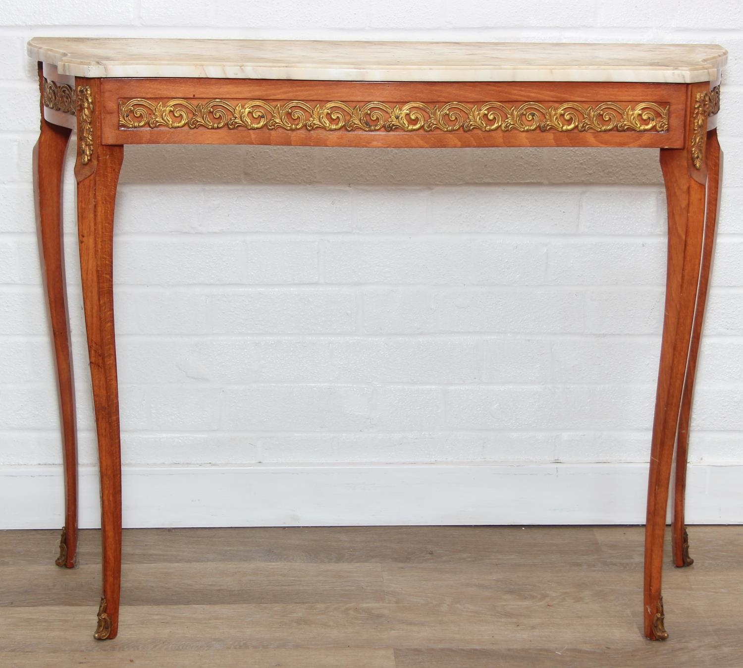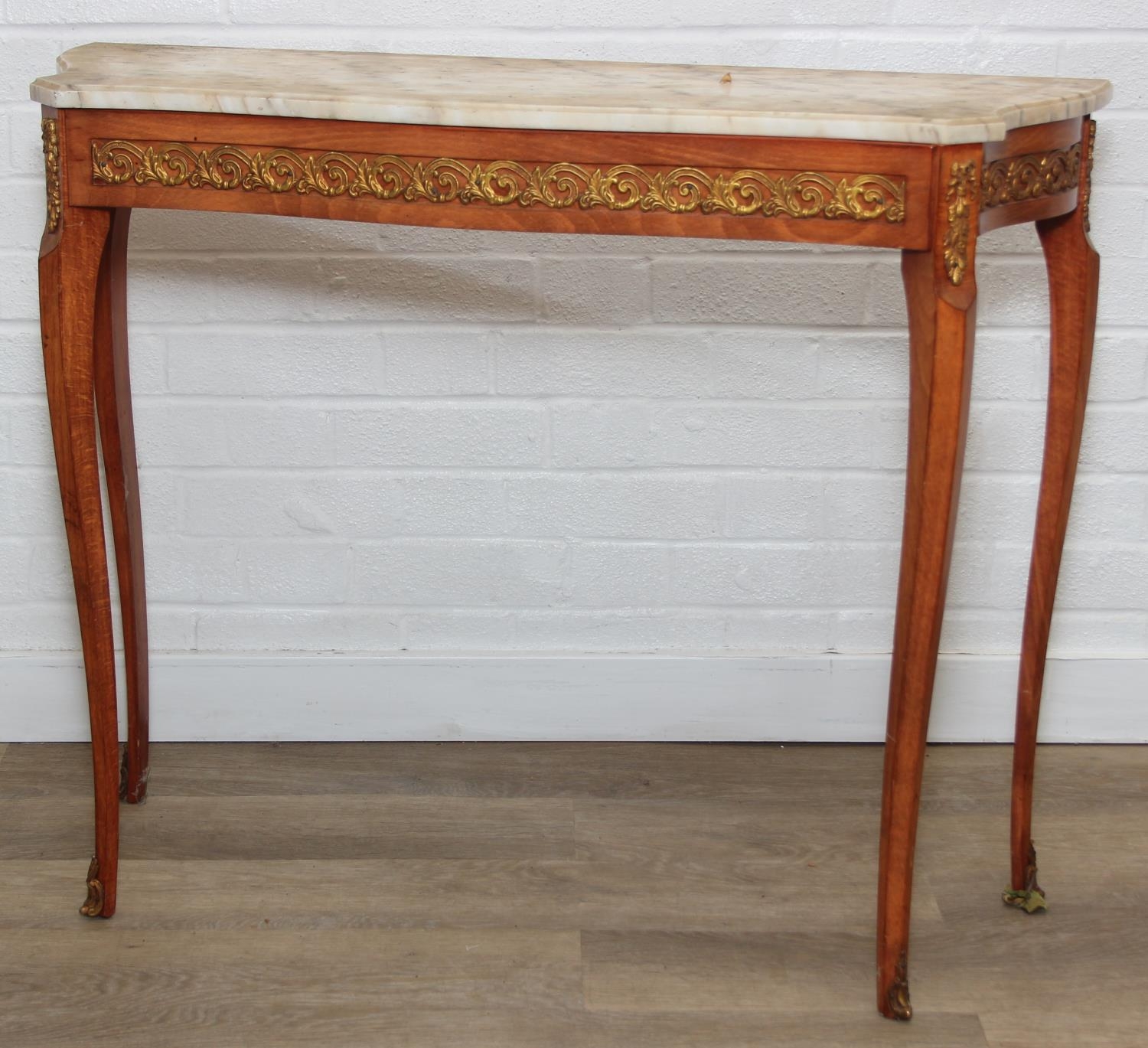 An antique French marble-top console or side table, likely in the, Louis XV or Rococo style, believed to be king-wood with attached gilt brass mounts, 93cm x 36cm x 78cm