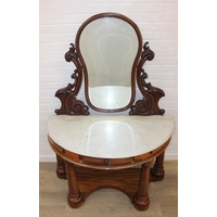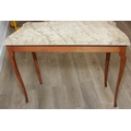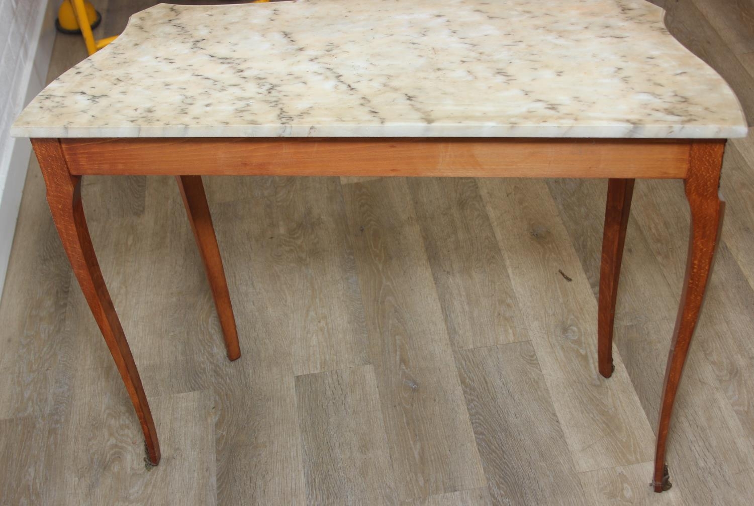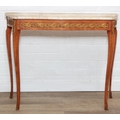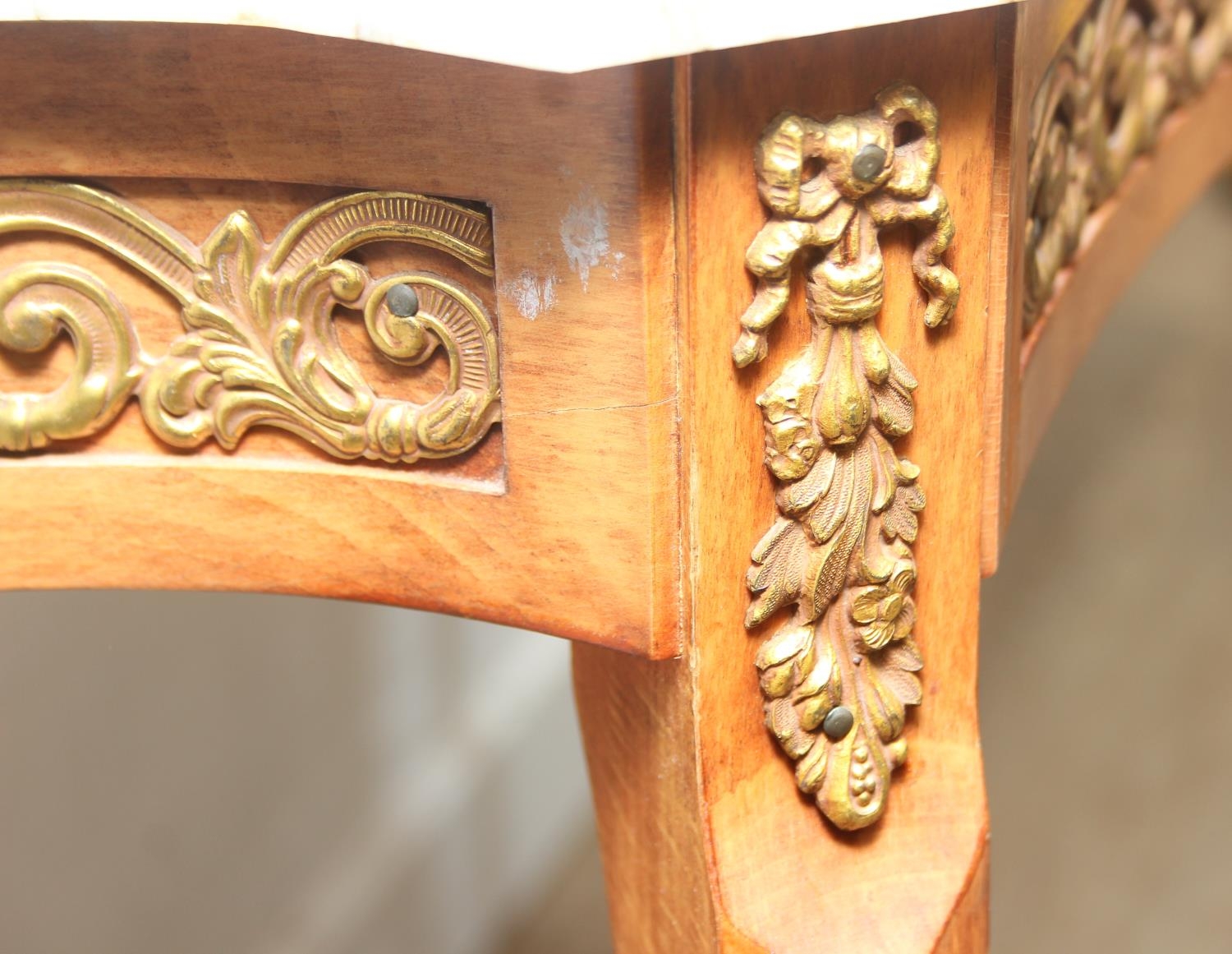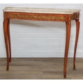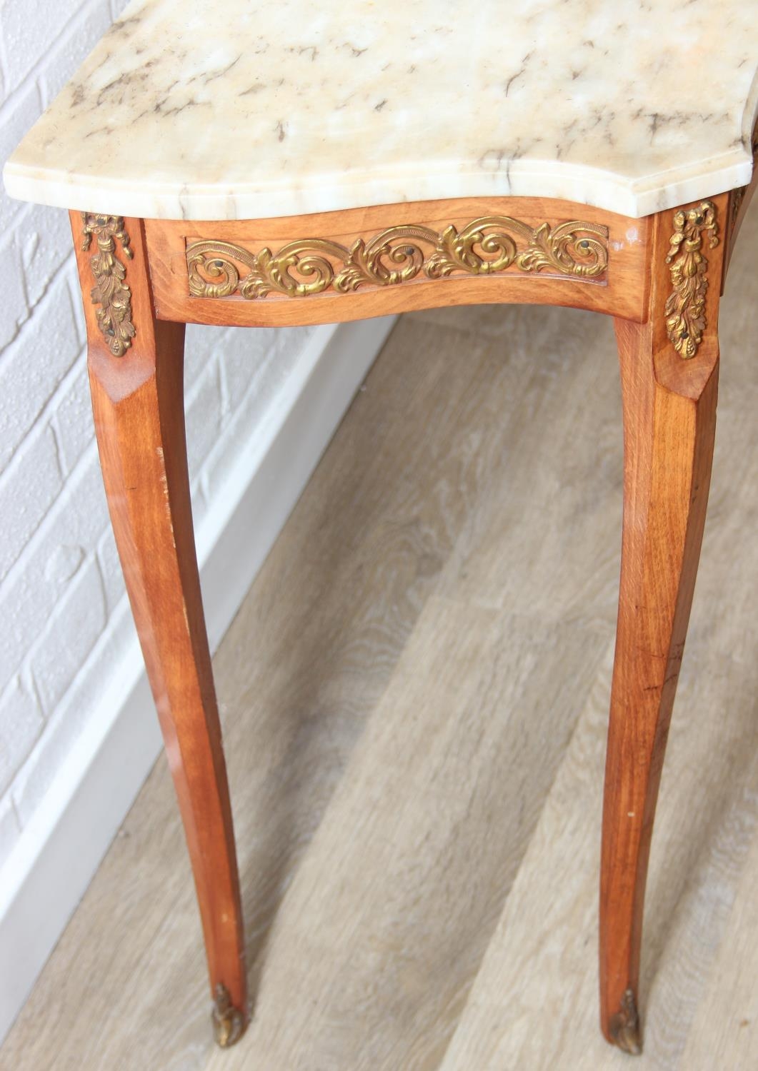 An antique French marble-top console or side table, likely in the, Louis XV or Rococo style, believed to be king-wood with attached gilt brass mounts, 93cm x 36cm x 78cm