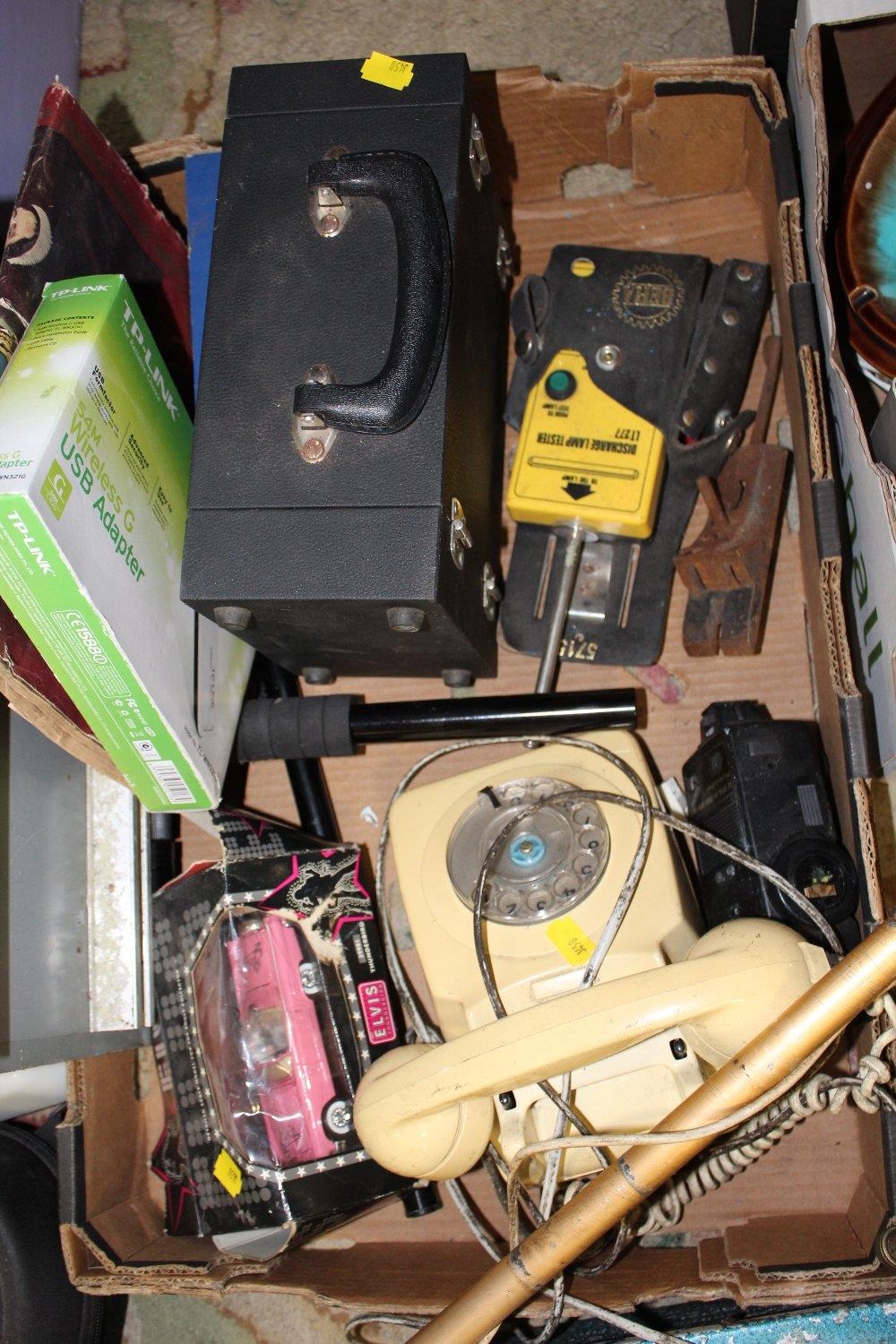 A BOX OF ASSORTED COLLECTABLES TO INCLUDE A VINTAGE TELEPHONE, METAL DETECTOR, CASE OF CHILDRENS DOOR NAME LETTERS ETC.