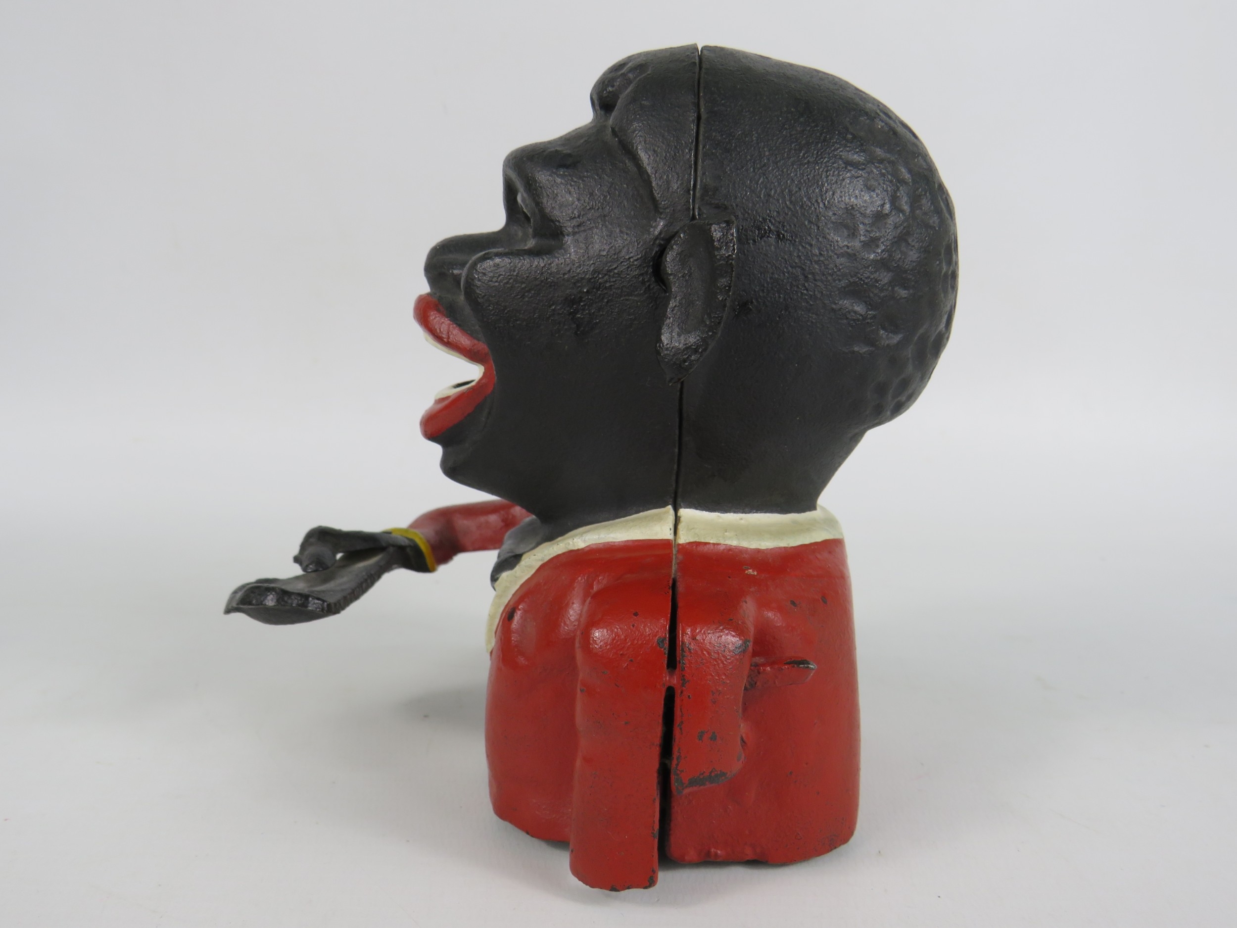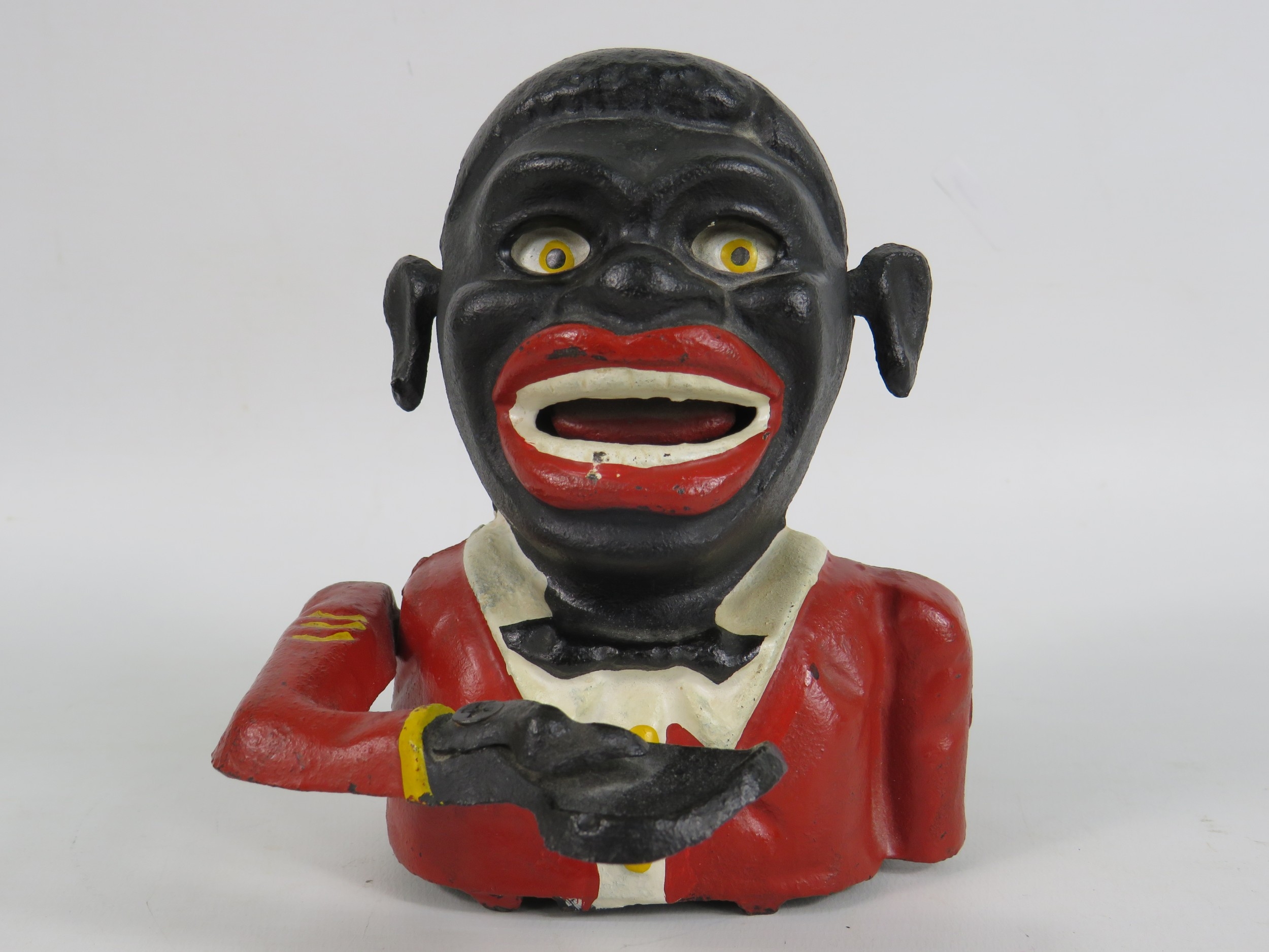Cast iron Jolly Man mechanical money box - 14cm tall