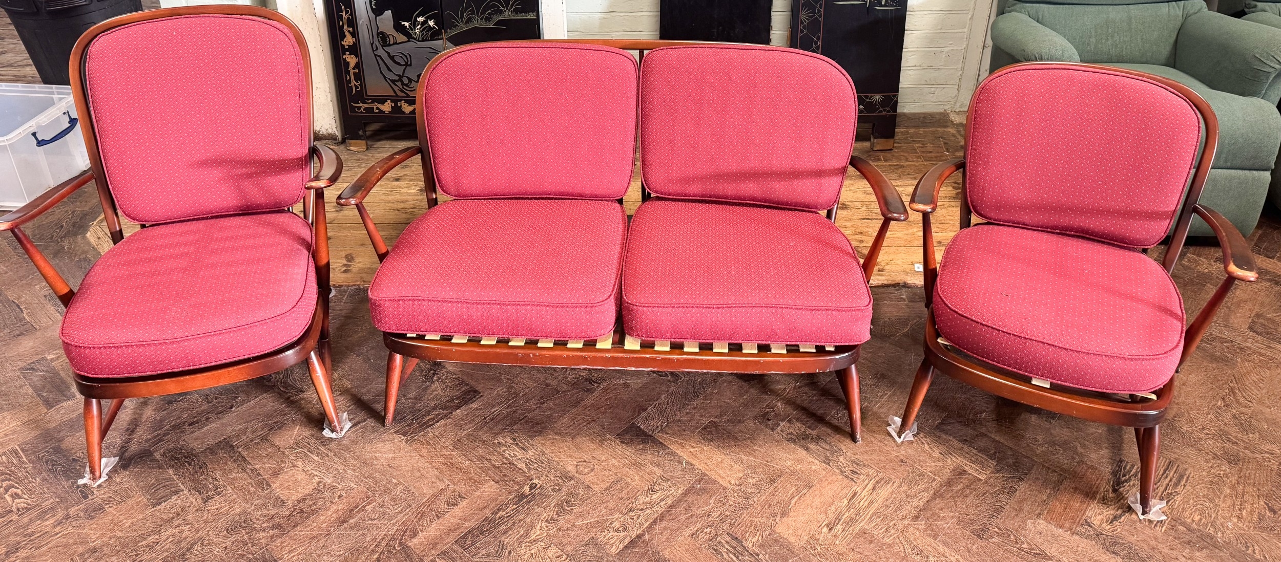 An Ercol vintage three piece lounge suite in the Windsor style with original burgundy cushions