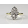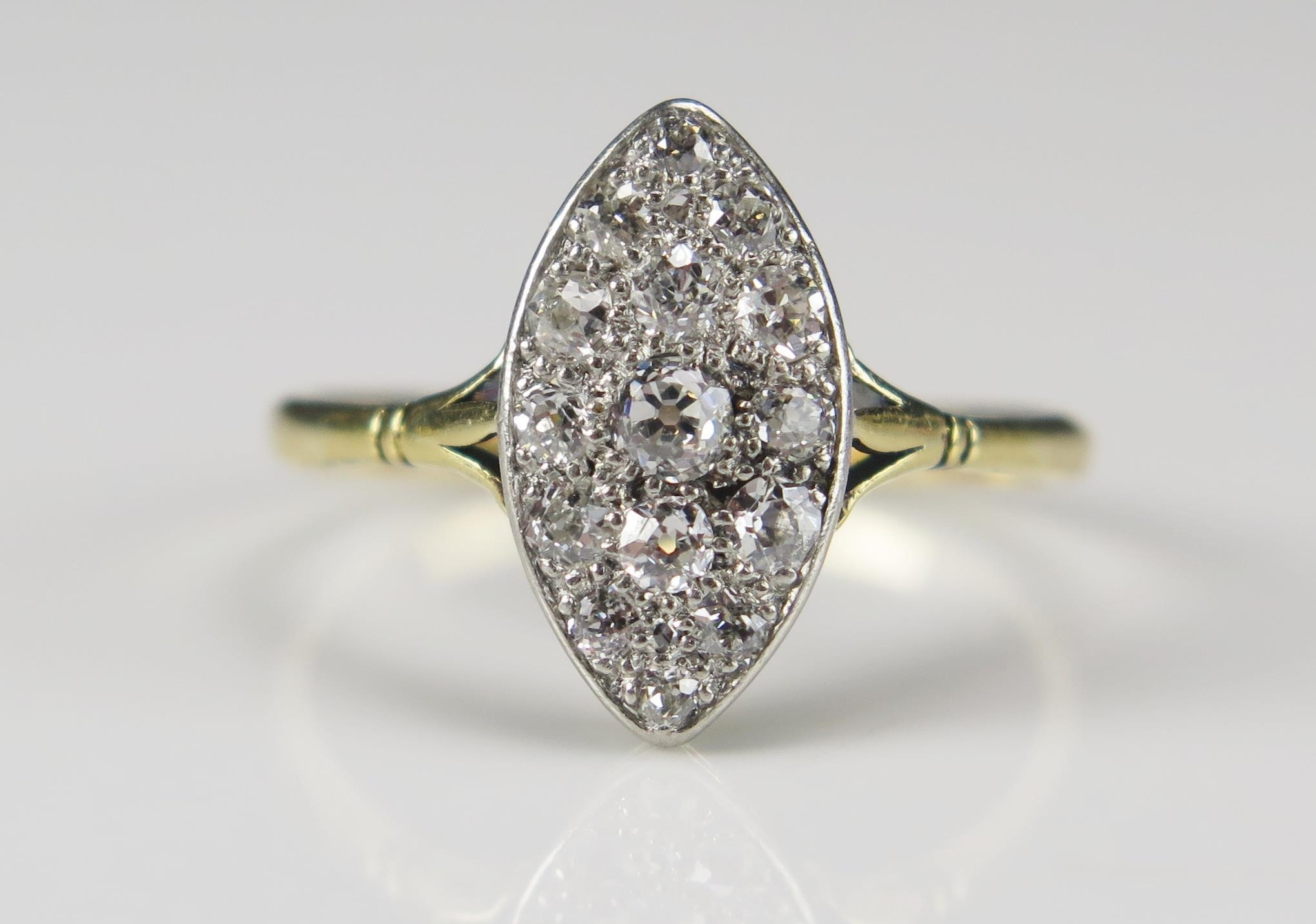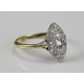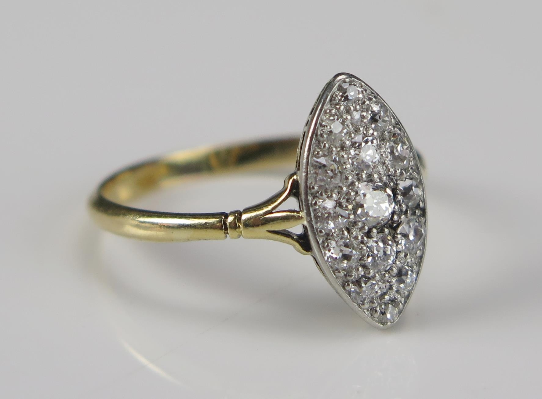 An 18ct Gold and Old Cut Diamond Platinum Set Marquis Ring, c. 15.2x8.3mm head, size R, 2.72g