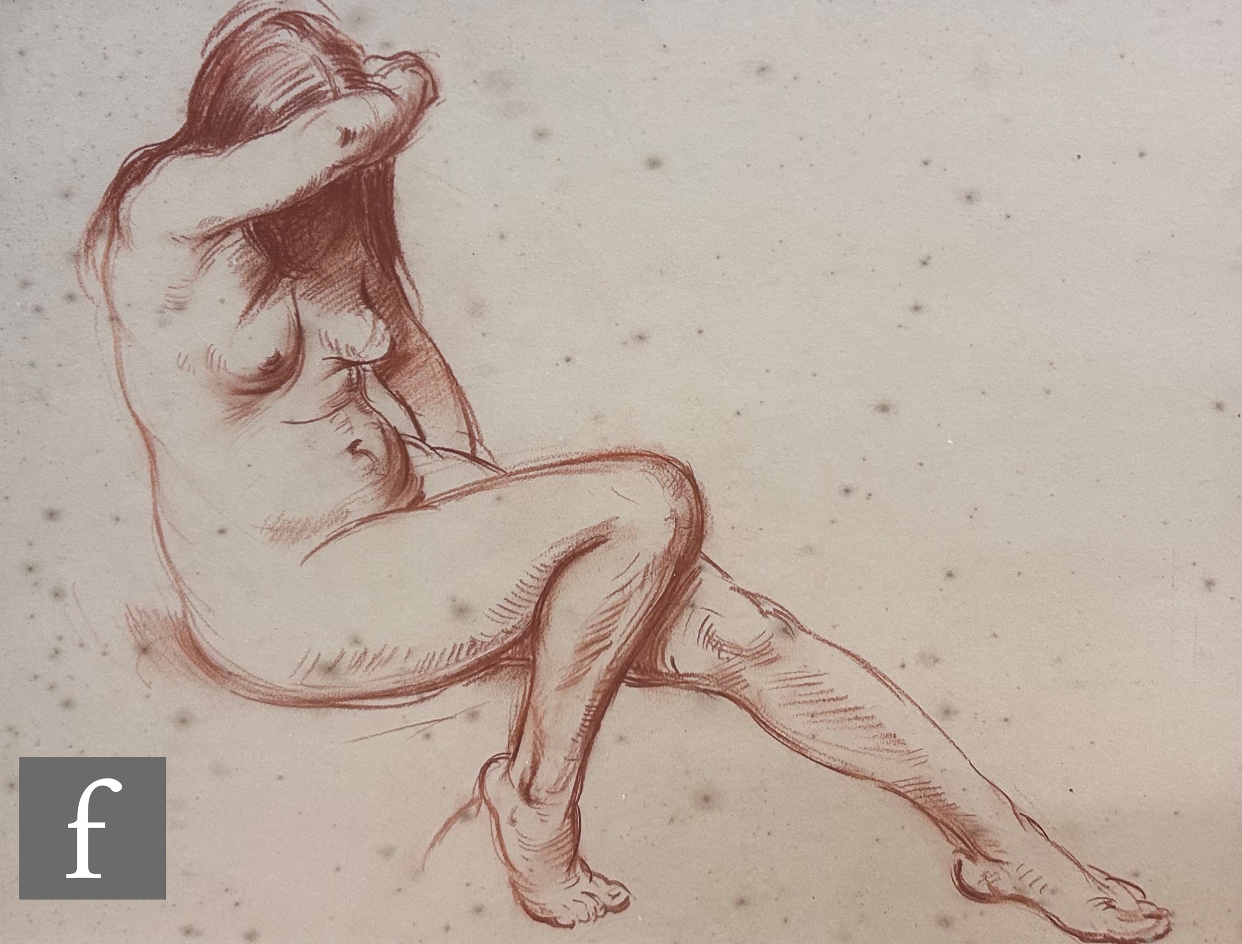 John Edwards R.A. (1940-2020) - Portrait of a female nude model with arm raised, sanguine, signed, framed, 35cm x 45cm, frame size 56cm x 65cm, also four other pencil figure studies by the same hand. (5)