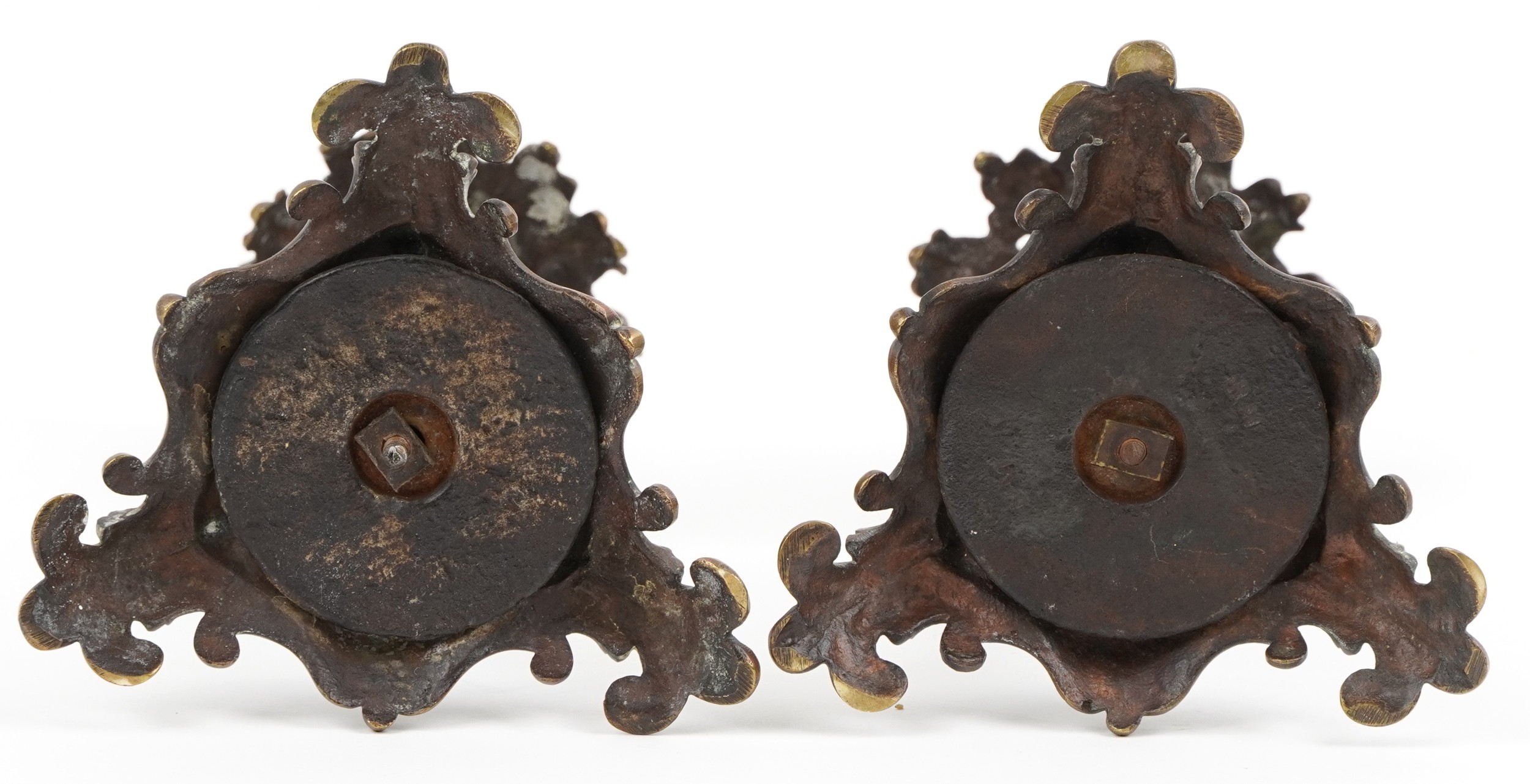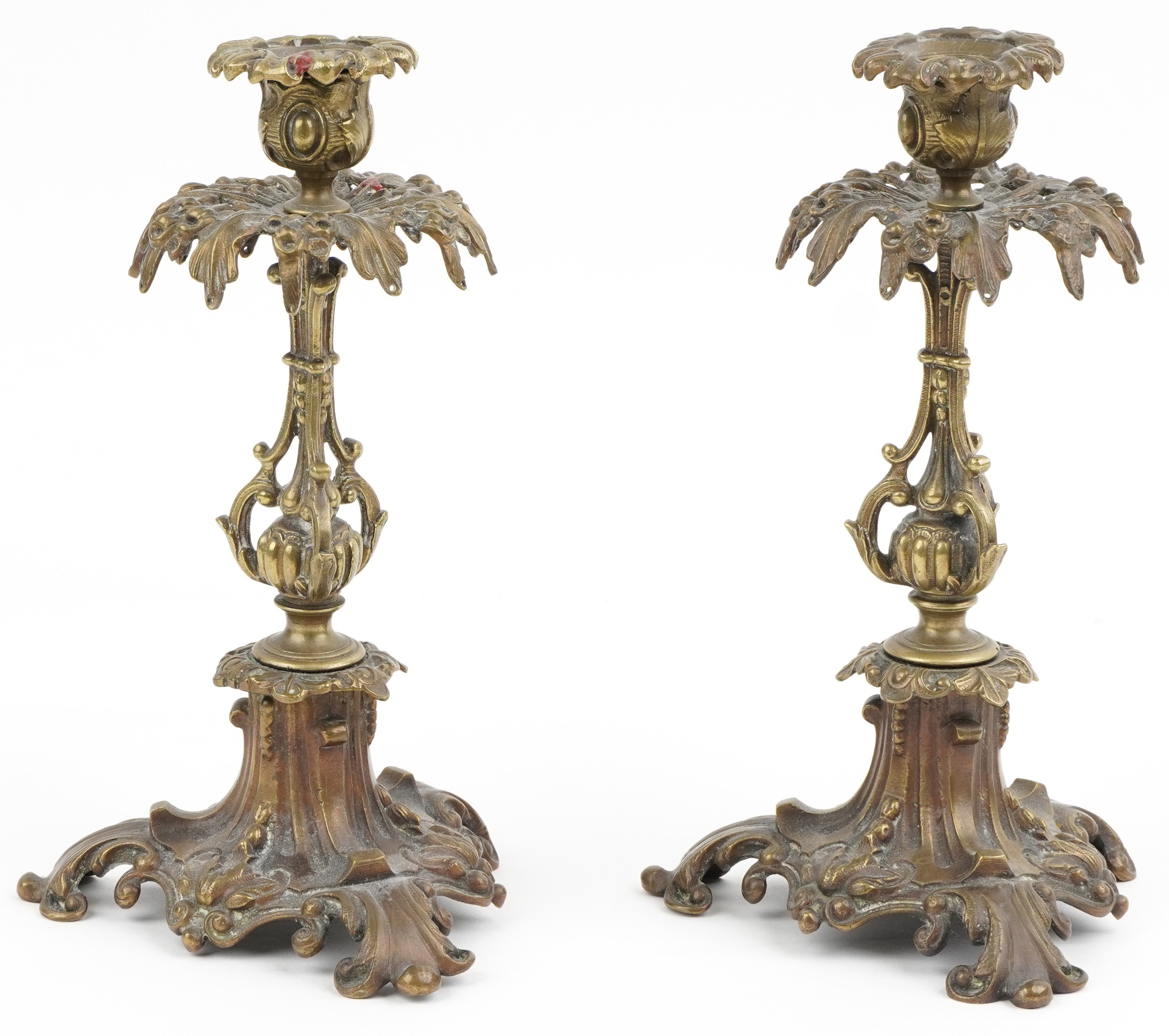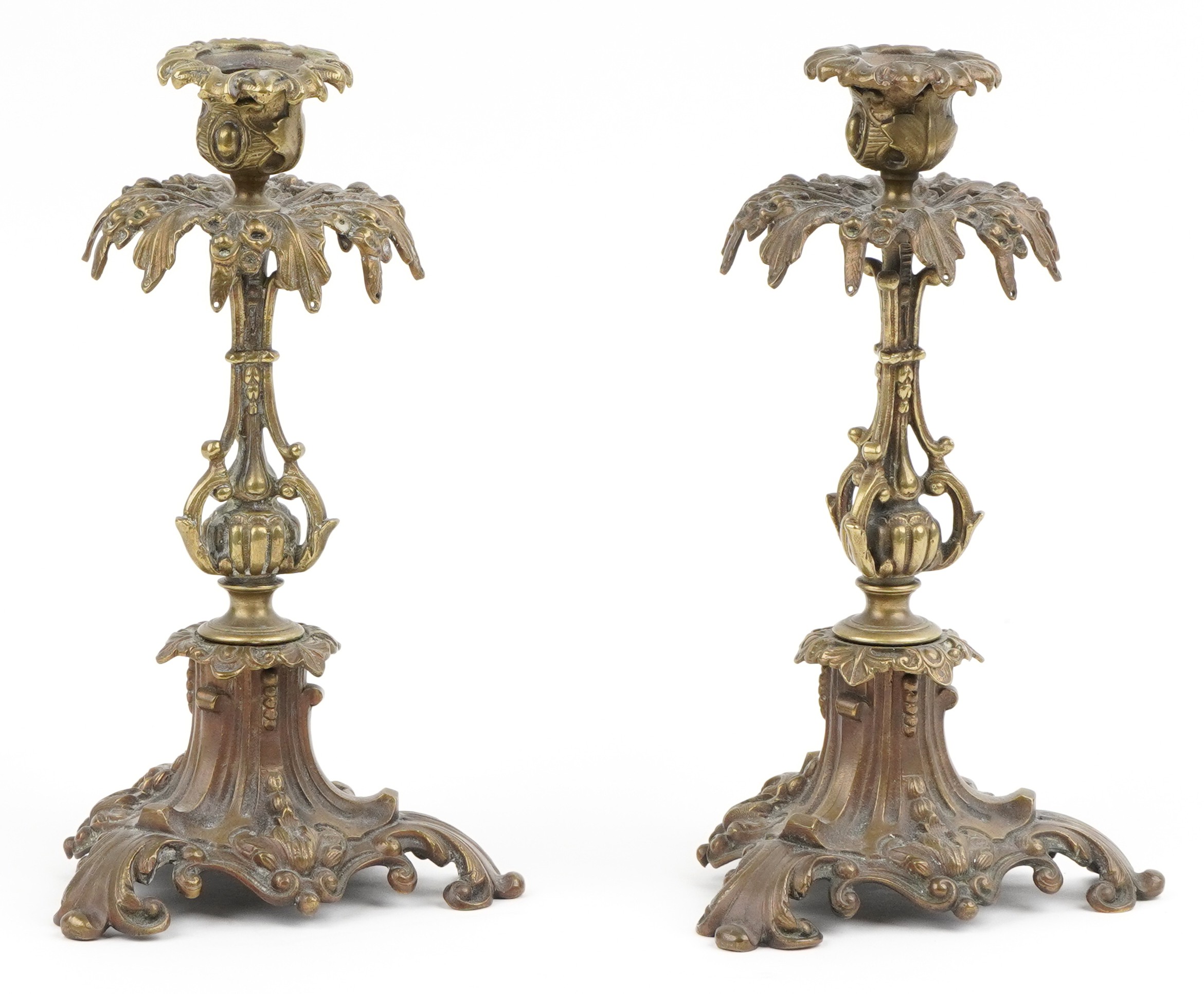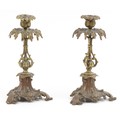 A pair of Victorian ormolu acanthus leaf candlesticks, on scroll bases, 24cm high.