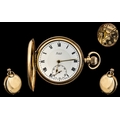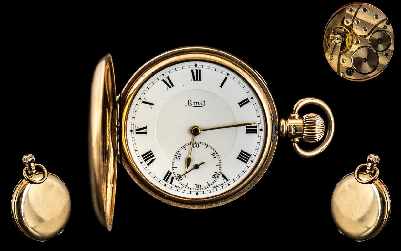 Limit - 9ct Gold Key-less Full Hunter Pocket Watch. Hallmark Birmingham 1945, Signed to Dial and Movement. Features White Porcelain Dial, Secondary Dial, Case & Dial In Excellent Condition and Working at time of Cataloging. Weight 94 grams.