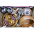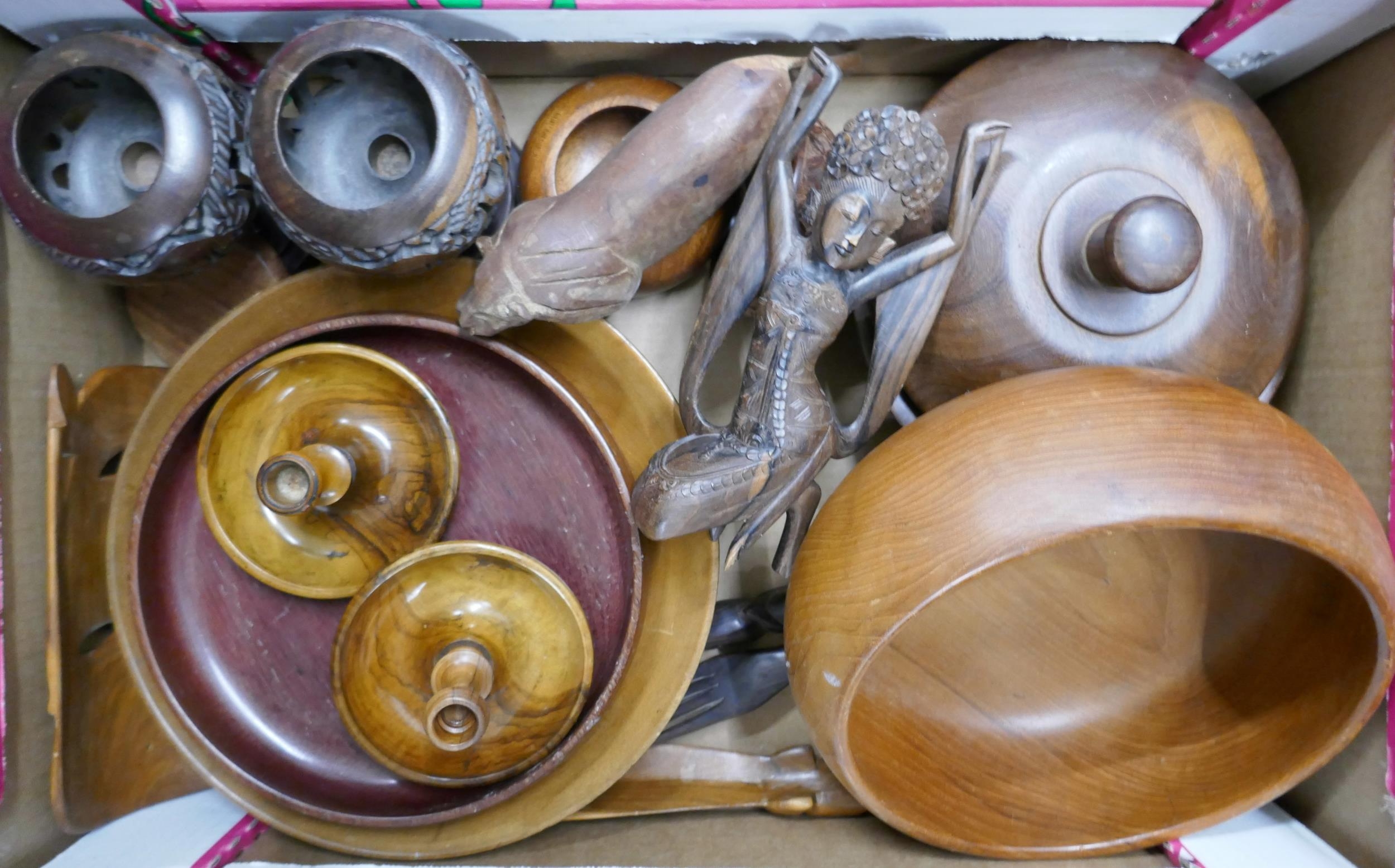Collection of wooden items to include candlesticks, bowls, African carved figures, mask, etc. *Not available for packing and posting*