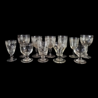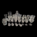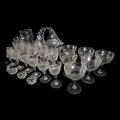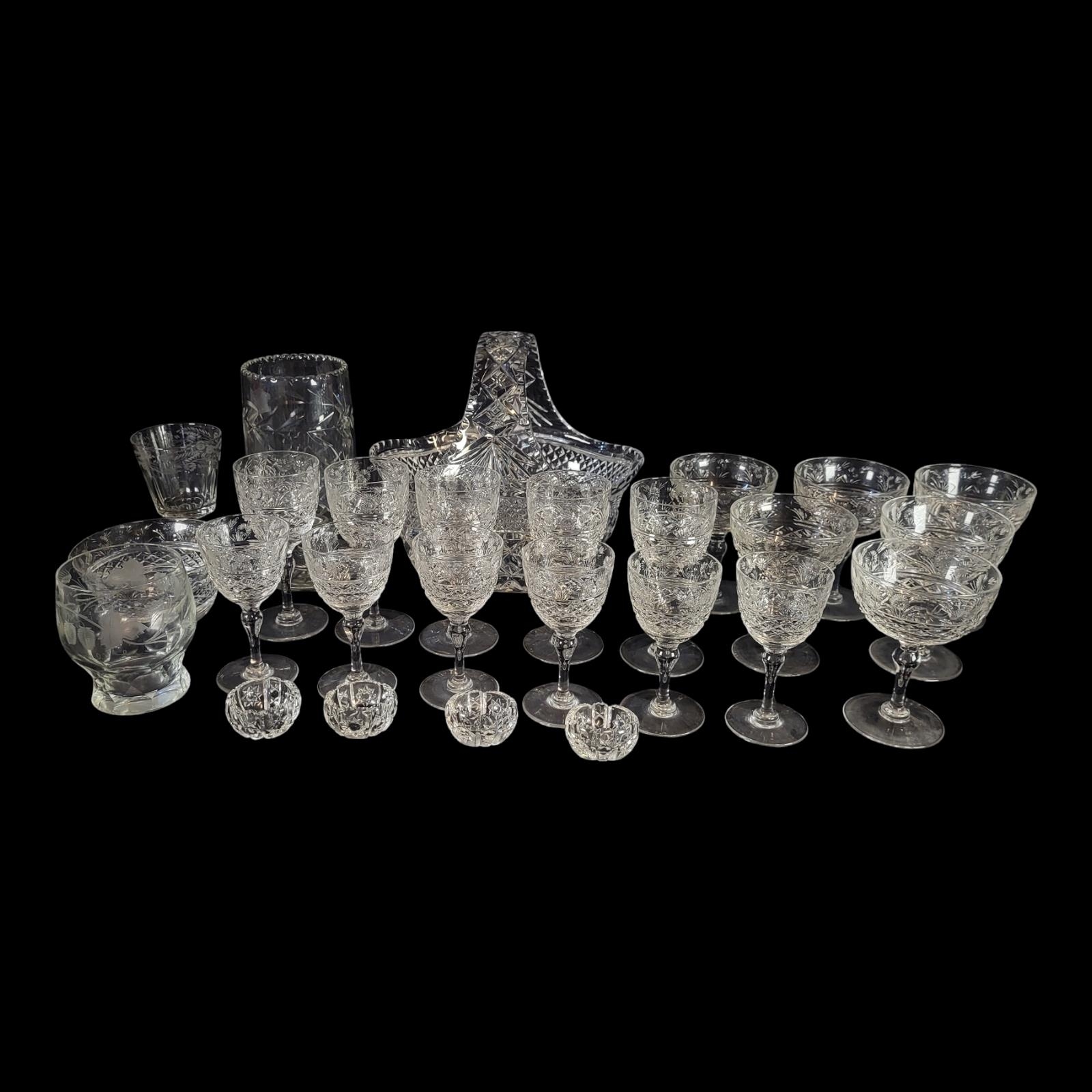 Comprising a sweetmeat basket, six champagne flutes, six sherry glasses, five white wine glasses.
