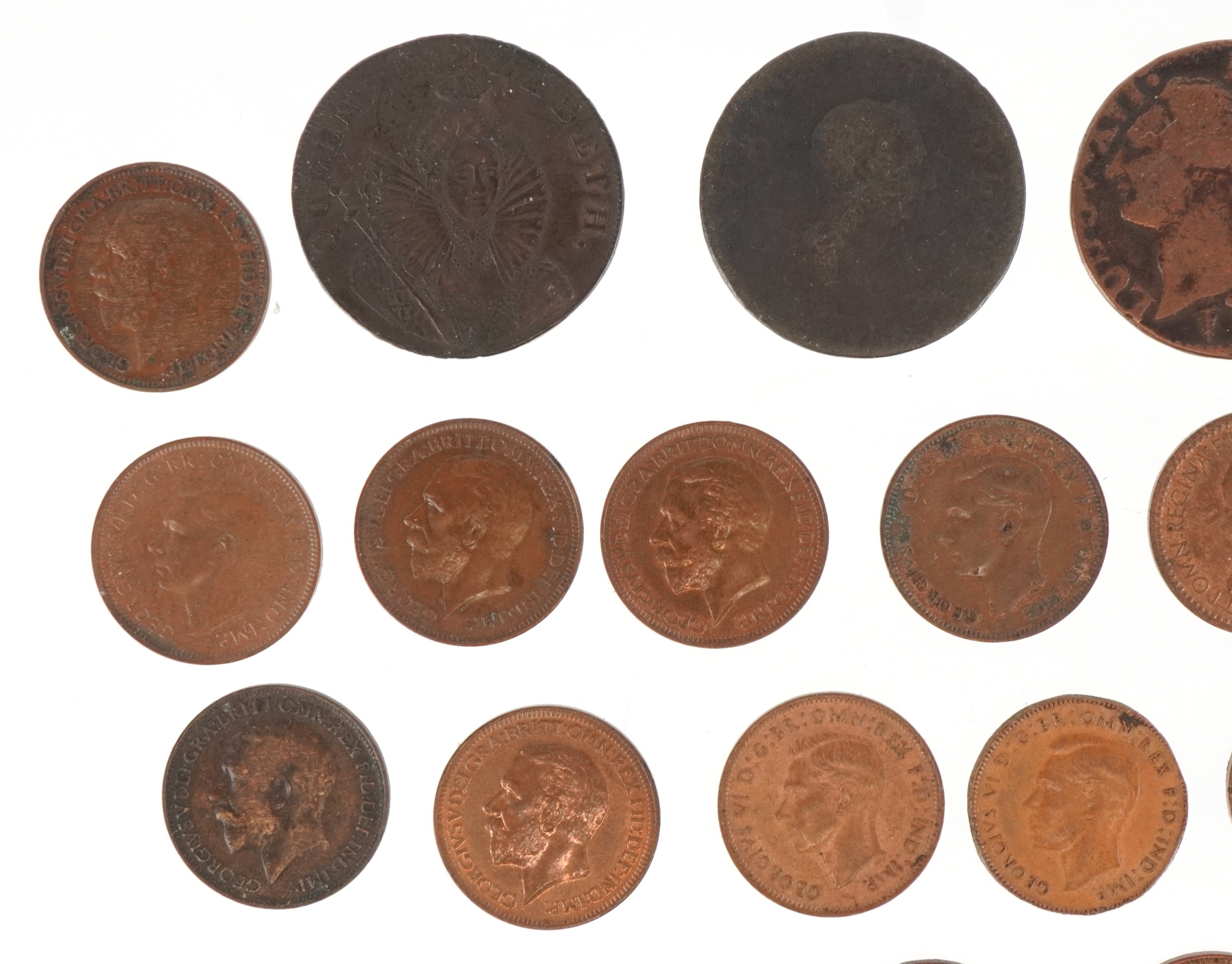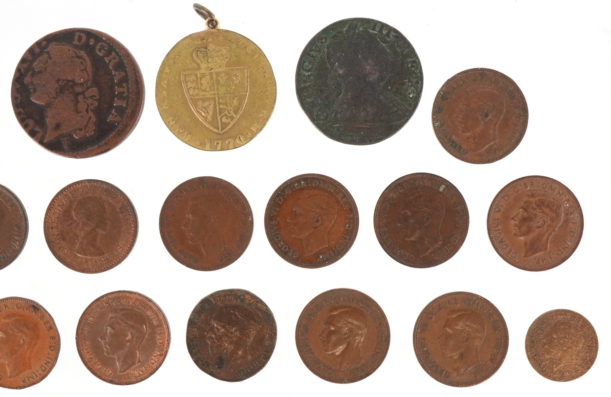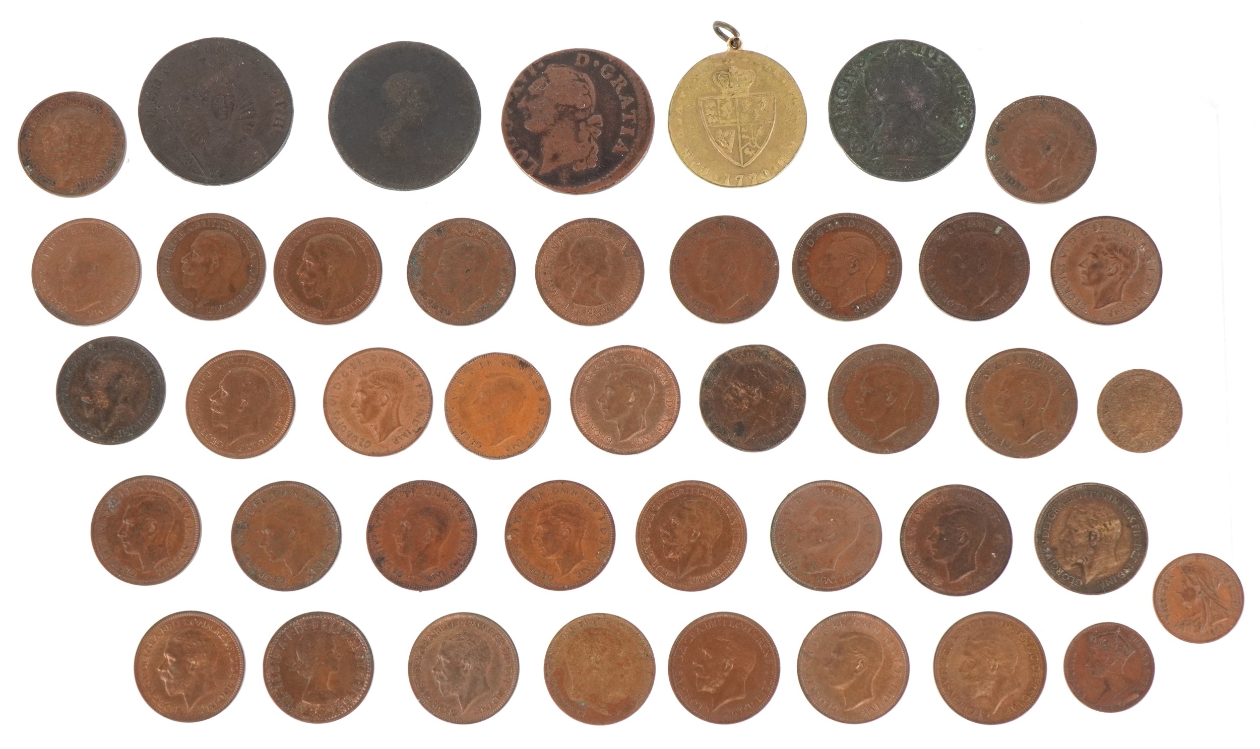 18th century and later British copper coins and tokens including a 1794 Chichester halfpenny in extremely fine condition, a George III 1775 half penny, a French Louis XVI copper coin dated 1789, a George V 1/3 farthing dated 1913, two Victorian copper Jubilee model tokens basically half farthings, one dated 1897, a small quantity of Edwardian and later British farthings and a George III 1770 gaming token.