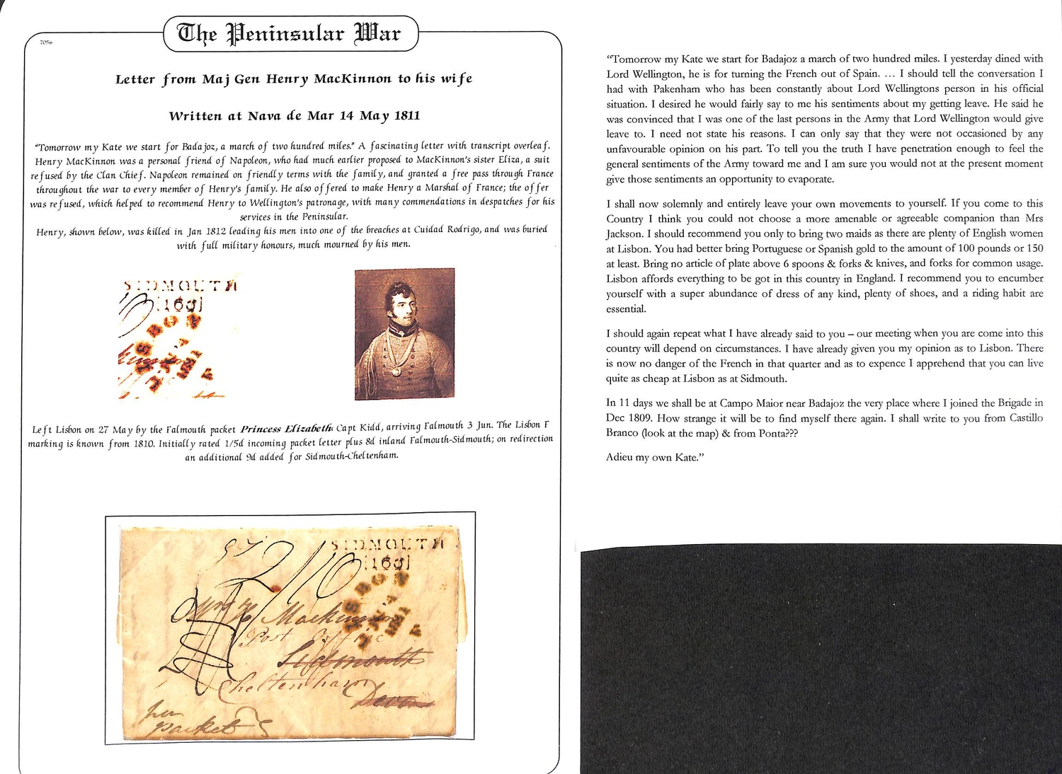 1811 (May 14) Entire letter from General MacKinnon at Nova de Mar to his wife in Sidmouth with "LISBON / F" packet datestamp of Falmouth in green, a Sidmouth mileage mark applied upon redirection to Cheltenham. MacKinnon s letter includes "Tomorrow we start for Badajoz, a march of two hundred miles. I yesterday dined with Lord Wellington, he is for turning the French out of Spain ..... I shall tell you the conversation I had with Pakenham who has been constantly about Lord Wellingtons person in his official situation .... In 11 days we shall be at Campo Maier near Badajoz, that very place where I joined the Brigade in Dec. 1809". General MacKinnon was killed at Ciudad Rodrigo in January 1812. A little splitting at folds, otherwise fine.