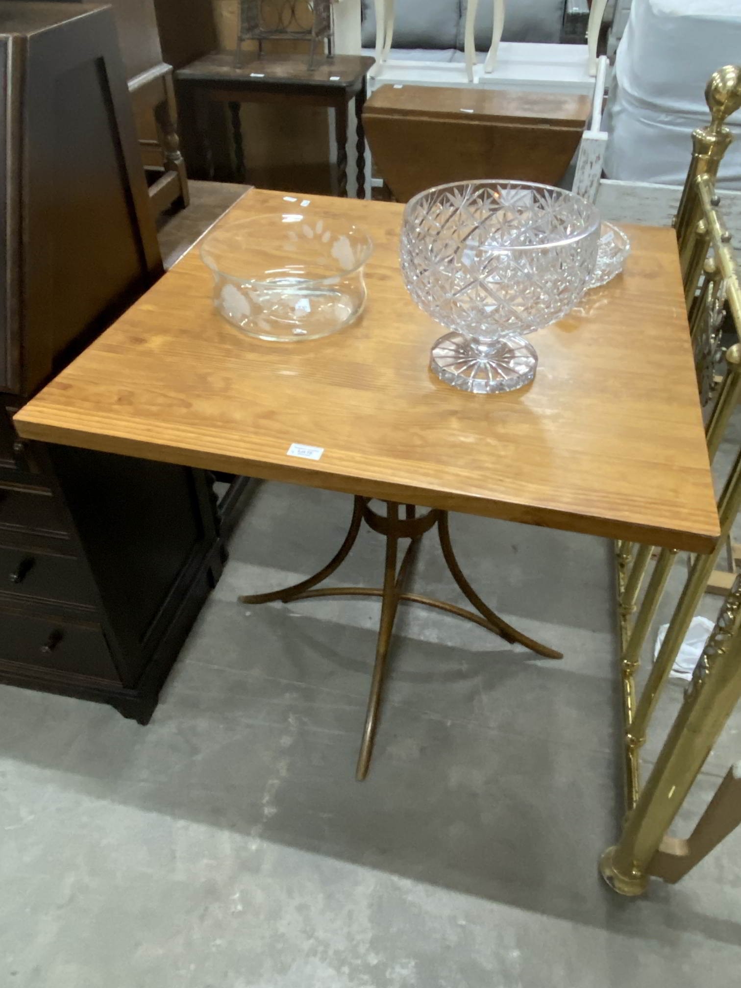 Contemporary pine toped centre table 75H 80W 80D, cut glass fruit bowl, cut glass hors d’oeuvres dish etc