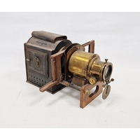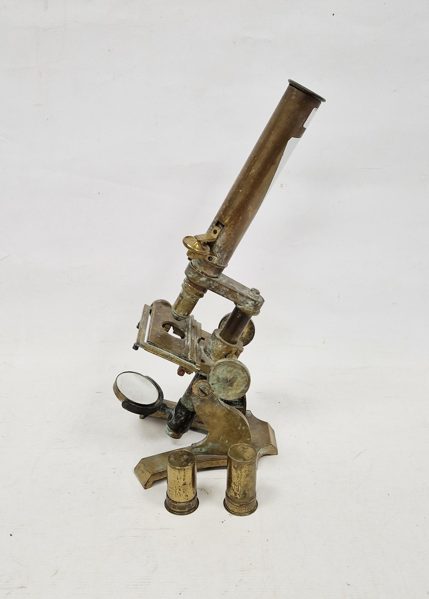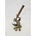 Early 20th century brass microscope, together with two lenses in original canisters, the microscope unmarked