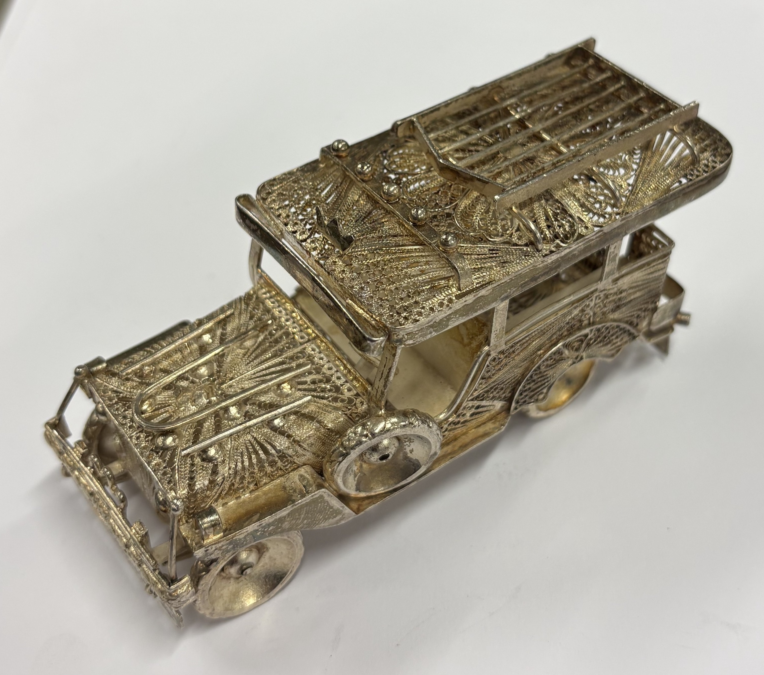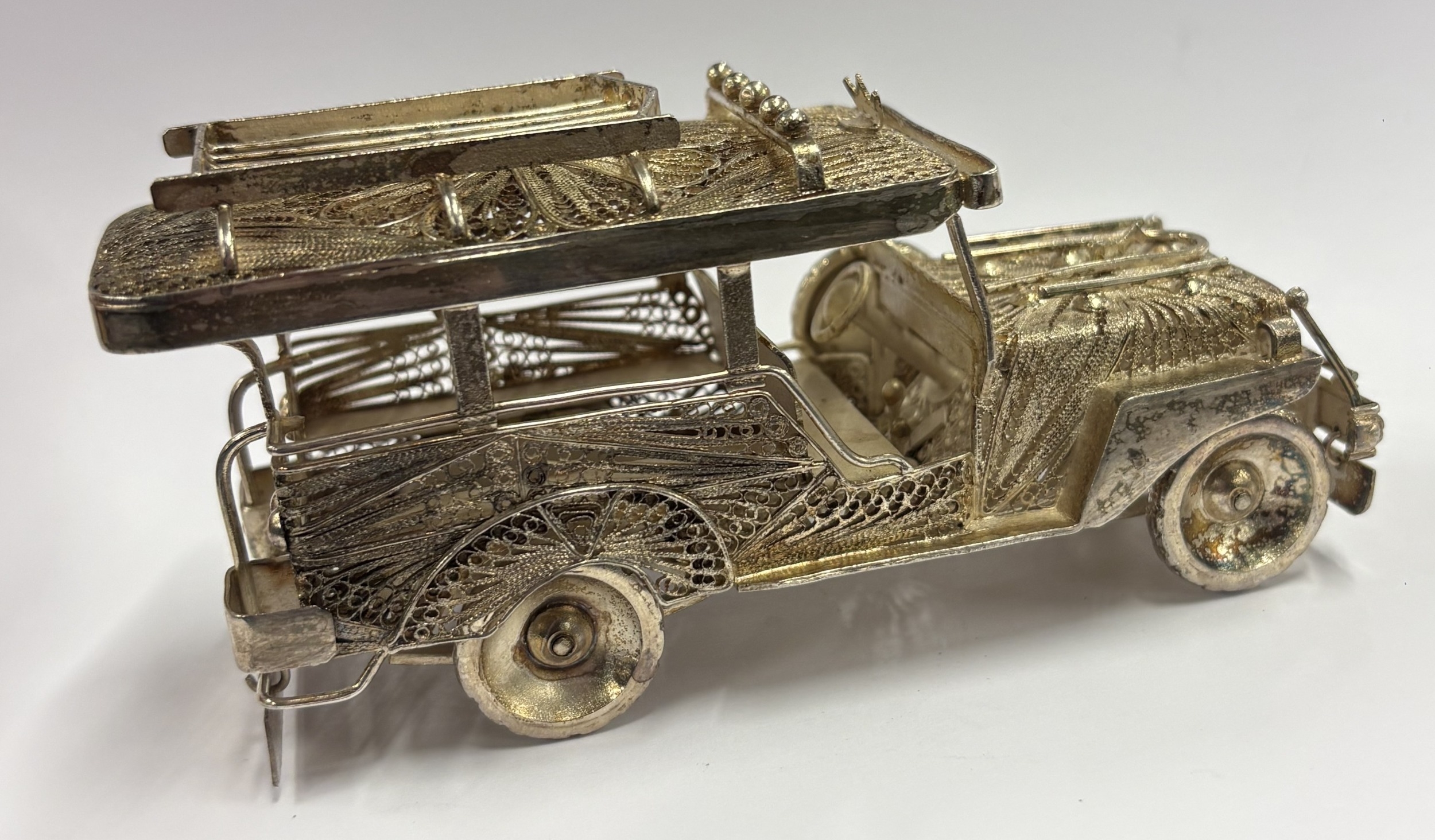 A filigree silver model of a jeep. Circa 1900. Approx. 141 grams. Est. £300 - £400.